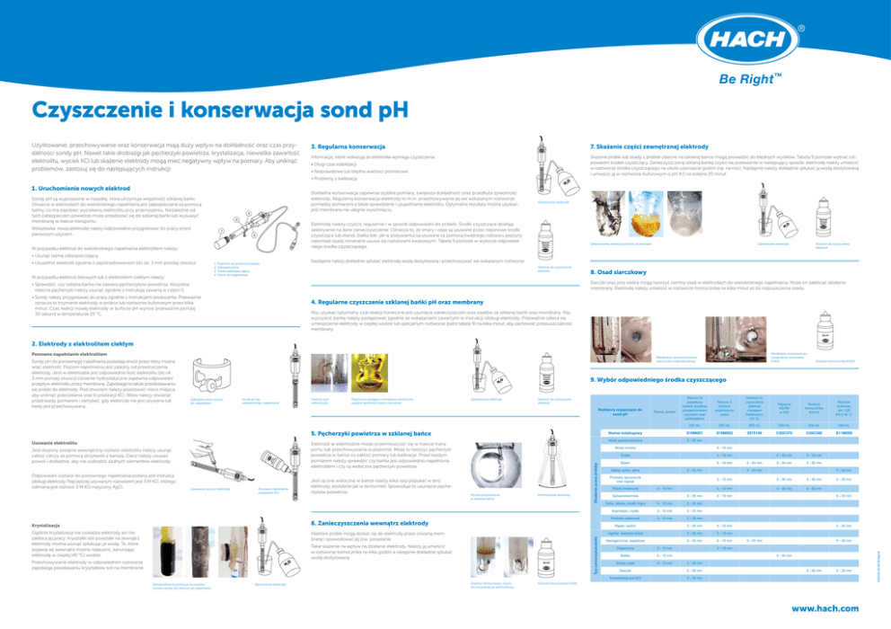 Czyszczenie i konserwacja sond pH Użytkowanie, przechowywanie oraz konserwacja mają duży wpływ na dokładność oraz czas przydatności sondy pH. Nawet takie drobiazgi jak pęcherzyki powietrza, krystalizacja, niewielka zawartość elektrolitu, wyciek KCl lub skażenie elektrody mogą mieć negatywny wpływ na pomiary. Aby uniknąć problemów, zastosuj się do następujących instrukcji: 3. Regularna konserwacja 7. Skażenie części zewnętrznej elektrody Informacje, które wskazują że elektroda wymaga czyszczenia: Skażone próbki lub osady z próbek obecne na szklanej bańce mogą prowadzić do błędnych wyników. Tabela 9 pomoże wybrać odpowiedni środek czyszczący. Zanieczyszczoną szklaną bańkę czyści się przeważnie w następujący sposób: elektrodę należy umieścić w roztworze środka czyszczącego na około szesnaście godzin (np. na noc). Następnie należy dokładnie spłukać ją wodą destylowaną i umieścić ją w roztworze buforowym o pH 4,0 na kolejne 20 minut. •Długi czas stabilizacji •Nieprawdziwe lub błędne wartości pomiarowe •Problemy z kalibracją 1. Uruchomienie nowych elektrod Dokładna konserwacja zapewnia szybkie pomiary, zwiększa dokładność oraz przedłuża żywotność elektrody. Regularna konserwacja elektrody to m.in. przechowywanie jej we wskazanym roztworze pomiędzy pomiarami a także sprawdzanie i uzupełnianie elektrolitu. Optymalne rezultaty można uzyskać, jeśli membrana nie ulegnie wyschnięciu. Sondy pH są wyposażone w nasadkę, która utrzymuje wilgotność szklanej bańki. Otwarcie w elektrodach do wielokrotnego napełniania jest zabezpieczane za pomocą taśmy, co ma zapobiec wyciekaniu elektrolitu przy przenoszeniu. Niezależnie od tych zabezpieczeń powietrze może przedostać się do szklanej bańki lub wysuszyć membranę w trakcie transportu. Opłukiwanie elektrody Elektrodę należy czyścić regularnie i w sposób odpowiedni do próbek. Środki czyszczące działają selektywnie na dane zanieczyszczenie. Oznacza to, że smary i oleje są usuwane przez niejonowe środki czyszczące lub etanol, białka (tak, jak w pożywieniu) są usuwane za pomocą kwaśnego roztworu pepsyny natomiast osady mineralne usuwa się roztworami kwasowymi. Tabela 9 pomoże w wyborze odpowiedniego środka czyszczącego. Wskazówka: nową elektrodę należy odpowiednio przygotować do pracy przed pierwszym użyciem. W przypadku elektrod do wielokrotnego napełniania elektrolitem należy: Szklana bańka zanieczyszczona od zewnątrz Opłukiwanie elektrody Roztwór do czyszczenia elektrod •Usunąć taśmę zabezpieczającą •Uzupełnić elektrolit zgodnie z zapotrzebowaniem (do ok. 3 mm poniżej otworu) W przypadku elektrod żelowych lub z elektrolitem ciekłym należy: 1 Pojemnik do przechowywania 2Zabezpieczenie 3 Taśma zabezpieczająca 4 Otwór do napełniania Następnie należy dokładnie spłukać elektrodę wodą destylowaną i przechowywać we wskazanym roztworze. Roztwór do czyszczenia elektrod 8. Osad siarczkowy Siarczki oraz jony srebra mogą tworzyć ciemny osad w elektrodach do wielokrotnego napełniania. Może on zakłócać działanie membrany. Elektrodę należy umieścić w roztworze tiomocznika na kilka minut aż do rozpuszczenia osadu. •Sprawdzić, czy szklana bańka nie zawiera pęcherzyków powietrza. Wszystkie obecne pęcherzyki należy usunąć zgodnie z instrukcją zawartą w części 5. •Sondy należy przygotować do pracy zgodnie z instrukcjami producenta. Przeważnie oznacza to trzymanie elektrody w próbce lub roztworze buforowym przez kilka minut. Czas reakcji nowej elektrody w buforze pH wynosi przeważnie poniżej 30 sekund w temperaturze 25 °C. 4. Regularne czyszczenie szklanej bańki pH oraz membrany Aby uzyskać optymalny czas reakcji konieczne jest usunięcie zanieczyszczeń oraz osadów ze szklanej bańki oraz membrany. Aby wyczyścić bańkę należy postępować zgodnie ze wskazaniami zawartymi w instrukcji obsługi elektrody. Przeważnie zaleca się umieszczenie elektrody w ciepłej wodzie lub specjalnym roztworze (patrz tabela 9) na kilka minut, aby zachować przepuszczalność membrany. 2. Elektrody z elektrolitem ciekłym Ponowne napełnianie elektrolitem 9. Wybór odpowiedniego środka czyszczącego Zabezpieczenie otworu do napełniania Sonda pH do wielokrotnego napełniania Skażony styk referencyjny Poprawnie działająca membrana ceramiczna, wypływ elektrolitu (ciecz czerwona) Opłukiwanie elektrody Renovo N (zasadowy roztwór środków powierzchniowo czynnych oraz polifosfatów) Renovo X (roztwór podchlorynu sodu) Roztwór to czyszczenia elektrod z kwasem fosforowym (10 %) Pepsyna KS400 w HCl Roztwór tiomocznika KS410 Roztwór buforowy pH 1,09 (HCl) 40 °C 250 mL 250 mL 500 mL 250 mL 250 mL 500 mL Numer katalogowy S16M001 S16M002 2975149 C20C370 C20C380 S11M009 Wody powierzchniowe 5 - 20 min 5 - 30 min 5 - 30 min 5 - 30 min 5 - 30 min Roztwór do czyszczenia elektrod Roztwory czyszczące do sond pH Usuwanie elektrolitu Elektrolit w elektrodzie może przemieszczać się w trakcie transportu lub przechowywania w poziomie. Może to tworzyć pęcherzyki powietrza w bańce co zakłóci pomiary lub kalibracje. Przed każdym pomiarem należy sprawdzić czy bańka jest odpowiednio napełniona elektrolitem i czy są widoczne pęcherzyki powietrza. Jeśli skażony zostanie wewnętrzny roztwór elektrolitu należy usunąć całość cieczy za pomocą strzykawki z kaniulą. Ciecz należy usuwać powoli i dokładnie, aby nie uszkodzić żadnych elementów elektrody. Usuwanie cieczy z elektrody Ponowne napełnianie roztworem KCl Jeśli są one widoczne w bańce należy kilka razy popukać w dno elektrody, p odobnie jak w termometr. Spowoduje to usunięcie pęcherzyków powietrza. Pęcherzyk powietrza w szklanej bańce Przenoszenie elektrody Skażenie przez próbkę 5. Pęcherzyki powietrza w szklanej bańce Odpowiedni roztwór do ponownego napełniania podany jest instrukcji obsługi el
