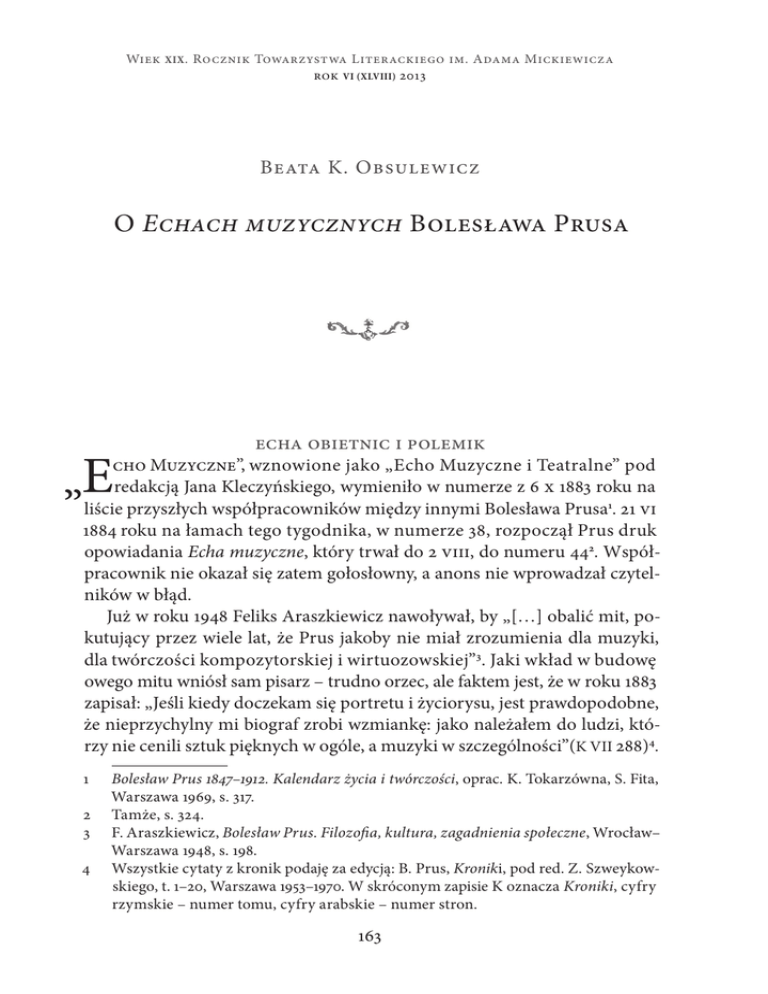 Wiek XIX . Rocznik Towarzystwa Literackiego im. Adama Mickiewicza rok VI (XLVIII) 2013 Beata K. Obsulewicz O Echach muzycznych Bolesława Prusa E ” echa obietnic i polemik cho Muzyczne”, wznowione jako „Echo Muzyczne i Teatralne” pod redakcją Jana Kleczyńskiego, wymieniło w numerze z 6 x 1883 roku na liście przyszłych współpracowników między innymi Bolesława Prusa1. 21 vi 1884 roku na łamach tego tygodnika, w numerze 38, rozpoczął Prus druk opowiadania Echa muzyczne, który trwał do 2 viii, do numeru 442. Współpracownik nie okazał się zatem gołosłowny, a anons nie wprowadzał czytelników w błąd. Już w roku 1948 Feliks Araszkiewicz nawoływał, by „[…] obalić mit, pokutujący przez wiele lat, że Prus jakoby nie miał zrozumienia dla muzyki, dla twórczości kompozytorskiej i wirtuozowskiej”3. Jaki wkład w budowę owego mitu wniósł sam pisarz – trudno orzec, ale faktem jest, że w roku 1883 zapisał: „Jeśli kiedy doczekam się portretu i życiorysu, jest prawdopodobne, że nieprzychylny mi biograf zrobi wzmiankę: jako należałem do ludzi, którzy nie cenili sztuk pięknych w ogóle, a muzyki w szczególności”(K Vii 288)4. 1 2 3 4 Bolesław Prus 1847–1912. Kalendarz życia i twórczości, oprac. K. Tokarzówna, S. Fita, Warszawa 1969, s. 317. Tamże, s. 324. F. Araszkiewicz, Bolesław Prus. Filozofia, kultura, zagadnienia społeczne, Wrocław– Warszawa 1948, s. 198. Wszystkie cytaty z kronik podaję za edycją: B. Prus, Kroniki, pod red. Z. Szweykowskiego, t. 1–20, Warszawa 1953–1970. W skróconym zapisie K oznacza Kroniki, cyfry rzymskie – numer tomu, cyfry arabskie – numer stron. 163 • Beata K. Obsulewicz • Aby oczekiwaniom demistyfikatorskim i demitologizującym stało się zadość, trzeba osobnej sporej rozprawy. W tym miejscu ograniczymy się do przywołania paru ech muzycznych w publicystyce Prusa, by oświetlić powody zaproszenia autora Milknących głosów do współtworzenia pisma takiego, jak „Echo”. Jak wiadomo, nieraz referował on swym słuchaczom wrażenia z odwiedzanych przybytków muz. W roku 1881, obdarowany bezpłatnym biletem, relacjonował symfoniczne występy pięćdziesięcioosobowego zespołu instrumentalnego pod dyrekcją Zygmunta Noskowskiego w Dolinie Szwajcarskiej5. Występom orkiestry Namysłowskiego, również w Dolinie Szwajcarskiej, na cele dobroczynne świadkował w roku 18906. Bywał w salonie Ludwika Grossmana, gdzie zimą 1884 roku wysłuchał koncertu utworów kompozytorów polskich (Aleksandra Zarzyckiego, Henryka Wieniawskiego), który dała skrzypaczka Teresa Tua7, a wiosną roku następnego przysłuchiwał się fortepianowemu recitalowi Antona Grigorjewicza Rubinsteina8, w karnawale 1890 roku – popisom wokalnym Władysława Mierzyńskiego9. 30 iv 1890 roku do salonów muzycznych Gebethnera i Wolffa przybył na koncert Alfreda Reisenauera, ucznia Franciszka Liszta, oraz muzyków warszawskich: Stanisława Barcewicza, Zygmunta Noskowskiego i innych10. W 1887 roku w Teatrze 5Zob. K V 121, 143–144. Działalność Noskowskiego uważał za niezwykle pożyteczną i stawiał za wzór innym twórcom kultury i gospodarki narodowej. Pochwalał również repertuar prowadzonej przez niego orkiestry, tj. popularyzowanie dzieł kompozytorów miejscowych: Stanisława Moniuszki, Konstantego Górskiego, „panów Zarzyckich, Żeleńskich, Grossmanów, Hertzów, Kleczyńskich” (tamże, s. 144). Retorycznie pytał: „Niech [wskazani artyści – B.K.O.] powiedzą: po ile miesięcy, jeżeli nie lat, każdy z nich czekać musiał, nim jaka orkiestra odegrała jaką kompozycję, którą dziś z całą przyjemnością słuchamy po kilka razy na tydzień? Trudne dotychczas były warunki dla naszych kompozytorów, bo cudzoziemiec tylko w ostateczności ozdabiał sympatycznymi ich nazwiskami swoją muzykalną spiżarnię. […] Myślę, że orkiestra Noskowskiego nie tylko powróci społeczeństwu melodie, które podsłuchał w nim geniusz kompozytorów, nie tylko spopularyzuje ich nazwiska, ale jeszcze zachęci innych do nowych prac” (144). 6Zob. K XII 428 [komentarz edytora]. 7Zob. K VII 289–290. 8Zob. K VIII 109–110. 9Zob. Bolesław Prus 1847–1912. Kalendarz życia i twórczości, s. 400. 10 K XII 202–203. Próbka opisu gry wirtuoza i stylu Prusa: „On właściwie nie gra na fortepianie, ale pływa po nim… Chwilami zdaje się, że łapie wodę przetakiem, to znowu, że pierze bieliznę, to znowu, że miesi ciasto… Łaskocze biedny fortepian to prawą ręką, to lewą ręką, to go potrąca, to go ściska, to szczypie go z prawej, to skubie z lewej, to daje mu jakieś znaki nogą, to atakuje z dołu… Nie dziw więc, że nawet martwy sprzęt dostaje nareszcie spazmów i śmieje się, płacze… no, albo ja wiem, czego on nie wyrabia?… Krótko mówiąc, gdyby pan Reisenauer przestał być kiedy 164 • O Echach muzycznych Bolesława Prusa • Wielkim ponownie słuchał skrzypka Stanisława Barcewicza11 oraz dzieł Ludwiga van Beethovena, Felixa Mendelssohna Bartholdy’ego, Antoniego Rubinsteina i Fryderyka Chopina w wykonaniu pianisty wiedeńskiego Alfreda Grünfelda12. 15 I 1899 roku wybrał się na do ratusza warszawskiego, by w Sali Aleksandryjskiej wysłuchać Ignacego Paderewskiego z orkiestrą symfoniczną pod batutą Emila Młynarskiego13. Osobowość artysty zrobiła na nim ogromne wrażenie, które tylko potwierdzić mogły recitale w dniach 19 i 21 i, na które także się udał. Wakacje w Nałęczowie zetknęły go ze znaną śpiewaczką Julią Uszyńską14 oraz z kompozytorami polskimi: Władysławem Żeleńskim i wspomnianym wyżej Ludwikiem Grossmanem (1878, 1885). Odnotował wizytę śpiewaczki Elly Russel w xi 1887 roku15, zaś Paulina Lucca (właśc. Maria Paulina Mallinger – B.K.O.) w 1889 roku zaabsorbowała go w takim stopniu, by zaistnieć jako bohaterka całej kroniki, a w niej adresatka „cierpkiej ody”, zaczynającej się od słów: fortepianistą, m