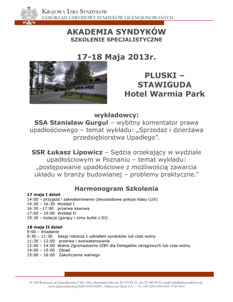 KRAJOWA IZBA SYNDYKÓW SAMORZĄD ZAWODOWY SYNDYKÓW LICENCJONOWANYCH AKADEMIA SYNDYKÓW SZKOLENIE SPECJALISTYCZNE 17-18 Maja 2013r. PLUSKI – STAWIGUDA Hotel Warmia Park wykładowcy: SSA Stanisław Gurgul – wybitny komentator prawa upadłościowego – temat wykładu: „Sprzedaż i dzierżawa przedsiębiorstwa Upadłego”. SSR Łukasz Lipowicz – Sędzia orzekający w wydziale upadłościowym w Poznaniu – temat wykładu: „postępowanie upadłościowe z możliwością zawarcia układu w branży budowlanej – problemy praktyczne.” Harmonogram Szkolenia 17 maja I dzień 14:00 – przyjazd i zakwaterowanie (dwuosobowe pokoje klasy LUX) 14:30 – 16:30 Wykład I 16:30 –17:00 przerwa kawowa 17:00 – 19:00 Wykład II 19:30 – kolacja (gorący i zimy bufet z DJ) 18 maja II dzień 9:00 – śniadanie 9:30 – 11:30 Sesja robocza z udziałem syndyków lub czas wolny 11:30 – 12:00 przerwa i wykwaterowanie 12:00 – 14:00 Walne Zgromadzenie IZBY dla Delegatów okręgowych lub czas wolny 14:00 – 15:00 Obiad 15:00 – 16:00 Zakończenie walnego 01-745 Warszawa, ul. Jasnodworska 5 lok. 101a, Kancelaria Izby tel. 81 479 45 53 , fax 22 100 50 52, email: [email protected] , www.izbasyndykow.pl KRS 0000348299 , Millennium Bank S.A. : 95 1160 2202 0000 0001 5748 4414 KRAJOWA IZBA SYNDYKÓW SAMORZĄD ZAWODOWY SYNDYKÓW LICENCJONOWANYCH KOSZTY SZKOLENIA PAKIET A - Osoby nie będące członkami Izby, dzień pierwszy bez noclegu i kolacji: PAKIET A+ - Osoby nie będące członkami Izby, dwa dni z noclegiem i kolacją, obiadem: PAKIET B - Członkowie Krajowej Izby Syndyków dzień pierwszy bez noclegu i kolacji: PAKIET B+ - Członkowie Krajowej Izby Syndyków dwa dni z noclegiem i kolacją, obiadem: PAKIET C – Osoba towarzysząca nie biorąca udziału wykładach (tylko z A+ lub B+): 700 zł netto 1200 zł netto 500 zł netto 950 zł netto 450 zł netto *Obsługi prawne, pracownicy i współpracownicy mas upadłości zarządzanych przez członków Krajowej Izby Syndyków, korzystają z cen przypisanych dla pakietów B i B+ pod warunkiem potwierdzenia współpracy przez członka Izby. Zachęcamy do połączenia wypoczynku z rozwojem zawodowym. Można to właśnie uczynić przy okazji Akademii Syndyków 17-18 Maja 2013r. w Hotel & SPA Termy Medical WARMIA PARK Pluski ul. Pluszna 36, 11-034 Stawiguda Tel.: +48-89-519-53-00, Fax: +48-89-519-53-03 www.warmiapark.pl Hotel SPA Termy Medical WARMIA PARK**** usytuowany jest w Pluskach - malowniczym zakątku Warmii i Mazur, w sercu Puszczy Napiwodzko-Ramuckiej, na przesmyku między jeziorami Pluszne i Łańskie. Obiekt położony jest w odległości 18 km od Olsztyna, na terenie gminy Stawiguda - jednej z najpiękniejszych gmin Pojezierza Olsztyńskiego. Mając na uwadze charakter, styl architektoniczny oraz zakres usług i wyposażenie obiektu, kompleks został nazwany Termy Medical WARMIA PARK. W jego skład wchodzi 4-gwiazdkowy hotel, restauracja, SPA, 3-poziomowy aquapark o powierzchni 3000 m2 oraz centrum konferencyjne. Wszystkie części obiektu stanowią zintegrowaną całość. 01-745 Warszawa, ul. Jasnodworska 5 lok. 101a, Kancelaria Izby tel. 81 479 45 53 , fax 22 100 50 52, email: [email protected] , www.izbasyndykow.pl KRS 0000348299 , Millennium Bank S.A. : 95 1160 2202 0000 0001 5748 4414 KRAJOWA IZBA SYNDYKÓW SAMORZĄD ZAWODOWY SYNDYKÓW LICENCJONOWANYCH Formularz zgłoszeniowy uczestnictwa w Akademii Syndyków W dniach 17-18 Maja 2013r. w Pluskach Stawiguda hotel WARMIA PARK www.warmiapark.pl (proszę wypełnić, podpisać i odesłać faxem lub mailem) Zgłaszam uczestnictwo w Akademii Syndyków odbywającej się w dniach 17-18 Maja 2013r. w Pluskach - Stawiguda Zgłaszam uczestnictwo osoby towarzyszącej, nie biorącej udziału w wykładach, uczestniczącej w posiłkach Jestem członkiem Krajowej Izby Syndyków Współpracuję z członkiem Krajowej Izby Syndyków ………………………………………………… (podaj Imię i Nazwisko członka KIS) – patrz uwaga z *powyżej proszę o wystawienie faktury VAT, numer NIP oraz dane do faktury: Informacje kontaktowe: Imię: Nazwisko: Adres: Telefon: ………………………………………………………………………………………………… ………………………………………………………………………………………………… ………………………………………………………………………………………………… …………………………….. email: ……………………………………………….. ZAMAWIAM PAKIET: PAKIET ILOŚĆ Jestem zainteresowany zamówieniem dodatkowych noclegów z upustem 15% od cen hotelowych w następujących terminach : …………………………………………………………………………………………………………………………. Zgłoszenia należy dokonać do Kancelarii Krajowej Izby Syndyków: - mailowo na adres e-mail: [email protected] - faxem na nr 22 100 50 52 Wszelkich informacji udzielamy w godzinach 9-16 pod nr telefonu 81 479 45 53 lub mailowo: [email protected] Po otrzymaniu zgłoszenia zostanie wystawiona Faktura Pro – Forma na kwotę wynikającą ze złożonego zamówienia i zostanie przesłana elektronicznie w celu uregulowania płatności za szkolenie. Po upływie terminu płatności nieuregulowanej faktury pro forma, zamówienie zostanie automatycznie anulowane. Zamknięcie listy zgłoszeń nastąpi w dniu 30 kwietnia 2013r. Po tym terminie ze względów organizacyjnych może być już niemożliwe zarezerwowanie noclegu w Hotelu Warmia Park lub może się wiązać z 15% dopłatą. Pierwszych 10 wpłacających otrzyma wszystkie do tej pory wydane numery kwartalnika Krajowej Izby Syndyków FENIX PL 01-745 Warszawa, ul. Jasnodworska 5 lok. 101a, Kancelaria Izby tel. 81 479 45 53 , fax 22 100 50 52, email: [email protected] , www.izbasyndykow.pl KRS 0000348299 , Millennium Bank S.A. : 95 1160 2202 0000 0001 5748 4414