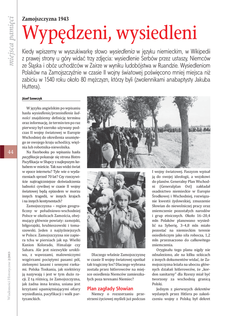 miejsca pamięci Zamojszczyzna 1943 Wypędzeni, wysiedleni Kiedy wpiszemy w wyszukiwarkę słowo wysiedlenia w języku niemieckim, w Wikipedii z prawej strony u góry widać trzy zdjęcia: wysiedlenie Serbów przez ustaszy, Niemców ze Śląska i obóz uchodźców w Zairze w wyniku ludobójstwa w Ruandzie. Wysiedleniom Polaków na Zamojszczyźnie w czasie II wojny światowej poświęcono mniej miejsca niż zabiciu w 1540 roku około 80 mężczyzn, którzy byli (zwolennikami anabaptysty Jakuba Huttera). Józef Szewczyk Wiadomości Historyczne 2/2013 44 W języku angielskim po wpisaniu hasła wysiedlenie/przesiedlenia ludności znajdziemy de inicję terminu oraz informację, że termin ten po raz pierwszy był szeroko używany podczas II wojny światowej w Europie Wschodniej do określenia usuniętego ze swojego kraju uchodźcy, więźnia lub robotnika-niewolnika. Na Facebooku po wpisaniu hasła pacy ikacja pokazuje się strona Bistro Pacy ikacja w Słupcy z najlepszym kebabem w mieście. Tak nas widzi świat w epoce internetu? Tyle wie o wydarzeniach sprzed 70 lat? Czy rzeczywiście najtragiczniejsze doświadczenia ludności cywilnej w czasie II wojny światowej będą epizodem w morzu innych tragedii, w innych krajach i na innych kontynentach? Zamojszczyzna – region geograiczny w południowo-wschodniej Polsce w okolicach Zamościa, obejmujący głównie powiaty: zamojski, biłgorajski, hrubieszowski i tomaszowski. Jeden z najżyźniejszych w Polsce. Zamojszczyzna nie zapiera tchu w piersiach jak np. Wielki Kanion Kolorado, Himalaje czy Sahara. Ale jest niezwykle urokliwa, z wąwozami, malowniczymi wzgórzami pociętymi pasami pól, zielonymi lasami i sennymi rzekami. Polska Toskania, jak niektórzy ją nazywają i jest w tym dużo racji. Z tą różnicą, że Zamojszczyzna, jak żadna inna kraina, usiana jest krzyżami upamiętniającymi o iary wysiedlania, pacy ikacji i walk partyzanckich. Dlaczego właśnie Zamojszczyznę w czasie II wojny światowej spotkał tak tragiczny los? Dlaczego wybrana została przez hitlerowców na miejsce osiedlenia Niemców zamieszkałych poza terenami Niemiec? Plan zagłady Słowian Niemcy o rozszerzaniu przestrzeni życiowej myśleli już podczas I wojny światowej. Faszyzm wpisał ją do swojej ideologii, a wojskowi do planów. Generalny Plan Wschodni (Generalplan Ost) zakładał osadnictwo niemieckie w Europie Środkowej i Wschodniej, rozwiązanie kwestii żydowskiej, zmuszenie Słowian do niewolniczej pracy oraz zniemczenie pozostałych narodów i grup etnicznych. Około 16–20,4 mln Polaków planowano wysiedlić na Syberię, 3–4,8 mln miało pozostać na niemieckim terenie osiedleńczym jako siła robocza, 1,2 mln przeznaczono do całkowitego zniemczenia. Oryginału tego planu nigdy nie odnaleziono, ale na kilku szkicach z innych dokumentów widać, że Zamojszczyzna leżała na uboczu głównych działań hitlerowców, że „kordon sanitarny” dla Rzeszy miał być tworzony za wschodnią granicą Polski. Jednym z pierwszych dekretów wydanych przez Hitlera po zakończeniu wojny z Polską był dekret Wysiedlenie i zbrojny opór Tak określa się dzieci sieroty, które były oddzielone od rodziców w wyniku selekcji rasowej podczas akcji wysiedleńczej i pacy ikacji na Zamojszczyźnie w latach 1942–43. Około 30 tys. dzieci najpierw tra iało do obozów przejściowych, a następnie pociągami przewożono je albo do obozów koncentracyjnych w Oświęcimiu, gdzie zabijano je zastrzykami z fenolem, i w Majdanku, albo na teren III Rzeszy do pracy w fabrykach w celu zniemczenia. W lipcu i sierpniu tra iło tam 4454 dzieci w wieku 4–12 lat. W akcję ratowania dzieci Zamojszczyzny zaangażowali się kolejarze i ludność cywilna. Na stacjach przejazdu pociągów m.in. w Sobolewie, Żelechowie, Garwolinie, Pilawie i Warszawie wykupywano dzieci od Niemców, odbijano, kradziono wagony z dziećmi, udzielano im pomocy, urządzano pogrzeby. Nieznana jest liczba dzieci, które zmieniły nazwisko i zostały wywiezione na zniemczenie do III Rzeszy. Bronisław Pekosiński W piątek (4.01.2013) na cmentarzu para ialnym odbył się pogrzeb Bronisława Pekosińskiego. Mały chłopiec cudem uratowany z obozu w Zwierzyńcu stał się symbolem losu dzieci Zamojszczyzny. Zmarł w wieku ok. 73 lat. Nigdy nie poznał swojej matki, która przerzuciła go przez druty obozu w Zwierzyńcu. W wyniku upadku doznał urazu kręgosłupa i nie był w pełni sprawny. Odnalezionemu prawdopodobnie przez partyzantów lub miejscową ludność chłopcu nadano w 1947 r. urzędowo nazwisko od skrótu PKOS (Polski Komitet Opieki Społecznej). Za datę urodzenia przyjęto dzień rozpoczęcia II wojny światowej – 1 września 1939 roku. W tym dniu przypadają imieniny Bronisława i takie też otrzymał imię kilkuletni chłopiec. Wychowywał się w domu dziecka w Zamościu. Tam ukończył szkołę. Był utalentowanym szachistą i powiatowym mistrzem w tej dyscyplinie. Pracował w kilku zamojskich irmach. W czasach Polski Ludowej w zależności od polityki władz otrzymywał wsparcie bądź o nim zupełnie zapominano. Beznadziejność sytuacji, brak rodziny doprowadziły do pogorszenia jego stanu zdrowia. O Bronisławie Pekosińskim dowiedział się świat za sprawą oryginalnego, nagrodzonego Złotymi Lwami ilmu Grzegorza Królikiewicza Przypadek Pekosińskiego (1993 r.). Obok znakomitych aktorów: Anny Seniuk, Marii Klejdysz, Krzysztofa Chamca, Franciszka Pieczki, Franciszka Trzeciaka, wystąpił Bronisław Pekosiński jako autentyczna postać – bohater postawiony w obliczu historii i współczesnych mu czasów. Jego biogra ia posłużyła także Tadeuszowi Słobodziankowi do napisania sztuki Obywatel Pekosiński. Popularność, jaką przyniósł mu ilm, oraz honorarium pozwoliły na poprawę sytuacji materialnej i życiowej. Przez lata jego charakterystyczną postać można było spotkać na zamojskim Starym Mieście. Pomimo kalectwa i ciężkiego losu potra ił zachować w sobie d