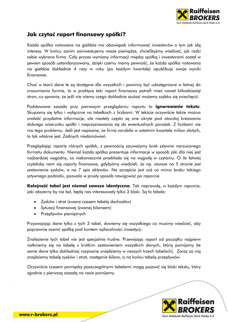 Jak czytać raport finansowy spółki? Każda spółka notowana na giełdzie ma obowiązek informować inwestorów o tym jak idą interesy. W końcu zanim zainwestujemy nasze pieniądze, chcielibyśmy wiedzieć, jak radzi sobie wybrana firma. Cały proces wymiany informacji między spółką i inwestorami został w pewien sposób ustandaryzowany, dzięki czemu mamy pewność, że każda spółka notowana na giełdzie dokładnie 4 razy w roku (po każdym kwartale) opublikuje swoje wyniki finansowe. Choć w teorii dane te są dostępne dla wszystkich i powinny być udostępnione w łatwej do zrozumienia formie, to w praktyce taki raport finansowy potrafi mieć nawet kilkadziesiąt stron, co sprawia, że jeśli nie wiemy czego dokładnie szukać możemy szybko się zniechęcić. Podstawowa zasada przy pierwszym przeglądaniu raportu to ignorowanie tekstu. Skupiamy się tylko i wyłącznie na tabelkach z liczbami. W tekście oczywiście także można znaleźć przydatne informacje, ale niestety często są one ukryte pod otoczką kreowania dobrego wizerunku spółki i nieprzyznawania się do ewentualnych porażek. Z liczbami nie ma tego problemu. Jeśli jest napisane, że firma zarobiła w ostatnim kwartale milion złotych, to tak właśnie jest. Żadnych niedomówień. Przeglądając raporty różnych spółek, z pewnością zauważymy brak sztywno narzuconego formatu dokumentu. Niemal każda spółka prezentuje informacje w sposób jaki dla niej jest najbardziej wygodny, co niekoniecznie przekłada się na wygodę w czytaniu. O ile łatwiej czytałoby nam się raporty finansowe, gdybyśmy wiedzieli, że np. zawsze na 5 stronie jest zestawienie zysków, a na 7 spis aktywów. Na szczęście jest coś co mimo braku takiego sztywnego podziału, pozwala w prosty sposób nawigować po raporcie. Kolejność tabel jest niemal zawsze identyczna. Tak naprawdę, w każdym raporcie, jaki obszerny by nie był, będą nas interesowały tylko 3 bloki. Są to tabele: Zysków i strat (zwana czasem tabelą dochodów) Sytuacji finansowej (zwanej bilansem) Przepływów pieniężnych Przyswajając dane tylko z tych 3 tabel, dowiemy się wszystkiego co musimy wiedzieć, aby poprawnie ocenić spółkę pod kontem opłacalności inwestycji. Znalezienie tych tabel nie jest specjalnie trudne. Przewijając raport od początku najpierw natkniemy się na tabelę z krótkim zestawieniem wszystkich danych, którą pomijamy (te same dane tylko dokładniej rozpisane znajdziemy w naszych trzech tabelach). Zaraz za nią znajdziemy tabelę zysków i strat, następnie bilans, a na końcu tabelę przepływów. Oczywiście czasem pomiędzy poszczególnymi tabelami mogą pojawić się bloki tekstu, który zgodnie z pierwszą zasadą na razie pomijamy. Dlaczego do pełnej analizy potrzeba wszystkich trzech tabel? Aby odpowiedzieć na to pytanie spójrzmy na poniższy schemat: Elipsy to punkty, w których są pieniądze. Strzałki symbolizują przepływ tych pieniędzy. Prostokąty to miejsca, w których zastosowanie mają poszczególne tabele z raportu. Jak widzimy bilans nie sąsiaduje z żadną strzałką, gdyż nie wiąże się z przepływem pieniędzy. To nic innego jak informacja o tym co firma posiada na daną chwilę. Jest tworzony zawsze na dany dzień (a nie za dany okres czasu) i pokazuje obraz spółki w oderwaniu od tego jakie kontrakty i umowy spółka posiada. Z jednej strony jest to zaleta, gdyż bez zbędnych dodatków, które mogły by rozpraszać, obrazuje zmianę rozmiaru spółki (jeśli spółka się rozrasta, to z każdym kwartałem w bilansie będą coraz większe kwoty). Z drugiej sama ta wiedza nie jest wystarczająca, gdyż nie uwzględnia chociażby sposobu w jaki ten rozrost jest finansowany. Dlatego potrzebujemy narzędzia, które da nam wgląd w źródło, z którego pochodzą pieniądze wpływające do firmy. Takim narzędziem jest rachunek przepływów pieniężnych. Dzieli on wpływające i wypływające fundusze na trzy kategorie: Środki pochodzące z podstawowej działalności spółki (kontrahenci), czyli to co spółka zarobiła lub straciła na swoim głównym biznesie. Jest to najbardziej pożądany sposób pozyskiwania kapitału, gdyż są to pieniądze zarobione. Środki na inwestycje. Aby się rozwijać spółka musi ciągle inwestować. Każda firma musi znaleźć swój złoty środek pomiędzy wydatkami na potrzeby bieżące, a dalekosiężnymi inwestycjami. Kredyty i pożyczki. Najszybsze źródło pozyskania pieniędzy. Niestety pożyczony kapitał ma tę wadę, że prędzej czy później trzeba go oddać. Jeśli zbyt duża część kapitału na inwestycje, będzie pochodziła z kredytów, a inwestycja okaże się nierentowna, spółka znajdzie się w sporych tarapatach. Rachunek przepływów spina te grupy i kontroluje stosunek między nimi. Dzięki niemu zawsze wiemy, czy spółka rzeczywiście zarabia czy tylko sprawia takie wrażenie. Na tym moglibyśmy zakończyć, gdyż po przeanalizowaniu tych 2 tabel wiemy bardzo dużo zarówno o sytuacji wewnętrznej jak i zewnętrznej spółki. Okazuje się jednak, że na przepływy od kontrahentów, które są najważniejsze z punktu widzenia zdrowego finansowania działalności, składa się wiele pośrednich przychodów i kosztów, więc zdecydowano, że warto wyłączyć je do oddzielnej tabeli nazwanej rachunkiem zysków i strat. Jak widać zawartość raportów nie jest, aż tak straszna jak mogłoby się wydawać na pierwszy rzut oka i przy odrobinie wprawy, analiza danego kwartału zajmie nam co najwyżej kilkanaście minut. W kolejnych artykułach przyjrzymy się dokładniej poszczególnym tabelom.
