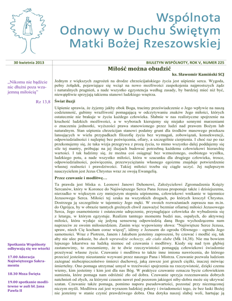 30 kwietnia 2013 BIULETYN WSPÓLNOTY, ROK V, NUMER 225 Miłość można obudzić ks. Sławomir Kamiński SCJ „Nikomu nie bądźcie nic dłużni poza wzajemną miłością” Jednym z większych zagrożeń na drodze chrześcijańskiego życia jest uśpienie serca. Wygoda, pełny żołądek, pojawiające się wciąż na nowo możliwości zaspokojenia najprostszych żądz i naturalnych pragnień, a nade wszystko egzystencja według zasady, by bardziej mieć niż być, niewątpliwie sprzyjają takiemu stanowi ludzkiego wnętrza. Rz 13,8 Świat iluzji Uśpienie sprawia, że żyjemy jakby obok Boga, tracimy przeświadczenie o Jego wpływie na naszą codzienność, gubimy wrażliwość pomagającą w odczytywaniu znaków Jego miłości, których ostatecznie nie brakuje w życiu każdego człowieka. Słabnie w nas realistyczne spojrzenie na kruchość ludzkich możliwości, a w wyborach kierujemy się niejako sennymi marzeniami o znaczeniu jednostki, wyższości prawa stanowionego przez ludzi nad prawem Bożym lub naturalnym. Stan uśpienia chrześcijan stanowi podatny grunt dla środków masowego przekazu lansujących w wielu przypadkach filozofię życia bez wymagań, zobowiązań, konsekwencji, odpowiedzialności i najlepiej bez poświęcenia, ofiary, a szczególnie cierpienia. I choć raz po raz przekonujemy się, że taka wizja przegrywa z prozą życia, to mimo wszystko dalej poddajemy się sile tej mantry, próbując na jej iluzjach budować potrzebną każdemu człowiekowi hierarchię wartości. I tak łudzimy się, że można coś osiągnąć bez wzmożonego, osobistego wysiłku, ludzkiego potu, a nade wszystko miłości, która w szacunku dla drugiego człowieka, trosce, odpowiedzialności, poświęceniu, przezwyciężaniu własnego egoizmu znajduje potwierdzenie własnej realności i prawdziwości. Takiej miłości trzeba się ciągle uczyć. Jej najlepszym nauczycielem jest Jezus Chrystus wraz ze swoją Ewangelią. Przez czuwanie i modlitwę… Spotkania Wspólnoty odbywają się we wtorki 17.00 Adoracja Najświętszego Sakramentu 18.30 Msza Święta 19.00 spotkanie modlitewne w auli bł. Jana Pawła II Ta prawda jest bliska o. Leonowi Janowi Dehonowi, Założycielowi Zgromadzenia Księży Sercanów, który w Koronce do Najświętszego Serca Pana Jezusa proponuje także i dzisiejszemu, nierzadko w większym czy mniejszym stopniu uśpionemu, człowiekowi wnikanie w tajemnice Jezusowego Serca. Miłości tej szuka na wszystkich drogach, po których kroczył Chrystus. Dostrzega ją szczególnie w tajemnicy Jego męki. W swoich rozważaniach zaprasza nas m.in. do Ogrójca, by w obrazie tamtych groźnych chwil zauważyć bezmiar ofiarnej miłości Jezusowego Serca, Jego osamotnienie i ostatecznie udręczenie, przynaglające człowieka do wybudzenia się z letargu, w którym egzystuje. Realizm tamtego momentu budzi nas, ospałych, do aktywnej miłości, która wydaje się jedyną sensowną odpowiedzią daną Bogu wychodzącemu nam naprzeciw ze swoim miłosierdziem. Zanim więc wypowiemy słowa: "Najświętsze Serce Jezusa, spraw, niech Cię kocham coraz więcej", idźmy z Jezusem do ogrodu Oliwnego – ogrodu Jego samotności. Wraz z Piotrem, Janem i Jakubem jesteśmy zaproszeni, by czuwać i modlić się, tak aby nie ulec pokusie, bo duch wprawdzie ochoczy, ale ciało słabe (Mk 14,38). Nie ma bowiem lepszego lekarstwa na ludzką niemoc od czuwania i modlitwy. Kiedy się nad tym głębiej zastanowimy, to zrozumiemy, że te dwie rzeczywistości pomagają człowiekowi świadomie przeżywać własne życie. Czuwanie i modlitwa to także inne imiona nawrócenia, do którego przecież jesteśmy nieustannie wzywani przez naszego Pana i Mistrza. Czuwanie pozwala ludziom zażegnać niebezpieczeństwo śmierci duchowej, jaką zawsze jest grzech ciężki, inaczej mówiąc śmiertelny. Ono pomaga utrzymać umysł w trzeźwości spojrzenia na rzeczywistość, dzięki czemu wiemy, kim jesteśmy i kim jest dla nas Bóg. W praktyce czuwanie oznacza bycie człowiekiem sumienia, które pomaga nam odróżnić zło od dobra. Czuwanie sprzyja rozeznawaniu dobrych natchnień od złych, za którymi czasem nawet pod pozorem jakiegoś niby-dobra może się ukrywać szatan. Czuwanie także pomaga, pomimo naporu pseudowartości, pozostać przy niezmąconej niczym myśli. Modlitwa zaś jest wyrazem ludzkiej pokory i świadomości tego, że bez łaski Bożej nie jesteśmy w stanie czynić prawdziwego dobra. Ona dotyka naszej słabej woli, hartując ją Odpowiedzialni za Wspólnotę o. Wiktor Tokarski OFM pasterz tel. 17.853.34.95 w. 125 Barbara K. lider Wiesława M. v-ce lider Jacek F. v-ce lider Animatorzy Diakonii Barbara K. diakonia adoracyjna Marta F. diakonia prorocka Jacek F. diakonia modlitwy wstawienniczej i uwolnienia Agnieszka R. diakonia nauczania Jolanta S. diakonia uwielbienia Barbara S. diakonia miłosierdzia Anna O. diakonia wprowadzająca dla kobiet Paweł K. diakonia wprowadzająca dla mężczyzn Wiesława M. diakonia organizacyjna Daniel Ch. diakonia porządkowa Marta F. Diakonia medialna Dane fundacji: Fundacja Charismata im. św. Pawła Apostoła ul. Sokoła 8 35-010 Rzeszów KRS: 0000431262 NIP: 813-36-74-368 REGON: 180881469 i czyniąc mocniejszą, bardziej odporną na słabości związane z ludzką naturą i zewnętrzne ataki Złego. Modlitwa wreszcie pomaga nam być przy kochającym nas Bogu, który pragnie przymierza opartego na miłości i przyjaźni z człowiekiem. Przez współczucie… Niełatwo być wiernym tym dwóm sposobom pomagającym w pozostawaniu w orbicie działania Bożego. Apostołowie pomimo miłości do Chrystusa tamtej nocy przegrali. Być może przekonali się na własnej skórze, że łatwiej wypowiedzieć słowo "kocham", niż potwierdzić swoją przyjaźń konkretnymi czynami. Dla nas z tamtego wydarzenia również płynie nauka mówiąca, że odczuwanie miłości to jeszcze za mało. Miłość sprawdza się w konkretnej sytuacji, dotyczy naszych postaw i czynów, a po