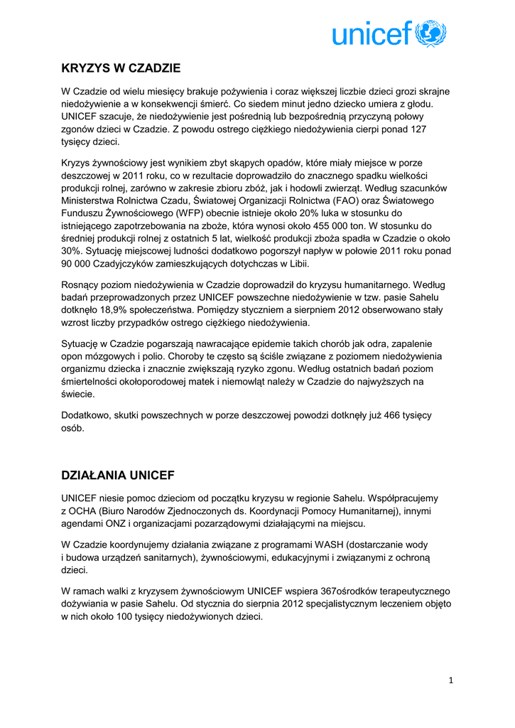 KRYZYS W CZADZIE W Czadzie od wielu miesięcy brakuje pożywienia i coraz większej liczbie dzieci grozi skrajne niedożywienie a w konsekwencji śmierć. Co siedem minut jedno dziecko umiera z głodu. UNICEF szacuje, że niedożywienie jest pośrednią lub bezpośrednią przyczyną połowy zgonów dzieci w Czadzie. Z powodu ostrego ciężkiego niedożywienia cierpi ponad 127 tysięcy dzieci. Kryzys żywnościowy jest wynikiem zbyt skąpych opadów, które miały miejsce w porze deszczowej w 2011 roku, co w rezultacie doprowadziło do znacznego spadku wielkości produkcji rolnej, zarówno w zakresie zbioru zbóż, jak i hodowli zwierząt. Według szacunków Ministerstwa Rolnictwa Czadu, Światowej Organizacji Rolnictwa (FAO) oraz Światowego Funduszu Żywnościowego (WFP) obecnie istnieje około 20% luka w stosunku do istniejącego zapotrzebowania na zboże, która wynosi około 455 000 ton. W stosunku do średniej produkcji rolnej z ostatnich 5 lat, wielkość produkcji zboża spadła w Czadzie o około 30%. Sytuację miejscowej ludności dodatkowo pogorszył napływ w połowie 2011 roku ponad 90 000 Czadyjczyków zamieszkujących dotychczas w Libii. Rosnący poziom niedożywienia w Czadzie doprowadził do kryzysu humanitarnego. Według badań przeprowadzonych przez UNICEF powszechne niedożywienie w tzw. pasie Sahelu dotknęło 18,9% społeczeństwa. Pomiędzy styczniem a sierpniem 2012 obserwowano stały wzrost liczby przypadków ostrego ciężkiego niedożywienia. Sytuację w Czadzie pogarszają nawracające epidemie takich chorób jak odra, zapalenie opon mózgowych i polio. Choroby te często są ściśle związane z poziomem niedożywienia organizmu dziecka i znacznie zwiększają ryzyko zgonu. Według ostatnich badań poziom śmiertelności okołoporodowej matek i niemowląt należy w Czadzie do najwyższych na świecie. Dodatkowo, skutki powszechnych w porze deszczowej powodzi dotknęły już 466 tysięcy osób. DZIAŁANIA UNICEF UNICEF niesie pomoc dzieciom od początku kryzysu w regionie Sahelu. Współpracujemy z OCHA (Biuro Narodów Zjednoczonych ds. Koordynacji Pomocy Humanitarnej), innymi agendami ONZ i organizacjami pozarządowymi działającymi na miejscu. W Czadzie koordynujemy działania związane z programami WASH (dostarczanie wody i budowa urządzeń sanitarnych), żywnościowymi, edukacyjnymi i związanymi z ochroną dzieci. W ramach walki z kryzysem żywnościowym UNICEF wspiera 367ośrodków terapeutycznego dożywiania w pasie Sahelu. Od stycznia do sierpnia 2012 specjalistycznym leczeniem objęto w nich około 100 tysięcy niedożywionych dzieci. 1 „UMIERAM Z GŁODU” KAMPANIA POMOCY DZIECIOM W CZADZIE Celem kampanii „Umieram z głodu” organizowanej przez UNICEF Polska jest zwrócenie uwagi na kryzys żywnościowy w Sahelu i zebranie środków finansowych na program pomocy dzieciom w Czadzie. UNICEF jest na miejscu od początku kryzysu, który dotknął cały region Sahelu. Obejmujemy dostawami żywności i leków coraz większą liczbę dzieci. Jednak potrzeby są ogromne. Trwająca kilka miesięcy susza, niestabilna sytuacja polityczna, klęska szarańczy i zagrożenie chorobami zakaźnymi sprawiły, że z powodu skrajnego niedożywienia cierpi tam 1,1 miliona dzieci. 18 milionom mieszkańców Sahelu grozi głód. W samym Czadzie co 7 minut z głodu umiera jedno dziecko. UNICEF, dzięki wieloletniemu doświadczeniu pracy w sytuacjach kryzysowych, jest koordynatorem wielu działań pomocowych prowadzonych na miejscu. Ma dostęp do miejsc gdzie nie jest łatwo dotrzeć i otwarcie mówi o problemach, które media omijają w codziennych serwisach. Warto podkreślić, że UNICEF nie jest finansowany przez ONZ a swoje działania prowadzi wyłącznie dzięki wsparciu Darczyńców. W poprzednich latach nieśliśmy pomoc m.in. ofiarom trzęsienia ziemi na Haiti, podczas katastrofalnych powodzi w Pakistanie, czy w dotkniętym głodem Rogu Afryki. Ponad 90% środków pozyskiwanych przez UNICEF przy takich akcjach jest przekazywanych bezpośrednio na pomoc dzieciom: dostawy wody pitnej, zakup wysokokalorycznych odżywek, mleka terapeutycznego, leków i szczepionek. Dlatego UNICEF Polska maksymalnie ograniczając koszty prowadzonych działań zawsze stara się pozyskać powierzchnię reklamową i czas antenowy bezpłatnie. Działania, które będą finansowane dzięki wsparciu darczyńców z Polski. (na podstawie wniosku do MSWiA) Fundusze zebrane przez UNICEF w Polsce zostaną przeznaczone na następujące działania: Żywienie: Dzięki wsparciu Darczyńców z Polski będziemy mogli sfinansować leczenie dzieci w 50 ośrodkach zdrowia położonych w szczególnie zagrożonych obszarach. Dotrzemy tam, gdzie do tej pory dzieci skrajnie niedożywione nie miały dostępu do odpowiedniej terapii. Zapewnimy także wsparcie techniczne i logistyczne. Zebrane fundusze przeznaczymy także na systematyczne badanie poziomu odżywienia dzieci w placówkach ambulatoryjnych i na oddziałach szpitalnych. Przeszkolimy wolontariuszy pochodzących z lokalnych społeczności, by umieli rozpoznawać przypadki niedożywienia. Wzmocnimy współpracę ze służbami medycznymi i WHO (Światową Organizacją Zdrowia) by wykorzystywać już istniejące programy (np. akcje szczepień) do identyfikowania dzieci potrzebujących pomocy. Przeszkolimy 100 pracowników służby zdrowia i nauczymy ich, jak w praktyce skutecznie nieść pomoc rodzinom dotkniętym skutkami niedożywienia. 2 Zdrowie: Dzięki wsparciu polskich Darczyńców zmobilizujemy i przeszkolimy 100 osób, które, jako sanitariusze, będą nieść pomoc dzieciom w ośrodkach zdrowia i punktach dożywiania dzieci. Wesprzemy rutynowe szczepienia dzieci w 10 regionach Czadu położonych w pasie Sahelu. Zapewnimy witaminę A oraz środki na odrobaczenie, które będziemy dystrybuować podczas rutynowych wizyt w ośrodkach zdrowia oraz w trakcie kampanii szczepień. Wspólnie z naszymi partnerami w terenie zorganizujemy szkolenia dla 60