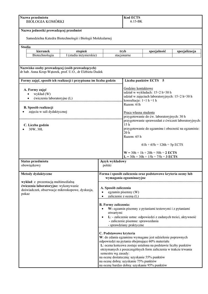 Nazwa przedmiotu Kod ECTS 6.15-BK BIOLOGIA KOMÓRKI Nazwa jednostki prowadzącej przedmiot Samodzielna Katedra Biotechnologii i Biologii Molekularnej Studia kierunek Biotechnologia stopień I (studia inżynierskie) tryb stacjonarne specjalność specjalizacja Nazwisko osoby prowadzącej (osób prowadzących) dr hab. Anna Krop-Wątorek, prof. U.O., dr Elżbieta Dudek Formy zajęć, sposób ich realizacji i przypisana im liczba godzin A. Formy zajęć • wykład (W) • ćwiczenia laboratoryjne (L) B. Sposób realizacji • zajęcia w sali dydaktycznej C. Liczba godzin • 30W, 30L Liczba punktów ECTS 5 Godziny kontaktowe udział w wykładach: 15×2 h=30 h udział w zajęciach laboratoryjnych: 15×2 h=30 h konsultacje: 1×1 h =1 h Razem: 61h Praca własna studenta przygotowanie do ćw. laboratoryjnych: 30 h przygotowanie sprawozdań z ćwiczeń laboratoryjnych: 15 h przygotowanie do egzaminu i obecność na egzaminie: 20 h Razem: 65 h 61h + 65h = 126h = 5p ECTS Status przedmiotu obowiązkowy Metody dydaktyczne wykład: z prezentacją multimedialną ćwiczenia laboratoryjne: wykonywanie doświadczeń, obserwacje mikroskopowe, dyskusja, pokaz W = 30h + 1h + 20h = 50h = 2 ECTS L = 30h + 30h + 15h = 75h = 3 ECTS Język wykładowy polski Forma i sposób zaliczenia oraz podstawowe kryteria oceny lub wymagania egzaminacyjne A. Sposób zaliczenia • egzamin pisemny (W) • zaliczenie z oceną (L) B. Formy zaliczenia: • W: egzamin pisemny z pytaniami testowymi i z pytaniami otwartymi • L: - zaliczenie ustne: odpowiedzi z zadanych treści, aktywność - zaliczenie pisemne: sprawozdania - sprawdziany praktyczne C. Podstawowe kryteria W: do zdania egzaminu wymagane jest udzielenie poprawnych odpowiedzi na pytania obejmujące 60% materiału L: ocena końcowa zostaje ustalona na podstawie liczby punktów otrzymanych z poszczególnych form zaliczenia w trakcie trwania semestru wg zasady: na ocenę dostateczną: uzyskanie 55% punktów na ocenę dobrą: uzyskanie 75% punktów na ocenę bardzo dobrą: uzyskanie 95% punktów Określenie przedmiotów wprowadzających wraz z wymogami wstępnymi A. Wymagania formalne: brak B. Wymagania wstępne: wiedza ogólna z zakresu biologii, chemii i fizyki, zrozumienie instrukcji do ćwiczeń Cele przedmiotu Zapoznanie studentów z budową i funkcją elementów składowych komórki pro- i eukariotycznej. Zapoznanie z metodami cytologicznymi stosowanymi w badaniach struktury i ultrastruktury komórek. Wskazanie zależności pomiędzy strukturą i funkcją komórek. Treści programowe A. Problematyka wykładu: Wprowadzenie obejmuje: formy życia na tle okresów geologicznych Ziemi; omówienie ewolucyjnego drzewa życia; odkrycie komórki i założenia komórkowej teorii budowy organizmów; chronologia poznawania elementów morfotycznych komórki w powiązaniu z rozwojem mikroskopii; dowód Ludwika Pasteur’a zaprzeczający spontaniczności powstawania życia. W dalszej części wykładów prezentowany jest udział pierwiastków naturalnych w materii ożywionej, odczyn pH, właściwości wody i jej wpływ na właściwości lipidów i białek; przepływ wody przez błony biologiczne (akwaporyna); wiązania chemiczne w biomolekułach. Kolejne wykłady poświęcone są chemii życia, obejmują budowę i właściwości aminokwasów, białek (lipoprotein, glikoprotein i proteoglikanów) polisacharydów, fosfolipidów, oraz organizacja błon komórkowych. Końcowa część dotyczy typów organizacji komórkowej (Prokariota, Eukariota), organelli komórek eukariotycznych ze szczególnym uwzględnieniem zależności struktura a funkcja. Wykłady podsumowane są ogólnym zobrazowaniem topografii procesów metabolicznych w komórce. B. Problematyka zajęć laboratoryjnych: Wybrane metody stosowane w analizie cytologicznej (aparatura, przyrządy i techniki badawcze). Budowa komórki na poziomie mikro- i ultrastrukturalnym, właściwości i funkcje organelli komórek eukariotycznych. Cykl komórkowy, komórki macierzyste, różnicowanie, śmierć komórki. Praktyczne wykorzystanie zagadnień biologii komórki w biotechnologii (technika kultur in vitro), medycynie (analiza cytogenetyczna), biologii eksperymentalnej (wykrywanie śmierci komórki). Wykaz literatury A. Literatura wymagana do ostatecznego zaliczenia zajęć (zdania egzaminu): A.1. wykorzystywana podczas zajęć • Oryginalny cykl wykładów „Biologia Komórki” przygotowany przez wykładowcę • Arnold JRP., Fisher J., Krótkie wykłady, Chemia dla biologów, PWN, Warszawa 2008 • Solomon EP., Berg LR.., Martin DW., Villee CA., Biologia, Wydawnictwo MULTICO, Warszawa 2007 • Berg J.M, Tymoczko J.L., Stryer L. Biochemia, PWN, Warszawa 2009 • Welsch U. Atlas histologii Sobotta. red. M. Zabel, Wyd. IV. polskie, Urban & Partner, Wrocław 2002 • Kuehnel W. Color Atlas of Cytology, Histology and Microscopic Anatomy. Wyd.IV., Wydawnictwo Thieme, Stuttgart 2003 • Sawicki W. Mianownictwo histologiczne i cytofizjologiczne polskie, angielskie, łacińskie. Wyd. I., PZWL, Warszawa 1998 • Instrukcje do ćwiczeń. A.2. studiowana samodzielnie przez studenta • Alberts B. i wsp. Podstawy Biologii Komórki, Wydawnictwo Naukowe PWN SA, Wyd. II. (dodruk), Warszawa 2009 • Kawiak J. (red.) Seminaria z cytofizjologii. Podręcznik dla studentów medycyny, weterynarii i biologii. Wydawnictwo Medyczne Urban & Partner, Wyd. I. (dodruk), Wrocław 2008 • Kilarski W. Strukturalne podstawy biologii komórki. Wydawnictwo Naukowe PWN SA, Wyd.I. (dodruk), Warszawa 2012 B. Literatura uzupełniająca • Kłyszejko-Stefanowicz L. „Cytobiochemia: biochemia niektórych struktur komórkowych”, Wyd. III., PWN SA, Warszawa 2002 • Stokłosowa St. „Hodowla komórek i tkanek”, Wydawnictwo Naukowe PWN SA, Warszawa 2004 • Malepszy S. (red.), „Biotechnologia roślin” Wydawnictwo Naukowe PWN SA, Wydanie II. zmienione, Warszawa 2009 • Artykuły tematyczne z czasopism naukowych, opublikowane w ciągu ostatnich 5 lat Efekty ksz