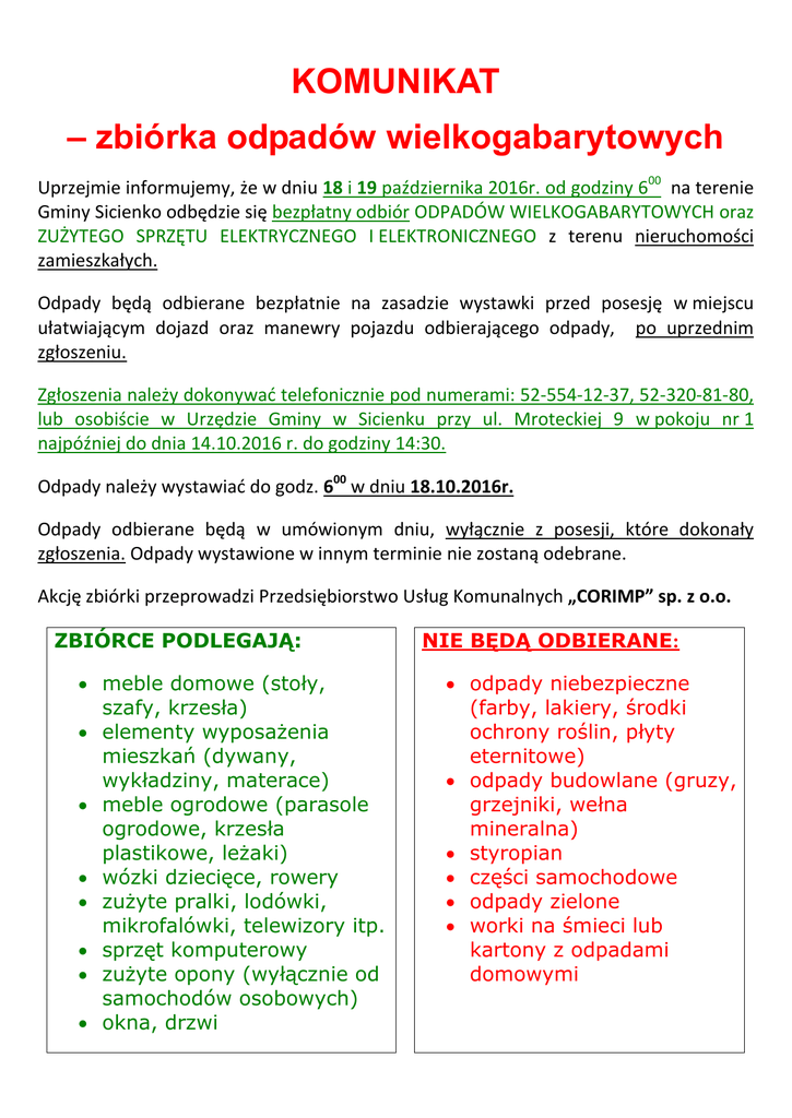 KOMUNIKAT – zbiórka odpadów wielkogabarytowych Uprzejmie informujemy, że w dniu 18 i 19 października 2016r. od godziny 600 na terenie Gminy Sicienko odbędzie się bezpłatny odbiór ODPADÓW WIELKOGABARYTOWYCH oraz ZUŻYTEGO SPRZĘTU ELEKTRYCZNEGO I ELEKTRONICZNEGO z terenu nieruchomości zamieszkałych. Odpady będą odbierane bezpłatnie na zasadzie wystawki przed posesję w miejscu ułatwiającym dojazd oraz manewry pojazdu odbierającego odpady, po uprzednim zgłoszeniu. Zgłoszenia należy dokonywać telefonicznie pod numerami: 52-554-12-37, 52-320-81-80, lub osobiście w Urzędzie Gminy w Sicienku przy ul. Mroteckiej 9 w pokoju nr 1 najpóźniej do dnia 14.10.2016 r. do godziny 14:30. Odpady należy wystawiać do godz. 600 w dniu 18.10.2016r. Odpady odbierane będą w umówionym dniu, wyłącznie z posesji, które dokonały zgłoszenia. Odpady wystawione w innym terminie nie zostaną odebrane. Akcję zbiórki przeprowadzi Przedsiębiorstwo Usług Komunalnych „CORIMP” sp. z o.o. ZBIÓRCE PODLEGAJĄ: meble domowe (stoły, szafy, krzesła) elementy wyposażenia mieszkań (dywany, wykładziny, materace) meble ogrodowe (parasole ogrodowe, krzesła plastikowe, leżaki) wózki dziecięce, rowery zużyte pralki, lodówki, mikrofalówki, telewizory itp. sprzęt komputerowy zużyte opony (wyłącznie od samochodów osobowych) okna, drzwi NIE BĘDĄ ODBIERANE: odpady niebezpieczne (farby, lakiery, środki ochrony roślin, płyty eternitowe) odpady budowlane (gruzy, grzejniki, wełna mineralna) styropian części samochodowe odpady zielone worki na śmieci lub kartony z odpadami domowymi