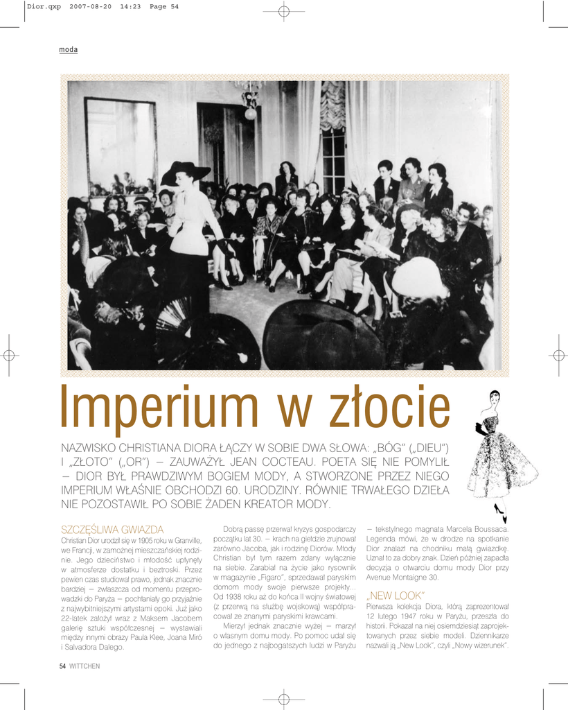 Dior.qxp 2007-08-20 14:23 Page 54 moda Imperium w złocie NAZWISKO CHRISTIANA DIORA ŁĄCZY W SOBIE DWA SŁOWA: „BÓG” („DIEU”) I „ZŁOTO” („OR”) ZAUWAŻYŁ JEAN COCTEAU. POETA SIĘ NIE POMYLIŁ DIOR BYŁ PRAWDZIWYM BOGIEM MODY, A STWORZONE PRZEZ NIEGO IMPERIUM WŁAŚNIE OBCHODZI 60. URODZINY. RÓWNIE TRWAŁEGO DZIEŁA NIE POZOSTAWIŁ PO SOBIE ŻADEN KREATOR MODY. SZCZĘŚLIWA GWIAZDA Christian Dior urodził się w 1905 roku w Granville, we Francji, w zamożnej mieszczańskiej rodzinie. Jego dzieciństwo i młodość upłynęły w atmosferze dostatku i beztroski. Przez pewien czas studiował prawo, jednak znacznie bardziej zwłaszcza od momentu przeprowadzki do Paryża pochłaniały go przyjaźnie z najwybitniejszymi artystami epoki. Już jako 22-latek założył wraz z Maksem Jacobem galerię sztuki współczesnej wystawiali między innymi obrazy Paula Klee, Joana Miró i Salvadora Dalego. 54 WITTCHEN Dobrą passę przerwał kryzys gospodarczy początku lat 30. krach na giełdzie zrujnował zarówno Jacoba, jak i rodzinę Diorów. Młody Christian był tym razem zdany wyłącznie na siebie. Zarabiał na życie jako rysownik w magazynie „Figaro”, sprzedawał paryskim domom mody swoje pierwsze projekty... Od 1938 roku aż do końca II wojny światowej (z przerwą na służbę wojskową) współpracował ze znanymi paryskimi krawcami. Mierzył jednak znacznie wyżej marzył o własnym domu mody. Po pomoc udał się do jednego z najbogatszych ludzi w Paryżu tekstylnego magnata Marcela Boussaca. Legenda mówi, że w drodze na spotkanie Dior znalazł na chodniku małą gwiazdkę. Uznał to za dobry znak. Dzień później zapadła decyzja o otwarciu domu mody Dior przy Avenue Montaigne 30. „NEW LOOK” Pierwsza kolekcja Diora, którą zaprezentował 12 lutego 1947 roku w Paryżu, przeszła do historii. Pokazał na niej osiemdziesiąt zaprojektowanych przez siebie modeli. Dziennikarze nazwali ją „New Look”, czyli „Nowy wizerunek”. Dior.qxp 2007-08-20 14:23 Page 55 Ale było to coś znacznie więcej. Wykreowane przez Diora stroje zrobiły w ówczesnej modzie totalną rewolucję. W zgrzebnej, powojennej epoce, zdominowanej przez bezkształtną, niemal męską sylwetkę kobiety rekruta, ubranej w wąską spódnicę i ciężkie buty, Dior powołał do życia kobietę kwiat. Przywrócił jej talię i biust, ubrał w rozkloszowane, wirujące spódnice tuż za kolano... Luksus, romantyzm, aura beztroski i przepychu trudno było przejść obok tego obojętnie. Zachwyty mieszały się z głosami oburzenia konserwatystów. Suknie sprzedały się w 10 tys. egzemplarzy. Z dnia na dzień 42-letniego kreatora okrzyknięto „krawcem stulecia”, który z kobiety na powrót uczynił kobietę, z Paryża zaś niekwestionowaną stolicę mody. Wyparł z rynku odzieżowego Amerykanów, a europejska branża tekstylna zaczęła rozkwitać. Nic dziwnego na jedną suknię Diora potrzeba było 15 metrów tkaniny... WŁADZA ABSOLUTNA Królował tylko przez dziesięć lat. Jednak były to lata władzy absolutnej Christian Dior stał się dyktatorem mody w dosłownym tego słowa znaczeniu. Był nie tylko wizjonerem miał również talent do interesów, bez czego stworzenie imperium na tak wielką skalę nie byłoby chyba możliwe. Wiedział, co oznaczają słowa „marka” i „reklama”, ze swoimi kolekcjami wyruszał na światowe tournée, otwierał butiki w Londynie, Nowym Jorku, a nawet w Australii. Jego oferta nieustannie się powiększała: swoim nazwiskiem firmował pończochy, biżuterię, torebki i buty... Już w 1947 roku, przy okazji pierwszej kolekcji, powstały perfumy Miss Dior świeży i jednocześnie ciepły zapach, będący esencją stylu „New Look”. Rok 1955 przyniósł z kolei równie słynną czerwoną szminkę Rouge Dior. W 1957 roku ponad połowa kreacji eksportowanych przez francuskie domy mody pochodziła od Diora realizował dwa i pół tysiąca zamówień rocznie. Ubierały się u niego arystokratki i gwiazdy, m.in. księżna Windsoru, księżniczka Grace i Evita Perón, Marlena Dietrich, Rita Hayworth i Ava Gardner. Jego kreacje podbiły cały świat. Narzucał niesłychane tempo wiedział, że moda nie może stać w miejscu, jedna jego kolekcja wypierała więc poprzednią. Dior konkurował jedynie sam ze sobą. Zofia Sawicka CHRISTIAN DIOR Fot. Dom Mody Dior Christian Dior zmarł na zawał serca 24 października 1957 roku we Włoszech. Jednak imperium Diora nie upadło. Następcą Christiana w naturalny sposób został jego pierwszy i jedyny asystent Yves Saint-Laurent. Przez lata potęgę najsłynniejszego na świecie domu mody tworzyli kolejni wielcy kreatorzy, wśród nich takie sławy, jak Gianfranco Ferré czy John Galliano... Christian Dior wytyczył drogę, którą podążyli inni. W styczniu 2004 roku stworzone przez niego imperium zatrudniało równo 2004 osoby. Trudno o wymowniejszy znak. WITTCHEN 55