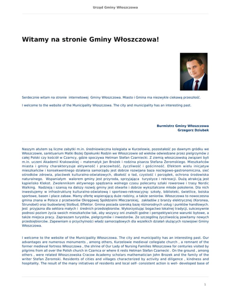 Urząd Gminy Włoszczowa Witamy na stronie Gminy Włoszczowa! Serdecznie witam na stronie internetowej Gminy Włoszczowa. Miasto i Gmina ma niezwykle ciekawą przeszłość. I welcome to the website of the Municipality Wloszczowa. The city and municipality has an interesting past. Burmistrz Gminy Włoszczowa Grzegorz Dziubek Naszym atutem są liczne zabytki m.in. średniowieczna kolegiata w Kurzelowie, pozostałość po dawnym gródku we Włoszczowie, sanktuarium Matki Bożej Opiekunki Rodzin we Włoszczowie od wieków odwiedzane przez pielgrzymów z całej Polski czy kościół w Czarncy, gdzie spoczywa Hetman Stefan Czarniecki. Z ziemią włoszczowską związani byli m.in. uczeni Akademii Krakowskiej – matematyk Jan Brożek i rodzina pisarza Stefana Żeromskiego. Mieszkańców miasta i gminy charakteryzuje aktywność i pracowitość, życzliwość i gościnność. Efektem wielu inicjatyw mieszkańców i konsekwentnego działania samorządu jest dobrze rozwijana baza noclegowo-gastronomiczna, sieć ośrodków zdrowia, placówek kulturalno-oświatowych, dbałość o ład, czystość i porządek, ochrona środowiska naturalnego. Wspaniałym walorem gminy jest przyroda, sprzyjająca turystyce i rekreacji. Dużą atrakcją jest kąpielisko Klekot. Zwolennikom aktywnego spędzania wolnego czasu polecamy szlaki rowerowe i trasy Nordic Walking. Nadzieją i szansą na dalszy rozwój gminy jest otwarte i dobrze wykształcone młode pokolenie. Dla nich inwestujemy w infrastrukturę kulturalno-oświatową i sportowo-rekreacyjną: szkoły, biblioteki, świetlice, boiska sportowe, basen i place zabaw. Mamy ofertę wspierającą duże rodziny, a także seniorów. Włoszczowa to nowoczesna gmina znana w Polsce z przetworów Okręgowej Spółdzielni Mleczarskiej, zakładów z branży elektrycznej (Koronea, Strunobet) oraz budowlanej Stolbud, Effektor. Gmina posiada szeroką bazę różnorodnych usług i punktów handlowych. Jest przyjazna dla sektora małych i średnich przedsiębiorstw. Wykorzystując bogactwo lokalnej tradycji, sukcesywnie podnosi poziom życia swoich mieszkańców tak, aby wszyscy oni znaleźli godne i perspektywiczne warunki bytowe, a także miejsca pracy. Zapraszam turystów, pielgrzymów i inwestorów. Ze szczególną życzliwością powitamy nowych przedsiębiorców. Zapewniam o przychylności władz samorządowych dla wszelkich działań służących rozwojowi Gminy Włoszczowa. I welcome to the website of the Municipality Włoszczowa. The city and municipality has an interesting past. Our advantages are numerous monuments , among others, Kurzelowie medieval collegiate church , a remnant of the former medieval fortress Włoszczowa , the shrine of Our Lady of Nursing Families Włoszczowa for centuries visited by pilgrims from all over the Polish church in Czarnca or where it rests Hetman Stefan Czarnecki . On the ground , among others , were related Włoszczowska Cracow Academy scholars mathematician John Brozek and the family of the writer Stefan Żeromski. Residents of cities and villages characterized by activity and diligence , kindness and hospitality. The result of the many initiatives of residents and local self- consistent action is well- developed base of 1 Urząd Gminy Włoszczowa accommodation and catering , a network of health centers , cultural and educational institutions , care of order, cleanliness and order , protection of the environment. Great advantage of the municipality is the natural setting, tourism and recreation. The big attraction is the swimming pool Klekot . Supporters of active leisure and cycling trails can Nordic Walking routes . Hope and opportunity for further development of the municipality is open and well -educated young generation . For them to invest in the cultural and educational infrastructure and sports and recreation facilities : schools , libraries , community centers , sports fields , swimming pool and playgrounds . We offer support large families , and seniors. Włoszczowa is a modern municipality known in Poland from the District Cooperative Dairy milk , plant electrical industry ( Koronea , Strunobet ) and construction Stolbud , Effektor. The municipality has a broad base of diverse services and retail outlets . Is friendly for small and medium-sized enterprises . Using a wealth of local traditions and gradually improve the lives of its citizens so that they all found a worthy and long-term living conditions , as well as jobs. I invite tourists , pilgrims and investors. With special kindness to welcome new entrepreneurs . I assure you of the favor of local government for any action for the development of the Municipality Włoszczowa . 2