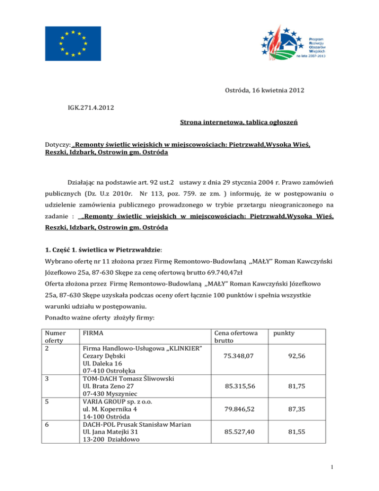 Ostróda, 16 kwietnia 2012 IGK.271.4.2012 Strona internetowa, tablica ogłoszeń Dotyczy: „Remonty świetlic wiejskich w miejscowościach: Pietrzwałd,Wysoka Wieś, Reszki, Idzbark, Ostrowin gm. Ostróda Działając na podstawie art. 92 ust.2 ustawy z dnia 29 stycznia 2004 r. Prawo zamówień publicznych (Dz. U.z 2010r. Nr 113, poz. 759. ze zm. ) informuję, że w postępowaniu o udzielenie zamówienia publicznego prowadzonego w trybie przetargu nieograniczonego na zadanie : „Remonty świetlic wiejskich w miejscowościach: Pietrzwałd,Wysoka Wieś, Reszki, Idzbark, Ostrowin gm. Ostróda 1. Część 1. świetlica w Pietrzwałdzie: Wybrano ofertę nr 11 złożona przez Firmę Remontowo-Budowlaną ,,MAŁY” Roman Kawczyński Józefkowo 25a, 87-630 Skępe za cenę ofertową brutto 69.740,47zł Oferta złożona przez Firmę Remontowo-Budowlaną ,,MAŁY” Roman Kawczyński Józefkowo 25a, 87-630 Skępe uzyskała podczas oceny ofert łącznie 100 punktów i spełnia wszystkie warunki udziału w postępowaniu. Ponadto ważne oferty złożyły firmy: Numer oferty 2 3 5 6 FIRMA Firma Handlowo-Usługowa ,,KLINKIER” Cezary Dębski Ul. Daleka 16 07-410 Ostrołęka TOM-DACH Tomasz Śliwowski Ul. Brata Zeno 27 07-430 Myszyniec VARIA GROUP sp. z o.o. ul. M. Kopernika 4 14-100 Ostróda DACH-POL Prusak Stanisław Marian Ul. Jana Matejki 31 13-200 Działdowo Cena ofertowa brutto punkty 75.348,07 92,56 85.315,56 81,75 79.846,52 87,35 85.527,40 81,55 1 7 8 9 12 13 14 15 Szymon Olszewski CEKMAL ul. Warszawska 27/15 13-100 Nidzica MONSTER s.c. Piotr Roskosz, Krzysztof Sobota Ul. Słoneczna 19 10-709 Olsztyn ADR BUD Wojciech Barański Usługi Remontowo-Budowlane Ul. Kościuszki 1/35 13-100 Nidzica Zakład Ogólno-Budowlany Piotr Buczkowski 14-107 Gierzwałd 42/2 PBC Jarosław Czyczyn Ruś 127 10-687 Olsztyn TERC-BUD Przedsiębiorstwo HandlowoUsługowe Henryk Tercjak Grabinek 21a 14-106 Szyldak DANFARM Danuta Bartnicka-Karpacz, Robert Karpacz sp.j. ul. Warmińska 31 14-300 Morąg 83.863,75 83,16 74.415,70 93,72 83.273,68 83,75 88.263,00 79,02 105.262,74 66,26 87.865,22 79,38 95.628,12 72,93 2. Część 2. świetlica w Wysokiej Wsi. Wybrano ofertę nr 5 złożoną przez VARIA GROUP sp. z o.o. ul. M. Kopernika 4 , 14-100 Ostróda, za cenę ofertowa brutto 62.706,08zł. Oferta złożona przez Firmę VARIA GROUP sp. z o.o. ul. M. Kopernika 4 14-100 Ostróda uzyskała podczas oceny ofert łącznie 100 punktów i spełnia wszystkie warunki udziału w postępowaniu. Ponadto ważne oferty złożyły firmy: Numer FIRMA oferty 2 Firma Handlowo-Usługowa ,,KLINKIER” Cezary Dębski Ul. Daleka 16 07-410 Ostrołęka 3 TOM-DACH Tomasz Śliwowski Ul. Brata Zeno 27 07-430 Myszyniec 6 DACH-POL Prusak Stanisław Marian Ul. Jana Matejki 31 13-200 Działdowo 8 MONSTER s.c. Piotr Roskosz, Krzysztof Sobota Ul. Słoneczna 19 10-709 Olsztyn Cena ofertowa brutto Punkty 62.755,65 99,93 76.620,66 81,84 89.919,86 69,74 72.289,51 86,75 2 9 11 12 13 14 15 ADR BUD Wojciech Barański Usługi Remontowo-Budowlane Ul. Kościuszki 1/35 13-100 Nidzica Firma Remontowo-Budowlana ,,MAŁY” Roman Kawczyński Józefkowo 25a 87-630 Skępe Zakład Ogólno-Budowlany Piotr Buczkowski 14-107 Gierzwałd 42/2 PBC Jarosław Czyczyn Ruś 127 10-687 Olsztyn TERC-BUD Przedsiębiorstwo HandlowoUsługowe Henryk Tercjak Grabinek 21a 14-106 Szyldak DANFARM Danuta Bartnicka-Karpacz, Robert Karpacz sp.j. ul. Warmińska 31 14-300 Morąg 73.847,76 84,92 64.497,23 97,23 78.050,23 80,34 95.879,67 65,40 64.547,15 97,15 79.390,52 78,99 3. Część 3. świetlica w Reszkach. Wybrano ofertę nr 2 złożoną przez Firmę Handlowo-Usługową ,,KLINKIER” Cezary Dębski Ul. Daleka 16,07-410 Ostrołęka, za cenę ofertową brutto 19.591,83 zł . Oferta złożona przez Firmę Handlowo-Usługową ,,KLINKIER” Cezary Dębski, ul. Daleka 16,07-410 Ostrołęka uzyskała podczas oceny ofert łącznie 100 punktów i spełnia wszystkie warunki udziału w postępowaniu. Ponadto ważne oferty złożyły firmy: Numer FIRMA oferty 1 ,,FLAMBUD” Tomasz Truszczyński Ul. Topolowa 31 13-220 Rybno 3 TOM-DACH Tomasz Śliwowski Ul. Brata Zeno 27 07-430 Myszyniec 5 VARIA GROUP sp. z o.o. ul. M. Kopernika 4 14-100 Ostróda 6 DACH-POL Prusak Stanisław Marian Ul. Jana Matejki 31 13-200 Działdowo 8 MONSTER s.c. Piotr Roskosz, Krzysztof Sobota Ul. Słoneczna 19 10-709 Olsztyn 9 ADR BUD Wojciech Barański Usługi Remontowo-Budowlane Ul. Kościuszki 1/35 Cena ofertowa brutto Punkty 25.204,45 77,74 34.336,63 57,06 23.887,82 82,02 40.689,19 43,84 21.420,99 91,46 37.722,51 51,94 3 11 12 13 14 15 16 17 13-100 Nidzica Firma Remontowo-Budowlana ,,MAŁY” Roman Kawczyński Józefkowo 25a 87-630 Skępe Zakład Ogólno-Budowlany Piotr Buczkowski 14-107 Gierzwałd 42/2 PBC Jarosław Czyczyn Ruś 127 10-687 Olsztyn TERC-BUD Przedsiębiorstwo HandlowoUsługowe Henryk Tercjak Grabinek 21a 14-106 Szyldak DANFARM Danuta Bartnicka-Karpacz, Robert Karpacz sp.j. ul. Warmińska 31 14-300 Morąg Przedsiębiorstwo Usługowo-Handlowe AS Andrzej Siwczak Kajkowo, ul. Henrykowska 26 14-100 Ostróda Usługi Budowlane ,,2xR-GRUPA” Radosław Biesiada Ul. Marii Konopnickiej 12b lok. 32 13-100 Nidzica 23.073,91 84,91 29.144,83 67,23 30.683,36 63,86 22.089,90 88,70 31.029,06 63,14 21.697,46 90,30 31.680,95 61,85 4. Część4. świetlica w Idzbarku. Wybrano ofertę nr 8 złożoną przez Firmę MONSTER s.c. Piotr Roskosz, Krzysztof Sobota ul. Słoneczna 19 ,10-709 Olsztyn, za cenę ofertową brutto 36.648,81 zł . Oferta złożona przez Firmę MONSTER s.c. Piotr Roskosz, Krzysztof Sobota, ul. Słoneczna 19 ,10-709 Olsztyn uzyskała podczas oceny ofert łącznie 100 punktów i spełnia wszystkie warunki udziału w postępowaniu. Ponadto ważne oferty złożyły firmy: Numer FIRMA oferty 2 3 5 6 Firma Handlowo-Usługowa ,,KLINKIER” Cezary Dębski Ul. Daleka 16 07-410 Ostrołęka TOM-DACH Tomasz Śliwowski Ul. Brata Zeno 27 07-430 Myszyniec VARIA GROUP sp. z o.o. ul. M. Kopernika 4 14-100 Ostróda DACH-POL Prusak Stanisław