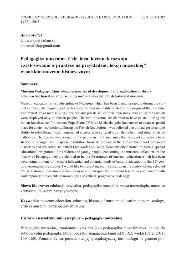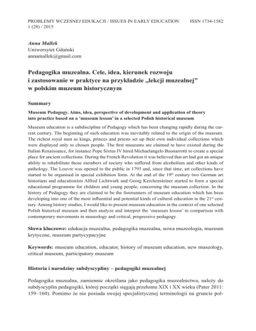 PROBLEMY WCZESNEJ EDUKACJI / ISSUES IN EARLY EDUCATION 1 (28) / 2015 ISSN 1734-1582 Anna Mallek Uniwersytet Gdański [email protected] Pedagogika muzealna. Cele, idea, kierunek rozwoju i zastosowanie w praktyce na przykładzie „lekcji muzealnej” w polskim muzeum historycznym Summary Museum Pedagogy. Aims, idea, perspective of development and application of theory into practice based on a ‘museum lesson’ in a selected Polish historical museum Museum education is a subdiscipline of Pedagogy which has been changing rapidly during the current century. The beginning of such education was inevitably related to the origin of the museum. The richest royal men as kings, princes and priests set up their own individual collections which were displayed only to chosen people. The first museums are claimed to have existed during the Italian Renaissance, for instance Pope Sixtus IV hired Michaelangelo Buonarrotti to create a special place for ancient collections. During the French Revolution it was believed that art had got an unique ability to rehabilitate those members of society who suffered from alcoholism and other kinds of pathology. The Louvre was opened to the public in 1793 and, since that time, art collections have started to be organised in special exhibition form. At the end of the 19th century two German art historians and educationists Alfred Lichtwark and Georg Kerchensteiner started to form a special educational programme for children and young people, concerning the museum collection. In the history of Pedagogy they are claimed to be the forerunners of museum education which has been developing into one of the most influential and potential kinds of cultural education in the 21st century. Among history studies, I would like to present museum education in the context of one selected Polish historical museum and then analyze and interpret the ‘museum lesson’ in comparison with contemporary movements in museology and critical, progressive pedagogy. Słowa kluczowe: edukacja muzealna, pedagogika muzealna, nowa muzeologia, muzeum krytyczne, muzeum partycypacyjne Keywords: museum education, educator, history of museum education, new museology, critical museum, participatory museum Historia i narodziny subdyscypliny – pedagogiki muzealnej Pedagogika muzealna, zamiennie określana jako pedagogika muzealnictwa, należy do subdyscyplin pedagogiki, której początki sięgają przełomu XIX i XX wieku (Pater 2011: 159–160). Pomimo że nie posiada swojej specjalistycznej terminologii na gruncie pol- Pedagogika muzealna. Cele, idea, kierunek rozwoju i zastosowanie w praktyce… 115 skiej nauki1, w krajach zachodnich zyskała status dyscypliny naukowej2. Zapotrzebowanie na edukację poprzez muzea wyrosło z idei oświeceniowej równości w dostępie do sztuki. Dotychczas tylko najbogatsi władcy świeccy i duchowni posiadali bogate kolekcje, zamknięte w komnatach zwanych gabinetami osobliwości, bądź kunstkammerami, które powstawały systematycznie od czasu renesansu (Popczyk 2008: 54–55). Tylko nieliczni, specjalnie zaproszeni goście właściciela kolekcji mieli dostęp do tych zbiorów. Do tego typu zbiorów należy z pewnością kolekcja papieska zapoczątkowana przez Sykstusa IV, do prezentacji której Michał Anioł zaprojektował w 1471 roku specjalne wnętrza. Można do nich zaliczyć także zbiór księcia Władysława IV Wazy z początku XVII wieku, który symbolicznie uwiecznił na płótnie holenderski malarz Etienne de la Hire w 1626 roku (ryc. 1). Ryc. 1. Etienne de la Hire, Obraz przedstawiający kolekcję księcia Władysława IV Wazy, 1626 (Zamek Królewski w Warszawie) Źródło: wikipedia.org. 1 Nie znalazłam pojęcia edukacja muzealna, pedagogika muzealna itp. w słownikach pedagogicznych, m. in. pod red. W. Okonia, Cz. Kupisiewicza. 2 Edukacja muzealna jest jednym z dostępnych kierunków na muzealniczych studiach w krajach zachodnich, w Polsce dopiero rozwija się pomysł stworzenia takowej specjalizacji na kierunku Historia sztuki. Natomiast na kierunkach pedagogicznych można już takie specjalizacje spotkać, np. Animacja kultury i edukacja muzealna w Dolnośląskiej Szkole Wyższej https://rekrutacja.dsw.edu.pl/katalog.php?op=info&id=pe-akiem-In [dostęp z dnia 7 lutego 2015]. 116 Anna Mallek Sytuacja dzieł sztuki, charakter ich przechowywania i gromadzenia zaczął się diametralnie zmieniać w epoce oświecenia w wyniku zachodzących przewrotów polityczno-społecznych oraz reform w oświacie. Podczas rewolucji francuskiej w 1793 roku największy odsetek zabytkowych sakralnych obiektów, będących uosobieniem hegemonicznej władzy kościoła nad ludem, został zdewastowany przez zbuntowane społeczeństwo. Jednocześnie francuski publicysta i pisarz la Font De Saint-Yenne nawoływał do konieczności uwolnienia skarbów kultury francuskiej z zamkniętych przestrzeni prywatnych kolekcji (Szeląg, Skutnik 2010: 8). Twierdzono, że królewska własność, na którą składały się obiekty artystyczne przechowywane przede wszystkim w Luwrze, będące spuścizną francuskiej i europejskiej kultury materialnej, sprawi, że oddana w ręce społeczeństwa zmniejszy drastycznie rosnący alkoholizm oraz inne szerzące się patologie społeczne. W podobnym celu angielska książęca para, Wiktoria i Albert, udostępniła własną kolekcję, wierząc, że zamiast chodzić do pubów, angielska klasa robotnicza w wolne dni i święta będzie przychodzić do muzeum3. Obcowanie z dziełami sztuki miało mieć walor edukacyjno-prewencyjny (Szeląg 2013: 7–8). Niecałe pół wieku wcześniej, jeszcze przed Francuzami, bogaty lekarz angielski, sir Hans Sloane przekazał swoją kolekcję dzieł sztuki miastu, dając zaczątek British Museum. Jednocześnie zastrzegł, że muzeum ma być miejscem dostępnym dla całego angielskiego społeczeństwa. Od tego czasu, w tempie błyskawicznym zaczęły powstawać muzea, upamiętniające historię narodu, budujące tożsamo
