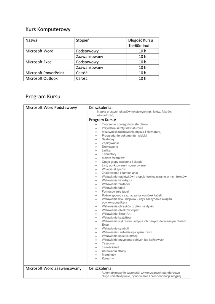 Kurs Komputerowy Nazwa Stopień Microsoft Word Podstawowy Zaawansowany Podstawowy Zaawansowany Całośd Całośd Microsoft Excel Microsoft PowerPoint Microsoft Outlook Długośd Kursu 1h=60minut 10 h 10 h 10 h 10 h 10 h 10 h Program Kursu Microsoft Word Podstawowy Cel szkolenia: Nauka prostych układów tekstowych np. listów, faksów, oświadczeń, Program Kursu: Tworzenie nowego formatu plików Przydatne skróty klawiaturowe Możliwości zaznaczania myszą i klawiaturą Przeglądanie dokumentu i widoki Szablony Zapisywanie Drukowanie Linijka Tabulatory Malarz formatów Opcje grupy czcionka i akapit Listy punktowane i numerowane Wcięcia akapitów Znajdowanie i zamienianie Wstawianie nagłówków i stopek i umieszczanie w nich tekstów Wstawianie hiperłącza Wstawianie zakładek Wstawianie tabel Formatowanie tabel Różne sposoby zaznaczania komórek tabeli Wstawianie tzw. inicjałów - czyli zaczynanie akapitu powiększona literą Wstawianie obrazków z pliku na dysku Wstawianie obiektów clipart Wstawianie SmartArt Wstawianie kształtów Wstawianie wykresów i edycja ich danych dołączanym plikiem Excel Wstawianie symboli Wstawianie i aktualizacja spisu treści Wstawianie spisu ilustracji Wstawianie przypisów dolnych lub końcowych Tezaurus Tłumaczenia Ustawienia strony Marginesy Kolumny Microsoft Word Zaawansowany Cel szkolenia: Automatyzowanie czynności wykonywanych standardowo długo i nieefektywnie, opanowanie korespondencji seryjnej Program Kursu: Drukowanie kopert Drukowanie etykiet Korespondencja seryjna Tezaurus Tłumaczenia Sprawdzanie pisowni, gramatyki, stylu Lokalizacja słownika tworzonego przez użytkownika Dodawanie nowego słownika Autokorekta Motywy Ustawienia strony Marginesy Kolumny Tworzenie sekcji w dokumencie świadomie lub nieświadomie Wprowadzanie numeracji wierszy Ustalanie reguł dzielenia wyrazów - łącznik opcjonalny a łącznik nierozdzielający Znak wodny jako tło strony Kolory i obramowania strony Włączanie zakładki deweloper by tworzyć makra Visual Microsoft Excel Podstawowy Cel szkolenia: Nauczyć się wykonywać obliczenia w Ms Excel. Wykonywać kalkulacje w przykładowych listach, bazach danych obliczanie marży, vat, itp. Przygotowanie podstawowych tabel, wykresów Program Kursu: Podstawy : co to jest arkusz kalkulacyjny, pojęcia skoroszyt i arkusz, pojęcia komórka, wiersz, kolumna, pojęcia wstążka, zakładki, otwieranie, zapisywanie, ukrywanie. Odkrywanie Excela : więcej o interfejsie, przegląd opcji Excela, formatowanie komórek, wypełnianie serią, skróty klawiaturowe, zasady wprowadzania rekordów, tryb zastępowania i dopisywania, typy kursorów i zaznaczeń, operatory, interpretacja literałów, daty i godziny, zaznaczanie dużych tabel. Operacje bardziej zaawansowane : blokowanie komórek - adresowanie względne, bezwzględne i mieszane, formatowanie warunkowe, pisanie do wielu arkuszy, operacje na wielu arkuszach, proste zastosowanie funkcji JEŻELI(), pliki o tych samych nazwach, opcja wklej specjalnie, podstawy formatowania niestandardowego, znajdowanie i zamienianie, wstawianie nad arkusz, proste sortowanie i filtrowanie, zastosowanie funkcji SUMA.JEŻELI(), ochrona arkusza. Wykresy : kolumnowy grupowany 3W, liniowy ze znacznikami, skumulowany kolumnowy z efektem 3W, słupkowy grupowany z efektem 3W, kołowy rozsunięty z efektem 3W . Microsoft Excel Zaawansowany Cel Kursu Program Kursu: Podstawy i przypomnienie z kursu podstawowego: wstęp, na czym polega nowy format xlsx - rozbicie skoroszytu na pliczki xml, co to takiego skoroszyt binarny. Formatowanie niestandardowe : przypomnienie, jak po liczbie dopisać "szt", "kg", itp., składnia trzech średników. Istotne, zaawansowane opcje programu : tworzenie komentarzy do komórek, tworzenie nazw komórek i zarządzanie nazewnictwem, import do Excela z plików tekstowych, import do Excela ze stron internetowych, rozbijanie tekstu wpisanego w jednej kolumnie na wiele kolumn, inspekcja wprowadzonych formuł, opcje arkusza przydatne w dostosowaniu do wydruku, zaawansowane operacje na komórkach - przyrównywanie, suma rosnącego zakresu, zasady związane z datami, zaawansowane opcje wklejania specjalnego : przemnóż, szerokość kolumn, transpozycja, wklejanie łącza, wstawianie nad arkusz dokumentu MS WORD oraz wzorów matematycznych ( Microsoft Equation 3.0 ), wstawianie tabeli i jej właściwości, znajdowanie i zamiana formatowania. Kontrola arkusza, widoczności, wydruku, danych z wielu arkuszy : karta dane - poprawność danych, konsolidacja, grupowanie komórek, suma częściowa, śledzenie zmian, karta widok - widoki przydatne przy wydruku, blokada przewijania. Zaawansowane operacje na skoroszycie, arkuszu i funkcjach : rejestracja makra, operowanie funkcją na wielu arkuszach, zagnieżdżanie funkcji w innej funkcji na przykładzie funkcji JEŻELI - dwa praktyczne zadania. Funkcje tablicowe - zwracające tablicę liczb : zasady tworzenia formuły z funkcją tablicową. Funkcje matematyczne : funkcja matematyczna SUMA, funkcja matematyczna SUMA.JEŻELI, funkcja matematyczna ŚREDNIA.JEŻELI, funkcje matematyczne od wersji 2007, funkcja matematyczna ZAOKR, funkcja matematyczna MROUND, funkcje odcinające część ułamkową, funkcja matematyczna ILOCZYN. Funkcje statystyczne : funkcje statystyczne MIN, MAX, MIN.A, MAX.A, funkcja statystyczna MAX.K, funkcja statystyczna POZYCJA, funkcje statystyczne ŚREDNIA, ŚREDNIA.A, funkcja statystyczna MEDIANA, funkcja statystyczna LICZ.JEŻELI, funkcja statystyczna ILE.NIEPUSTYCH, funkcja statystyczna LICZ.PUSTE, funkcja statystyczna ILE.LICZB, funkcja statystyczna WYST.NAJCZĘŚCIEJ, funkcja statystyczna PERCENTYL, funkcja statystyczna CZĘSTOŚĆ - funkcja tablicowa. Funkcje daty i czasu : funkcja daty i czasu NETWORKDAYS, funkcje daty i czasu DZIŚ, ROK, TERAZ, DATA, funkcja daty i czasu CZAS, funkcja daty i czasu DZIEŃ.TYG, funkcje przekształcające daty w numer seryjny, funkcja daty i czasu DNI.360, funkcja daty i c