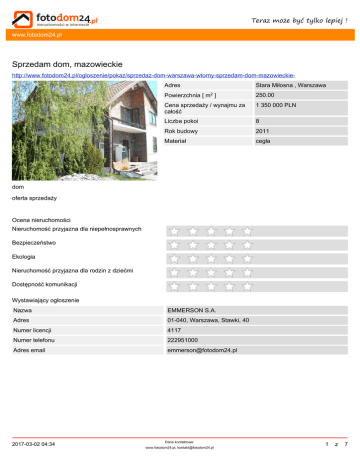 Teraz może być tylko lepiej ! www.fotodom24.pl Sprzedam dom, mazowieckie http://www.fotodom24.pl/ogloszenie/pokaz/sprzedaz-dom-warszawa-wtorny-sprzedam-dom-mazowieckieAdres Stara Miłosna , Warszawa Powierzchnia [ m2 ] 250.00 Cena sprzedaży / wynajmu za całość 1 350 000 PLN Liczba pokoi 8 Rok budowy 2011 Materiał cegła dom oferta sprzedaży Ocena nieruchomości Nieruchomość przyjazna dla niepełnosprawnych Bezpieczeństwo Ekologia Nieruchomość przyjazna dla rodzin z dziećmi Dostępność komunikacji Wystawiający ogłoszenie Nazwa EMMERSON S.A. Adres 01-040, Warszawa, Stawki, 40 Numer licencji 4117 Numer telefonu 222951000 Adres email [email protected] 2017-03-02 04:34 Dane kontaktowe: www.fotodom24.pl, [email protected] 1 z 7 Teraz może być tylko lepiej ! www.fotodom24.pl Lokalizacja Adres Województwo mazowieckie Powiat warszawski Miejscowość Warszawa Dzielnica Wesoła Ulica Stara Miłosna 2017-03-02 04:34 Dane kontaktowe: www.fotodom24.pl, [email protected] 2 z 7 Teraz może być tylko lepiej ! www.fotodom24.pl Parametry Dane szczegółowe Powierzchnia całkowita [ m2 ] 250 Liczba pokoi 8 Liczba pięter 1 Rok budowy 2011 Garaż wolnostojący Okna rodzaj Plastyk, Dane podstawowe Materiał 2017-03-02 04:34 cegła Dane kontaktowe: www.fotodom24.pl, [email protected] 3 z 7 Teraz może być tylko lepiej ! www.fotodom24.pl Opłaty Cena sprzedaży 1 350 000 PLN Cena sprzedazy Cena sprzedaży / m2 5 400 PLN Średnie koszty eksploatacji Media m-c 2017-03-02 04:34 0 Dane kontaktowe: www.fotodom24.pl, [email protected] 4 z 7 Teraz może być tylko lepiej ! www.fotodom24.pl Opis Wolnostojący dom jednorodzinny położony w bardzo ładnej spokojnej okolicy, przy kameralnej ,ślepej uliczce. W otoczeniu zabudowa jednorodzinna. Konstrukcja domu z 1992r, wszystkie instalacje, okna, dach -2011/2012.Dach- dachówka ceramiczna, rozprowadzone wszystkie instalacje łącznie z odkurzaczem centralnym,zakupiony solar do zamontowania. Na dole i w łazience na górze instalacje do ogrzewania podłogowego. Dom częściowo podpiwniczony- kotlłownia. Garaż wolnostojący na jeden samochód. Oryginalny projekt - na dole salon o wysokości ok. 6 m z oknami na jednej ścianie od podłogi do sufitu. Oprócz tego na dole - kuchnia,gabinet,łazienka,pralnia, sala kominkowa + powierzchnia na drugi salon lub np pracownię z bezpośrednim wyjściem do ogrodu. Na piętrze 4 pokoje + duża łazienka. Numer licencji pośrednika odpowiedzialnego zawodowo: 2599 2017-03-02 04:34 Dane kontaktowe: www.fotodom24.pl, [email protected] 5 z 7 Teraz może być tylko lepiej ! www.fotodom24.pl Galeria 2017-03-02 04:34 Dane kontaktowe: www.fotodom24.pl, [email protected] 6 z 7 Teraz może być tylko lepiej ! www.fotodom24.pl Notatki 2017-03-02 04:34 Dane kontaktowe: www.fotodom24.pl, [email protected] 7 z 7