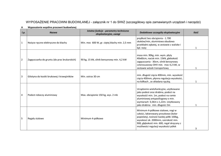 WYPOSAŻENIE PRACOWNI BUDOWLANEJ - załącznik nr 1 do SIWZ (szczegółowy opis zamawianych urządzeń i narzędzi) A Wyposażenie wspólne pracowni budowlanej l.p. 1 2 3 4 5 Nazwa Nożyce ręczne elektryczne do blachy Zagęszczarka do gruntu (do prac brukarskich) Gilotyna do kostki brukowej i krawężników Podest roboczy aluminiowy Regały stalowe Istotne funkcje - parametry techniczno eksploatacyjne, uwagi Min. moc 600 W, gr. ciętej blachy min. 2,5 mm 90 kg, 15 kN, silnik benzynowy min. 4,2 kW Min. ostrze 30 cm Max. obciążenie 150 kg, wys. 2 mb Minimum 4-półkowe Dodatkowe szczegóły eksploatacyjne Ilość prędkość bez obciążenia - 1.700 skoków/min, aluminiowa obudowa przekładni zębatej, w zestawie z walizke i kpl. noży 1 masa min. 90kg, min. wym. płyty 40x60cm, nacisk min. 15kN, głebokość zagęszczania - 30cm, silnik benzynowy czterosuwowy OHV min. moc 4,2 kW, w zestawie wózek transportowy 1 min. długość cięcia 400mm, min. wysokość cięcia 400mm, płynna regulacja wysokości, na kółkach , ze składana rączką. 1 Urządzenie wielofunkcyjne, użytkowane jako podest oraz drabina, podest na wysokośći min. 1m, podest na ramie aluminiowej antypoślizgowy o min. wymiarach 0,36m x 1,22m. Użytkowany jako drabina- min. długości 3m 1 Minimum 4-półkowe stalowe, nogi w całości, lakierowany proszkowo (kolor popielaty), nośność każdej półki 100kg, wysokosć ok. 2000mm, szerokość min. 900, głębokość min. 600, regał skręcany z możliwości regulacji wysokości półek 3 6 7 8 9 10 Zacieraczka do tynków Min. 500 W Rusztowanie elewacyjne ramowe Ocynkowane, typ lekki, dla powierzchni min. 50 m2, kompletne (ramy, stężenia, rygle, stopy, podesty, właz, kotwy, poręcze) z możliwością rozbudowy Betoniarka Teodolit optyczny ze statywem i osprzętem Niwelator optyczny ze statywem Min. 120 l, 550 W, wieniec żeliwny Powiększenie 20x, Ø obiektywu 30 mm, najkrótsz. celow. 1,2 m, podział kątowy 400 gon, dokładnosc pomiaru 0,1 gon, dokładność libelki 45''niwelacyjnej 20'', statyw aluminiowy Łata teleskopowa w zestawie min. moment obr. 25Nm, dwa biegi, Wyposażona w łącznik ochronny z elektronicznym układem różnicowoprądowym, który zadziała w przypadku zaniku napięcia i nie dopuści do samoczynnego uruchomienia zacieraczki po pojawieniu się napięcia. 1 1 min. pojemność całkowita 120l, min. moc silnika jednofazowego 550W, wieniec żeliwny 4 Optyczny do pomiaru kątów pionowych poziomych, statyw aluminiowy z płynną regulacją wysokości, w zestawie z walizką transportową i niezbędnym osprzętem 1 Dokładność niwelacyjna 3 mm przy 30 m,Jednostka pomiarowa 400 gradów,Ochrona przed pyłem i wodą IP 54 Powiększenie 20 x,Zasięg pracy do 60 m W zestawie: osłona lunety, pion, walizka transportowa, statyw z regulowaną wysokością, łata miernicza 1 11 Węgielnica 12 Giętarka mechaniczna do prętów 13 Nożyce mechaniczne do prętów Pryzmatyczna Giętarka ręczna min. gięcia pręt Ø18, płaskownik 100x5, 60x8, kwadrat 16x16 Gilotyna ręczna , min. cięcia: pręt Ø22, kwadrat 20x20, płaskownik 90x14 z przeziernikiem, pionem i futerałem w zestawie 2 2 2 B Wyposażenie pojedyńczego stanowiska pracowni budowlanej Istotne funkcje -parametry techniczno l.p. Nazwa eksploatacyjne, uwagi 1 Stół warsztatowy Stół metalowy, blat drewnopodobny, min. szer. 1200 mm, min, 1 x szafka zamykana na klucz, szuflada pod blatem + 2 krzesła metalowodrewniane 2 Szafa narzędziowa-stanowiskowa Dwuskrzydłowa, zamykana na klucz, z regulowanymi półkami - min. 4, wymiary ok. wys. 2000 mm, szer. 1000 mm, gł. 450 mm 3 4 Waga elektroniczna Suwmiarka czterofunkcyjna w etui 5 Mieszadło do zapraw 6 7 8 Sztychówka Łopata Kielnia 9 Zestaw pac 10 11 12 13 14 Młotek murarski Młotek gumowy Packa do szlifowania Piła ręczna Piła ręczna widiowa 15 Zestaw narzędzi do wykuwania otworów 16 Przecinak ślusarski Max. obciążenie 5 kg, dokładność do 1 grama 150 mm, noniusz 0,05 mm Dwuręczne, min. 1200 W, 2-biegi, regulacja obrotów + mikser 180 Z tworzywa sztucznego 270 mm, nierdzewna gładka 270 mm pełna rączka, nierdzewna gładka 580 mm pełna rączka, nierdzewna 270 mm ząb 8, styropianowa 270 mm, styropianowa 500 mm Berliński, drewniana rączka 0,5 kg 270 mm 450 mm Min. 700 mm Przecinak płaski z osłonką 300 mm, przecinak płaski z osłonką 450 mm, przecinak stożkowy z osłonką 300 mm 200 mm Dodatkowe szczegóły eksploatacyjne Ilość stół metalowy malowany proszkowo (kolor popielaty, fronty niebieskie), blat drewniany lub drewnopodobny, grubość blachy min 0,8mm. Krzesła szkolne metalowo drewniane 1 metalowa malowana proszkowo,(kolor popielaty, fronty niebieskie) 2 długość 150mm 1 1 elektronarzędzie dwuręczne 1 klasyczna oprawiona klasyczna oprawiona szerokosć 180mm 1 1 1 6 szt. 1 z rączką min. długość 270mm min. długość 450mm min. długość 700mm 1 1 1 1 1 Zestaw 3 szt 1 długość. 200mm 1 17 18 19 20 21 22 23 25 26 27 28 Szpachelka nierdzewna Pędzel nakrapiacz (ławkowiec) Poziomnica Poziomnica Łata murarska Pion murarski ze sznurem Sznurek murarski Stożek pomiarowy do badania konsystencji zapraw Kątownica murarska Listwy do tynkowania Łata tynkarska trapezowa Gwóźdź z dociskiem (puchak) 29 Zestaw wierteł do betonu 30 Zestaw wierteł do drewna 31 Zestaw wierteł do metalu 24 Min. 60 mm 180 mm 60 cm 2m 2 m, anodowana Min. 275 g 100 m szerokosć min. 60mm szerokość 180mm aluminiowa, min. 2 libelki, długość 60cm aluminiowa, min. 2 libelki, długość 2m aluminiowa, długość 2 m 1 1 1 1 1 1 1 (Norma PN-B-04500) Kompletny, gotowy do prac 1 Min. 600x450 mm, anodowana Gr. min. 6 mm, dł. 2,5 m 2 m, anodowana Min. 160 mm SDS Plus 5,6,8,10,12,14,16,18,20 mm oraz dłuta punktowe, płaskie, półokrągłe Komplet 3 - 10 mm + komplet świdrów 10-22 mm (6 szt. x 230 mm) w etui Komplet w metalowej kasecie 1 - 13 mm, 25 szt. HSS-R Aluminiowa wysokość. min 6 mm aluminiowa, długość 2m 1 2 1 6 33 34 35 36 37
