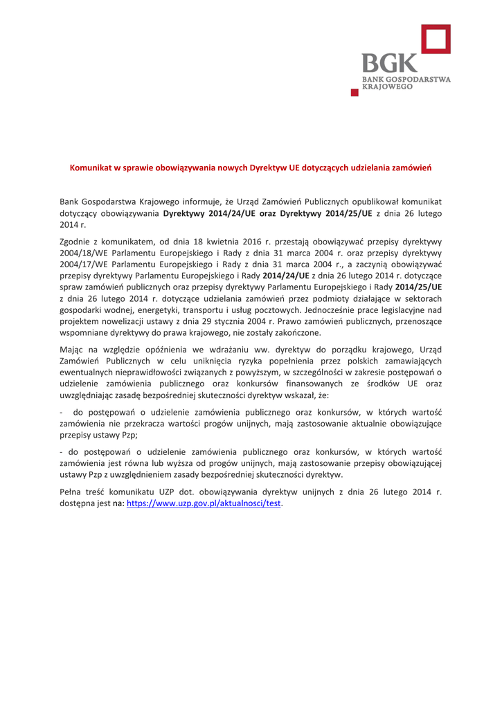 Komunikat w sprawie obowiązywania nowych Dyrektyw UE dotyczących udzielania zamówień Bank Gospodarstwa Krajowego informuje, że Urząd Zamówień Publicznych opublikował komunikat dotyczący obowiązywania Dyrektywy 2014/24/UE oraz Dyrektywy 2014/25/UE z dnia 26 lutego 2014 r. Zgodnie z komunikatem, od dnia 18 kwietnia 2016 r. przestają obowiązywać przepisy dyrektywy 2004/18/WE Parlamentu Europejskiego i Rady z dnia 31 marca 2004 r. oraz przepisy dyrektywy 2004/17/WE Parlamentu Europejskiego i Rady z dnia 31 marca 2004 r., a zaczynią obowiązywać przepisy dyrektywy Parlamentu Europejskiego i Rady 2014/24/UE z dnia 26 lutego 2014 r. dotyczące spraw zamówień publicznych oraz przepisy dyrektywy Parlamentu Europejskiego i Rady 2014/25/UE z dnia 26 lutego 2014 r. dotyczące udzielania zamówień przez podmioty działające w sektorach gospodarki wodnej, energetyki, transportu i usług pocztowych. Jednocześnie prace legislacyjne nad projektem nowelizacji ustawy z dnia 29 stycznia 2004 r. Prawo zamówień publicznych, przenoszące wspomniane dyrektywy do prawa krajowego, nie zostały zakończone. Mając na względzie opóźnienia we wdrażaniu ww. dyrektyw do porządku krajowego, Urząd Zamówień Publicznych w celu uniknięcia ryzyka popełnienia przez polskich zamawiających ewentualnych nieprawidłowości związanych z powyższym, w szczególności w zakresie postępowań o udzielenie zamówienia publicznego oraz konkursów finansowanych ze środków UE oraz uwzględniając zasadę bezpośredniej skuteczności dyrektyw wskazał, że: - do postępowań o udzielenie zamówienia publicznego oraz konkursów, w których wartość zamówienia nie przekracza wartości progów unijnych, mają zastosowanie aktualnie obowiązujące przepisy ustawy Pzp; - do postępowań o udzielenie zamówienia publicznego oraz konkursów, w których wartość zamówienia jest równa lub wyższa od progów unijnych, mają zastosowanie przepisy obowiązującej ustawy Pzp z uwzględnieniem zasady bezpośredniej skuteczności dyrektyw. Pełna treść komunikatu UZP dot. obowiązywania dyrektyw unijnych z dnia 26 lutego 2014 r. dostępna jest na: https://www.uzp.gov.pl/aktualnosci/test.
