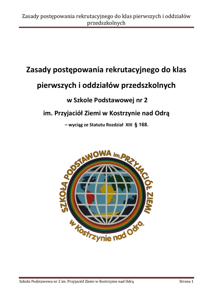 Zasady postępowania rekrutacyjnego do klas pierwszych i oddziałów przedszkolnych Zasady postępowania rekrutacyjnego do klas pierwszych i oddziałów przedszkolnych w Szkole Podstawowej nr 2 im. Przyjaciół Ziemi w Kostrzynie nad Odrą – wyciąg ze Statutu Rozdział XIII § 168. Szkoła Podstawowa nr 2 im. Przyjaciół Ziemi w Kostrzynie nad Odrą Strona 1 Zasady postępowania rekrutacyjnego do klas pierwszych i oddziałów przedszkolnych Podstawa prawna 1) Rozdział 2a ustawy z dnia 6 grudnia 2013 r. o zmianie ustawy o systemie oświaty oraz niektórych innych ustaw (Dz. U. z dnia 3 stycznia 2014 r., poz. 7). 2) Rozporządzenie Ministra Edukacji Narodowej z dnia 21 maja 2001 r. w sprawie ramowych statutów publicznego przedszkola oraz publicznych szkół ( Dz. U. Nr 61 poz. 624, ze zm.). 3) Statut Szkoły Podstawowej nr 2 im. Przyjaciół Ziemi w Kostrzynie nad Odrą. 1. Ogólne zasady rekrutacji 1) Rekrutacja do klas pierwszych oraz oddziałów przedszkolnych odbywa się na podstawie przepisów wymienionych w §1 oraz niniejszych Zasad. 2) Dzieci z obwodu Szkoły przyjmowane są do klasy pierwszej z urzędu . 3) Obwód Szkoły Podstawowej nr 2 im. Przyjaciół Ziemi w Kostrzynie nad Odrą zwanej dalej Szkołą, określa Uchwała Rady Miasta Kostrzyn nad Odrą w sprawie określenia granic obwodów publicznych szkół podstawowych i gimnazjów, będąca załącznikiem nr 1 Zasad. 4) Do potrzeb rekrutacji pod pojęciem miejsca zamieszkania rozumie się: - zameldowanie stałe - zameldowanie czasowe - zamieszkanie np. umowa najmu mieszkania (potwierdzone na podstawie odpowiednich dokumentów przez sekretarza Szkoły). 5) W przypadku, gdy Szkoła dysponuje wolnymi miejscami, następuje kwalifikowanie dzieci do klas pierwszych zamieszkałych poza obwodem Szkoły oraz do oddziałów przedszkolnych. 6) W przypadku podjęcia decyzji o nauce dziecka zamieszkałego w obwodzie Szkoły w innej szkole podstawowej, rodzic/prawny opiekun zobowiązany jest do pisemnego powiadomienia Szkoły o miejscu realizacji obowiązku szkolnego. 7) Ostateczną decyzję o przyjęciu ucznia do Szkoły podejmuje Dyrektor z uwzględnieniem ogólnie obowiązujących przepisów dotyczących realizacji obowiązku szkolnego. 8) Do klasy pierwszej przyjmuje się dzieci: a) od 1 września 2014 r.: - 7-letnie (rocznik 2007) oraz dzieci 6-letnie, urodzone w okresie 1 stycznia – 30 czerwca 2008 r.; - urodzone w okresie od 1 lipca do 31 grudnia 2008 r., jeśli taka będzie wola ich rodziców (wniosek rodziców). b) od 1 września 2015 r.: 7-letnie, urodzone w okresie 1 lipca – 31 grudnia 2008 r., które rok wcześniej nie rozpoczęły spełniania obowiązku szkolnego oraz wszystkie dzieci 6 – letnie. 9) Do oddziałów przedszkolnych przyjmowane są dzieci: a) 6-letnie które nie będą realizować obowiązku szkolnego w klasie pierwszej oraz dzieci 5-letnie; b) 7-letnie i starsze, o ile odroczono im realizację obowiązku szkolnego na podstawie art. 14 ust. 1 a lub art. 16, ust. 3 ustawy z dnia 7 września 1991 roku o systemie oświaty. 10) Nabór uczniów do Szkoły odbywa się wg następujących zasad: a) złożenie w wyznaczonym terminie w sekretariacie Szkoły zgłoszenia dla dzieci zamieszkałych w obwodzie SP 2 lub wniosku dla dzieci niezamieszkałych w obwodzie o przyjęcie wraz z wymaganymi dokumentami (załącznik nr 2 i 3); b) sprawdzenie w wyznaczonym terminie w sekretariacie szkoły czy dziecko zostało zakwalifikowane do placówki; c) potwierdzenie woli nauki przez rodziców/ prawnych opiekunów dziecka; d) w przypadku, gdy rodzic/prawny opiekun nie złoży w wyznaczonym terminie oświadczenia woli podjęcia nauki w Szkole, świadomie rezygnuje z miejsca w tej szkole. Szkoła Podstawowa nr 2 im. Przyjaciół Ziemi w Kostrzynie nad Odrą Strona 2 Zasady postępowania rekrutacyjnego do klas pierwszych i oddziałów przedszkolnych 2. Postępowanie rekrutacyjne 1) Postępowanie rekrutacyjne do klas pierwszych oraz oddziałów przedszkolnych, jak również podział uczniów do klas pierwszych i oddziałów przedszkolnych przeprowadza Szkolna Komisja Rekrutacyjna, zwana dalej Komisją Rekrutacyjną, powołana przez Dyrektora Szkoły w składzie: a) wicedyrektor Szkoły - przewodniczącego Komisji Rekrutacyjnej, b) wychowawcy przyszłych klas pierwszych lub oddziałów przedszkolnych, c) pedagog szkolny, d) sekretarz Szkoły. 2) Do zadań Komisji Rekrutacyjnej w postępowaniu rekrutacyjnym należy w szczególności: a) ustalenie wyników postępowania rekrutacyjnego i podanie do publicznej wiadomości listy kandydatów zakwalifikowanych i kandydatów niezakwalifikowanych oraz listy kandydatów przyjętych i nieprzyjętych do Szkoły; b) sporządzenie protokołu postępowania rekrutacyjnego; c) podziału uczniów do klas pierwszych i oddziałów przedszkolnych. 3) Wyniki postępowania rekrutacyjnego podaje się do publicznej wiadomości w formie listy kandydatów zakwalifikowanych i kandydatów niezakwalifikowanych, zawierającej imiona i nazwiska kandydatów oraz informację o zakwalifikowaniu albo niezakwalifikowaniu kandydata. 4) Komisja Rekrutacyjna przyjmuje kandydata do oddziału przedszkolnego lub klasy pierwszej, jeżeli w wyniku postępowania rekrutacyjnego kandydat został zakwalifikowany oraz rodzice/ prawni opiekunowie złożyli wymagane dokumenty. 5) Komisja Rekrutacyjna podaje do publicznej wiadomości listę kandydatów przyjętych i kandydatów nieprzyjętych do oddziału przedszkolnego lub szkoły. Lista zawiera imiona i nazwiska kandydatów przyjętych i kandydatów nieprzyjętych lub informację o liczbie wolnych miejsc. 6) Listy, o których mowa w ust. 3 i 5, podaje się do publicznej wiadomości poprzez umieszczenie na tablicy informacyjnej Szkoły. Listy zawierają imiona i nazwiska kandydatów uszeregowane w kolejności alfabetycznej oraz najniższą liczbę punktów, która uprawnia do przyjęcia. 7) Dzień podania do publicznej wiadomości listy, o której mowa w ust. 5, jest określany w