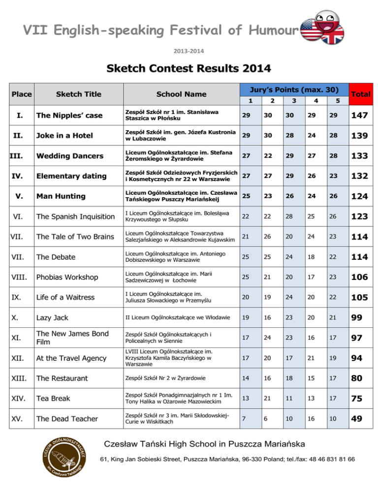 VII English-speaking Festival of Humour 2013-2014 Sketch Contest Results 2014 Place Sketch Title Jury’s Points (max. 30) School Name 1 2 3 4 5 Total The Nipples’ case Zespół Szkół nr 1 im. Stanisława Staszica w Płońsku 29 30 30 29 29 147 Joke in a Hotel Zespół Szkół im. gen. Józefa Kustronia w Lubaczowie 29 30 28 24 28 139 III. Wedding Dancers Liceum Ogólnokształcące im. Stefana Żeromskiego w Żyrardowie 27 22 29 27 28 133 IV. Elementary dating Zespół Szkół Odzieżowych Fryzjerskich 27 i Kosmetycznych nr 22 w Warszawie 27 29 26 23 132 V. Man Hunting Liceum Ogólnokształcące im. Czesława 25 Tańskiegow Puszczy Mariańskeij 23 26 24 26 124 VI. The Spanish Inquisition I Liceum Ogólnokształcące im. Bolesłąwa Krzywoustego w Słupsku 22 22 28 25 26 123 VII. The Tale of Two Brains Liceum Ogólnokształcące Towarzystwa Salezjańskiego w Aleksandrowie Kujawskim 21 26 20 24 23 114 VII. The Debate Liceum Ogólnokształcące im. Antoniego Dobiszewskiego w Warszawie 25 25 24 18 22 114 VIII. Phobias Workshop Liceum Ogólnokształcące im. Marii Sadzewiczowej w Łochowie 25 21 20 17 23 106 IX. Life of a Waitress I Liceum Ogólnokształcące im. Juliusza Słowackiego w Przemyślu 20 19 24 20 22 105 X. Lazy Jack II Liceum Ogólnokształcące we Włodawie 19 16 23 20 21 99 XI. The New James Bond Film Zespół Szkół Ogólnokształcących i Policealnych w Siennie 17 24 23 16 17 97 XII. At the Travel Agency LVIII Liceum Ogólnokształcące im. Krzysztofa Kamila Baczyńskiego w Warszawie 17 20 17 21 19 94 XIII. The Restaurant Zespół Szkół Nr 2 w Żyrardowie 14 16 18 15 17 80 XIV. Tea Break Zespoł Szkół Ponadgimnazjalnych nr 1 Im. Tony Halika w Ożarowie Mazowieckim 13 21 11 13 17 75 XV. The Dead Teacher Zespół Szkół nr 3 im. Marii SkłodowskiejCurie w Wiskitkach 7 6 10 16 10 49 I. II. Czesław Tański High School in Puszcza Mariańska 61, King Jan Sobieski Street, Puszcza Mariańska, 96-330 Poland; tel./fax: 48 46 831 81 66