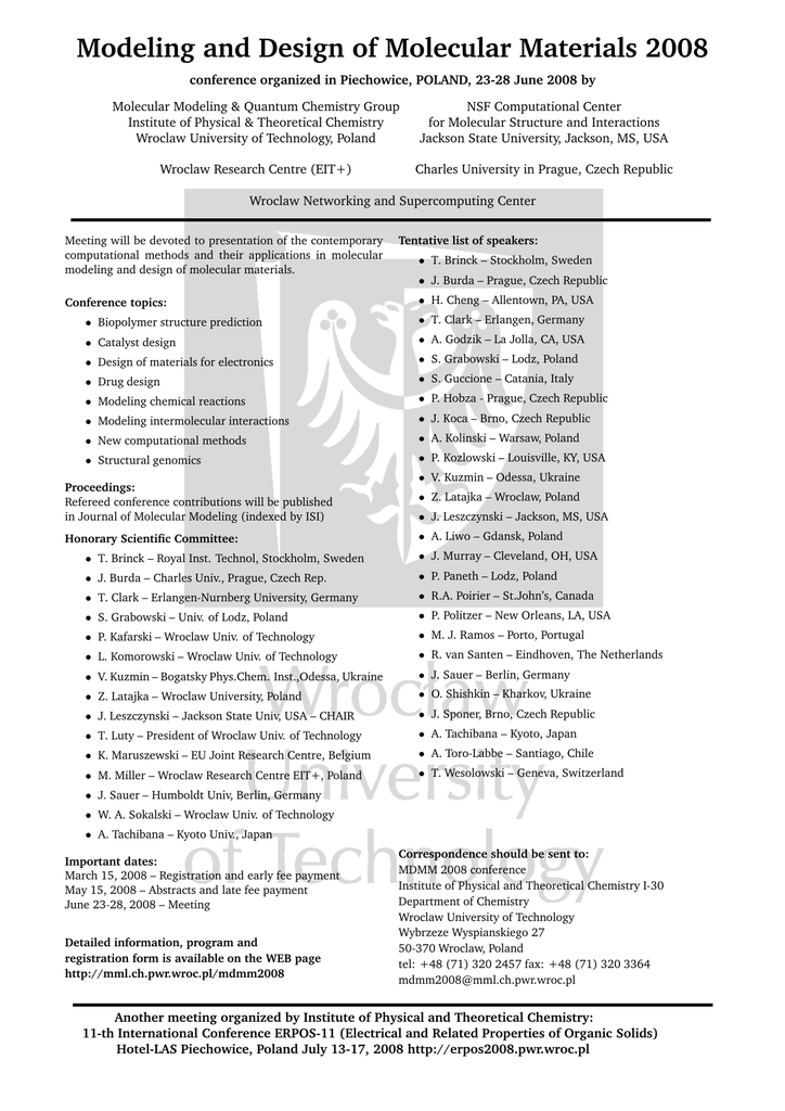 Modeling and Design of Molecular Materials 2008 conference organized in Piechowice, POLAND, 23-28 June 2008 by Molecular Modeling & Quantum Chemistry Group Institute of Physical & Theoretical Chemistry Wroclaw University of Technology, Poland NSF Computational Center for Molecular Structure and Interactions Jackson State University, Jackson, MS, USA Wroclaw Research Centre (EIT+) Charles University in Prague, Czech Republic Wroclaw Networking and Supercomputing Center Meeting will be devoted to presentation of the contemporary computational methods and their applications in molecular modeling and design of molecular materials. Conference topics: Tentative list of speakers: • T. Brinck – Stockholm, Sweden • J. Burda – Prague, Czech Republic • H. Cheng – Allentown, PA, USA • Biopolymer structure prediction • T. Clark – Erlangen, Germany • Catalyst design • A. Godzik – La Jolla, CA, USA • Design of materials for electronics • S. Grabowski – Lodz, Poland • Drug design • S. Guccione – Catania, Italy • Modeling chemical reactions • P. Hobza - Prague, Czech Republic • Modeling intermolecular interactions • J. Koca – Brno, Czech Republic • New computational methods • A. Kolinski – Warsaw, Poland • Structural genomics • P. Kozlowski – Louisville, KY, USA Proceedings: Refereed conference contributions will be published in Journal of Molecular Modeling (indexed by ISI) Honorary Scientific Committee: • V. Kuzmin – Odessa, Ukraine • Z. Latajka – Wroclaw, Poland • J. Leszczynski – Jackson, MS, USA • A. Liwo – Gdansk, Poland • T. Brinck – Royal Inst. Technol, Stockholm, Sweden • J. Murray – Cleveland, OH, USA • J. Burda – Charles Univ., Prague, Czech Rep. • P. Paneth – Lodz, Poland • T. Clark – Erlangen-Nurnberg University, Germany • R.A. Poirier – St.John’s, Canada • S. Grabowski – Univ. of Lodz, Poland • P. Politzer – New Orleans, LA, USA • P. Kafarski – Wroclaw Univ. of Technology • M. J. Ramos – Porto, Portugal • L. Komorowski – Wroclaw Univ. of Technology • R. van Santen – Eindhoven, The Netherlands • V. Kuzmin – Bogatsky Phys.Chem. Inst.,Odessa, Ukraine • J. Sauer – Berlin, Germany • Z. Latajka – Wroclaw University, Poland • O. Shishkin – Kharkov, Ukraine • J. Leszczynski – Jackson State Univ, USA – CHAIR • J. Sponer, Brno, Czech Republic • T. Luty – President of Wroclaw Univ. of Technology • A. Tachibana – Kyoto, Japan • K. Maruszewski – EU Joint Research Centre, Belgium • A. Toro-Labbe – Santiago, Chile • M. Miller – Wroclaw Research Centre EIT+, Poland • T. Wesolowski – Geneva, Switzerland • J. Sauer – Humboldt Univ, Berlin, Germany • W. A. Sokalski – Wroclaw Univ. of Technology • A. Tachibana – Kyoto Univ., Japan Important dates: March 15, 2008 – Registration and early fee payment May 15, 2008 – Abstracts and late fee payment June 23-28, 2008 – Meeting Detailed information, program and registration form is available on the WEB page http://mml.ch.pwr.wroc.pl/mdmm2008 Correspondence should be sent to: MDMM 2008 conference Institute of Physical and Theoretical Chemistry I-30 Department of Chemistry Wroclaw University of Technology Wybrzeze Wyspianskiego 27 50-370 Wroclaw, Poland tel: +48 (71) 320 2457 fax: +48 (71) 320 3364 [email protected] Another meeting organized by Institute of Physical and Theoretical Chemistry: 11-th International Conference ERPOS-11 (Electrical and Related Properties of Organic Solids) Hotel-LAS Piechowice, Poland July 13-17, 2008 http://erpos2008.pwr.wroc.pl