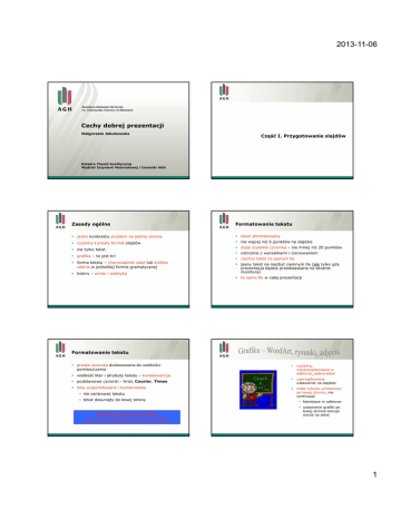 2013-11-06 Cechy dobrej prezentacji Małgorzata Jakubowska Część I. Przygotowanie slajdów Katedra Chemii Analitycznej Wydział Inżynierii Materiałowej i Ceramiki AGH Zasady ogólne Formatowanie tekstu jeden konkretny problem na jednej stronie tekst sformatowany czytelny i prosty format slajdów nie więcej niż 6 punktów na slajdzie nie tylko tekst grafika – to jest to! forma tekstu – równoważniki zdań lub krótkie zdania w jednolitej formie gramatycznej kolory – umiar i estetyka duża czytelna czcionka – nie mniej niż 20 punktów ostrożnie z wersalikami i cieniowaniem ciemny tekst na jasnym tle jasny tekst na niezbyt ciemnym tle (ale tylko gdy prezentacja będzie przedstawiana na ekranie monitora) to samo tło w całej prezentacji Formatowanie tekstu prosta czcionka dostosowana do wielkości pomieszczenia wielkość liter i atrybuty tekstu – konsekwencja podstawowe czcionki - Arial, Courier, Times listy wypunktowane i numerowane – nie centrować tekstu – tekst dosunięty do lewej strony Unikać łączenia kolorów z przeciwstawnych granic widma! czytelna, nieskomplikowana w odbiorze, jednorodna uporządkowane ustawienie na slajdzie małe rysunki umieszczać po lewej stronie, nie centrować – łatwiejsze w odbiorze – ustawienie grafiki po lewej stronie kieruje wzrok na tekst 1 2013-11-06 Zasady rozmieszczanie informacji Efektywność rozumienia i przyjmowania informacji tekst „ciągły” - listy i wyliczenia 40 % 25 % 20 % 15 % + tabele -/+ sieci działań +/- rysunki + wykresy + wydruki komputerowe -/+ Podsumowanie Obiekt Zalecenia Prezentacja intuicyjność, prostota, czytelność, konsekwencja Slajd jasne tło, ciemny tekst, maksymalnie 6 punktów Tekst prosta czcionka, wielkość nie mniejsza niż 20 punktów Grafika czytelna, nieskomplikowana w odbiorze, jednorodna Uwagi ogólne Część II. Wystąpienie Postawa pierwsza zasada to mieć coś do powiedzenia (!!!) przodem lub bokiem do widowni slajdy wspomagają prezentację a nie zastępują jej bez zbędnej czy wystudiowanej gestykulacji slajdy nie mogą „przysłaniać” osoby prezentującej bez nerwowych ruchów (stoimy w miejscu lub poruszmy się wolnym krokiem) odczytywanie tekstu slajdów nie jest zalecane w ręce tylko niezbędne rekwizyty, np. wskaźnik lub estetyczne notatki 2 2013-11-06 Prelegent a widownia kontakt wzrokowy kierowanie wypowiedzi kolejno do konkretnych osób naturalny ton głosu i forma zwracania się do odbiorców Przykładowy plan wystąpienia Część III. Uwagi dotyczące treści prezentacji na obronę pracy inżynierskiej Przykładowy plan wystąpienia slajd tytułowy – logo AGH, nazwa uczelni, wydziału i katedry, autor, tytuł, ew. promotor szczegółowe omówienie wybranego wątku/wątków części literaturowej plan wystąpienia (???) przykład/przykłady aplikacji cel pracy krótkie omówienie zakresu części projektowej wyszczególnienie głównych wątków pracy – tezy części teoretycznej szczegółowe omówienie wybranego aspektu części projektowej – zakres części projektowej podsumowanie i wnioski literatura (wybrane pozycje) slajd z tekstem „Dziękuję za uwagę” Dziękuję za uwagę! 3