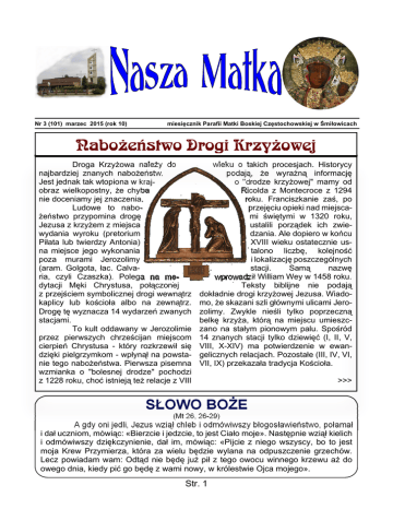 Nr 3 (101) marzec 2015 (rok 10) miesięcznik Parafii Matki Boskiej Częstochowskiej w Śmiłowicach Droga KrzyŜowa naleŜy do najbardziej znanych naboŜeństw. Jest jednak tak wtopiona w krajobraz wielkopostny, Ŝe chyba nie doceniamy jej znaczenia. Ludowe to naboŜeństwo przypomina drogę Jezusa z krzyŜem z miejsca wydania wyroku (pretorium Piłata lub twierdzy Antonia) na miejsce jego wykonania poza murami Jerozolimy (aram. Golgota, łac. Calvaria, czyli Czaszka). Polega na medytacji Męki Chrystusa, połączonej z przejściem symbolicznej drogi wewnątrz kaplicy lub kościoła albo na zewnątrz. Drogę tę wyznacza 14 wydarzeń zwanych stacjami. To kult oddawany w Jerozolimie przez pierwszych chrześcijan miejscom cierpień Chrystusa - który rozkrzewił się dzięki pielgrzymkom - wpłynął na powstanie tego naboŜeństwa. Pierwsza pisemna wzmianka o "bolesnej drodze" pochodzi z 1228 roku, choć istnieją teŜ relacje z VIII wieku o takich procesjach. Historycy podają, Ŝe wyraźną informację o "drodze krzyŜowej" mamy od Ricolda z Montecroce z 1294 roku. Franciszkanie zaś, po przejęciu opieki nad miejscami świętymi w 1320 roku, ustalili porządek ich zwiedzania. Ale dopiero w końcu XVIII wieku ostatecznie ustalono liczbę, kolejność i lokalizację poszczególnych stacji. Samą nazwę wprowadził William Wey w 1458 roku. Teksty biblijne nie podają dokładnie drogi krzyŜowej Jezusa. Wiadomo, Ŝe skazani szli głównymi ulicami Jerozolimy. Zwykle nieśli tylko poprzeczną belkę krzyŜa, którą na miejscu umieszczano na stałym pionowym palu. Spośród 14 znanych stacji tylko dziewięć (I, II, V, VIII, X-XIV) ma potwierdzenie w ewangelicznych relacjach. Pozostałe (III, IV, VI, VII, IX) przekazała tradycja Kościoła. >>> SŁOWO BOśE (Mt 26, 26-29) A gdy oni jedli, Jezus wziął chleb i odmówiwszy błogosławieństwo, połamał i dał uczniom, mówiąc: «Bierzcie i jedzcie, to jest Ciało moje». Następnie wziął kielich i odmówiwszy dziękczynienie, dał im, mówiąc: «Pijcie z niego wszyscy, bo to jest moja Krew Przymierza, która za wielu będzie wylana na odpuszczenie grzechów. Lecz powiadam wam: Odtąd nie będę juŜ pił z tego owocu winnego krzewu aŜ do owego dnia, kiedy pić go będę z wami nowy, w królestwie Ojca mojego». Str. 1 Warto wiedzieć, Ŝe na mocy decyzji papieŜa Pawła VI jest moŜliwość uzyskania raz dziennie odpustu zupełnego za odprawienie Drogi KrzyŜowej. Odpust zupełny jest to darowanie całej naleŜnej kary doczesnej za dotychczas popełnione grzechy, rozgrzeszone juŜ co do winy i kary wiecznej w czasie spowiedzi. W naboŜeństwie tym chodzi o rozwaŜanie Męki Pańskiej polegające nie tyle na współczuciu Chrystusowi, ile na gotowości uczestnictwa w Jego cierpieniach dla dobra Jego Mistycznego Ciała, którym jest Kościół. Choć dominuje tradycyjna liczba 14 stacji, mamy moŜliwość przyjęcia nietypowej liczby, dla innego rozłoŜenia akcentów. Aby ułatwić medytację całego misterium paschalnego Jezusa, jedna z propozycji zawiera 15 stacji - ostatnia dotyczy Zmartwychwstania. Celem Drogi KrzyŜowej jest oŜywienie wiary i apostolstwa; ukształtowanie postaw chrześcijańskiej pokuty, ofiarności i wdzięczności. "Postuluje się nadanie naboŜeństwu formy rewizji Ŝycia", czyli szerszego rachunku sumienia. Pewna dziewczyna z dobrego domu, z gruntownym wychowaniem katolickim wkraczając w dorosłe juŜ Ŝycie odrzuciła wszczepione jej przez rodziców wartości i szła swoją drogą. Wydawało jej się, Ŝe droga przez nią obrana jest lepsza, prostsza i szybciej doprowadzi ją do celu, do kariery i do sławy. Jednak jej matka juŜ we wczesnym dzieciństwie oddała ją pod opiekę Maryi. I choć ona zboczyła z właściwej drogi "matczyne serce" jednak nad nią czuwało. Ona zawsze w kieszeni nosiła pamiątki z rodzinnego domu: mały krzyŜyk i róŜaniec. Czasem kiedy było jej cięŜko albo czuła niebezpieczeństwo jakoś wzdychała do tych "gadŜetów" z dzieciństwa. Bywało nie raz, Ŝe prosiła Boga o cud. Brnąc w to swoje dorosłe Ŝycie wchodziła "z deszczu pod rynnę" i choć prosiła o cud to ten nie nadchodził. W ostateczności została sama z nałogami i bez kariery. LeŜąc kiedyś w pustym mieszkaniu w rozpaczy i złości wyrzuciła przez otwarte okno krzyŜyk i róŜaniec. To co zrobiła spowodowało, Ŝe poczuła jeszcze większą pustkę i lęk. Uświadomiła sobie, Ŝe przecieŜ to były jej pamiątki z dzieciństwa. Co one były winne jej rozpaczy? Ubrała się szybko, zbiegła na dół a tam zobaczyła stertę krzyŜy i róŜańców. Chodziła więc po tej stercie grzebała to tu, to tam. Ludzie patrzyli na nią z lekkim uśmiechem. A ona tylko szukała swoich pamiątek. Patrzący na nią przechodnie nie rozumieli jej zachowania. PrzecieŜ tam leŜała cała sterta krzyŜy i innych dewocjonaliów. Ktoś nawet powiedział jej, Ŝe ma zabrać pierwszy lepszy krzyŜyk i zmykać. JuŜ dla świętego spokoju zabrała do kieszeni "jakiś" krzyŜyk i róŜaniec, które były podobne do jej pamiątek. Ale to nie było to. Ona tęskniła za swoimi pamiątkami, one były dopasowane do jej Ŝycia, do jej osoby, do jej dłoni. Dziewczyna zrozumiała dopiero teraz, Ŝe odrzuciła znajomy krzyŜ, który rósł razem z nią od dzieciństwa, odrzuciła swoje Ŝycie. Idąc przed siebie tęskniła za swoimi dawnymi towarzyszami - krzyŜem i róŜańcem. Szła zamyślona bez celu niosąc wprawdzie w kieszeni krzyŜyk, ale juŜ nie swój. Na tym krzyŜu i róŜańcu nie było juŜ dotyku jej matki, wspomnień. Te rzeczy które zabrała ze sterty były jej obce. Dlatego nie odrzucajmy swojego krzyŜa. Inny krzyŜ będzie nam obcy. Nie będzie nosił śladów naszej toŜsamości. MARYJO DAJ NAM WYTRWAĆ PRZY NASZYM KRZYśU. ks. Jan Sawicki Tekst pochodzi z Tygodnika "Idziemy" Str. 2 C.W.B. Kazimierz urodził się 3 października 1458 r. w Krakowie na Wawelu. Był drugim z kolei spośród sześciu synów Ka