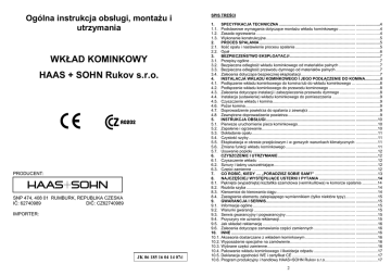 Ogólna instrukcja obsługi, montażu i utrzymania WKŁAD KOMINKOWY HAAS + SOHN Rukov s.r.o. PRODUCENT: SNP 474, 408 01 RUMBURK, REPUBLIKA CZESKA IČ: 62740989 DIČ: CZ62740989 IMPORTER: JK 06 185 16 04 14 07d SPIS TREŚCI 1. SPECYFIKACJA TECHNICZNA ...................................................................... ......................4 1.1. Podstawowe wymagania dotyczące montażu wkładu kominkowego ............... ......................4 1.2. Zasada ogrzewania ........................................................................................... ......................4 1.3. Wykonanie konstrukcyjne.................................................................................. ......................5 2. PROCES SPALANIA ........................................................................................ ......................5 2.1. Ilość opału i nastawienie procesu spalania ....................................................... ......................5 2.2. Opał ................................................................................................................... ......................6 3. BEZPIECZEŃSTWO EKSPLOATACJI ............................................................ ......................7 3.1. Przepisy ogólne ................................................................................................. ......................7 3.2. Bezpieczna odległość wkładu kominkowego od materiałów palnych ............... ......................7 3.3. Bezpieczna odległość przewodu dymnego od materiałów palnych .................. ......................7 3.4. Zalecenia dotyczące bezpiecznej eksploatacji.................................................. ......................7 4. INSTALACJA WKŁADU KOMINKOWEGO I JEGO PODŁĄCZENIE DO KOMINA..............8 4.1. Podłączenie wkładu kominkowego do komina lub do wkładu kominkowego ... ......................8 4.2. Podłączenie wkładu kominkowego do przewodu kominowego ........................ ......................8 4.3. Zalecenia dotyczące instalacji i zabezpieczenia przewodu dymnego .............. ......................8 4.4. Instalacja (ustawienie) wkładu kominkowego do pomieszczenia ..................... ......................9 4.5. Czyszczenie wkładu i komina............................................................................ ......................9 4.6. Pożar komina..................................................................................................... ......................9 4.7. Doprowadzenie powietrza do spalania z zewnątrz ........................................... ......................9 4.8 Zewnętrzne doprowadzenie powietrza.............................................................. ......................9 5. INSTRUKCJA OBSŁUGI .................................................................................. ....................10 5.1. Pierwsze uruchomienie pieca kominkowego..................................................... ....................10 5.2. Zapalenie i ogrzewanie...................................................................................... ....................10 5.3. Dokładanie opału ............................................................................................... ....................11 5.4. Czystość szyby .................................................................................................. ....................11 5.5. Eksploatacja w okresie przejściowym i w gorszych warunkach klimatycznych ....................11 5.6. Zmiana funkcji wkładu kominkowego ................................................................ ....................11 5.7. Usuwanie popiołu .............................................................................................. ....................12 6. CZYSZCZENIE I UTRZYMANIE ....................................................................... ....................12 6.1. Czyszczenie wkładu ......................................................................................... ....................12 6.2. Sznury i taśmy uszczelniające........................................................................... ....................12 6.3. Części zamienne ............................................................................................... ....................12 7. CO ROBIĆ, KIEDY .... „PORADZISZ SOBIE SAM?” ..................................... ....................13 8. NAJCZĘŚCIEJ WYSTĘPUJĄCE USTERKI I PYTANIA ................................. ....................14 8.1. Pęknięta (wypadnięta) kształtka szamotowa (vermikulitowa) w komorze spalania ..............14 8.2. Rozbita szyba .................................................................................................... ....................14 8.3. Kierownice do kierowania ciągu ........................................................................ ....................14 8.4. Zastąpienie elementu zalepiającego wymiennikiem (tylko niektóre typy)......... ....................15 9. GWARANCJA I SERWIS.................................................................................. ....................15 9.1. Informacje ogólne .............................................................................................. ....................15 9.2. Warunki gwarancji ............................................................................................. ....................15 9.3. Serwis gwarancyjny i pogwarancyjny................................................................ ....................15 9.4. Przyczyny nie uznania reklamacji...................................................................... ....................15 9.5. Jak składać reklamację ..................................................................................... ....................16 9.6. Zalecenia dotyczące zamawiania części zamiennych ...................................... .............