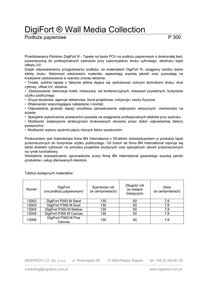 DigiFort ® Wall Media Collection Podłoże papierowe P 300 Przedstawiamy Państwu DigiFort ® - Tapete na bazie PCV na podłożu papierowym o doskonałej bieli, przeznaczoną do profesjonalnych zadruków przy wykorzystaniu druku cyfrowego, sitodruku bądź offsetu UV. Dzięki odpowiedniemu przygotowaniu podłoża, na materiałach DigiFort ®, osiągamy bardzo dobre efekty druku. Natomiast właściwości materiału zapewniają wysoką jakość oraz pozwalają na kreatywne zastosowanie w szeroko znanej reklamie. • Trwała, solidna tapeta o fakturze płótna dająca się zadrukować różnymi technikami druku: druk cyfrowy, offset UV, sitodruk. • Zastosowanie: dekoracja hoteli, restauracji, sal konferencyjnych, mieszkań prywatnych, budynków użytku publicznego. • Grupa docelowa: agencje reklamowe, biura projektowe, instytucje i osoby fizyczne • Właściwości wspomagające nakładanie i montaż. • Odpowiednia grubość tapety umożliwia zamaskowanie większości widocznych nierówności na ścianie • Specjalne wykończenie powierzchni pozwala na osiągniecie profesjonalnych efektów przy wydruku. • Możliwość zwiększenia atrakcyjności drukowanych obrazów przez dobór odpowiedniej faktury powierzchni. • Możliwość wyboru spośród pięciu różnych faktur powierzchni. Producentem jest holenderska firma BN International z 50-letnim doświadczeniem w produkcji tapet przeznaczonych do budynków użytku publicznego. Od trzech lat firma BN International zajmuje się także drukiem cyfrowym na potrzeby projektów studyjnych oraz specjalnych zleceń przeznaczonych na rynek kontraktowy. Wieloletnie doświadczenie zgromadzone przez firmę BN International gwarantuje wysoką jakość produktów i usług oferowanych klientom. Tablica dostępnych materiałów: Numer 13002 13003 13004 13005 13006 DigiFort (na podłożu papierowym) Szerokość roli (w centymetrach) Długość roli (w metach bieżących) Gilza (w centymetrach) DigiFort P300 M Sand DigiFort P300 M Dust DigiFort P300 M Mellow DigiFort P300 M Canvas DigiFort P300 M Fine Canvas 130 130 130 130 50 50 50 50 7,6 7,6 7,6 7,6 130 50 7,6 SIGNTECH C.E. Sp. z o.o. [email protected] ul. Podmiejska 35 41-940 Piekary Śląskie tel. +48 32 254 81 20 www.signtech.com.pl DigiFort ® Wall Media Collection Podłoże papierowe P 300 Ogólny opis: Tapeta na bazie PCV o podłożu papierowym przeznaczona do zadruku na drukarkach atramentowych Opis roli: Szerokość: 130 cm Długość: 50 Gilza: 7,6 cm Sposób pakowania: Papier pakowy + kartonowe pudło* *za dodatkowa opłata Skład: Gramatura podkładu: Gramatura warstwy wierzchniej (PCV): Gramatura całkowita: Grubość: * W zależności od struktury podłoża Tusze: Przeznaczone do druku na: Właściwości: Powłoka 90 ± 15 g/m² 210 ± 15 g/m² 300 ± 15 g/m² * mm EN ISO 2286-2 EN ISO 2286-2 EN ISO 2286-2 EN ISO 2286-3 Solvent, Eco Solvent i UV Specjalnie wykonany lakier akrylowy z wyjątkowymi właściwościami ułatwiającymi aplikacje tuszu. Możliwość mycia przed zadrukiem: Ścieralność EN 259 –2 Ogólnie: Cyfrowo zadrukowana tapeta może być myta. Lekkie lub średnie zabrudzenia mogą być usunięte za pomocą łagodnego detergentu i suchej ściereczki. Przemywanie – nie jest zalecane intensywne szorowanie materiału. Ważne jest aby przemywać materiał (kierunek: góra-dół) lekko zmoczona szmatka (absorbentem) w celu uniknięcia zawilgocenia brzegów. Nie można używać wybielaczy lub agresywnych środków powierzchniowo czynnych. Odporność chemiczna przed zadrukiem: Odporny na: Mydło; Detergenty; Alkohol; Amoniak; Związki zasadowe; Nieodporny na: Solvent typu Keton; Estry; Węglowodory aromatyczne. Aplikacja: Zgodnie z instrukcja montażu dołączona do produktu. Przyczepność: Bardzo dobra przyczepność przy BK 10 , BK 23 (przemysłowa), lub podobna PVA. Bezpieczeństwo / Ekologiczność: Materiał jest klasyfikowany jako nieszkodliwy - DIN 52900 lub 91/155/EEG,2001/58/EC Odporność na ogień: Światło trwałość materiału: SIGNTECH C.E. Sp. z o.o. [email protected] Wskaźnik palności: Klasa Euro B s2d0 Klasa 0 / 1 BS 476 część 6/7 M1 NF P 92501 / 92507 B1 DIN 4102 – 01 * * Numer ABP : P-MPA-E-00-626 7 na 8 Międzynarodowa Skala Wool BS EN 20105 / ISO 105-B02 ul. Podmiejska 35 41-940 Piekary Śląskie tel. +48 32 254 81 20 www.signtech.com.pl DigiFort ® Wall Media Collection Podłoże papierowe P 300 Zalecenia dotyczące jakości Aby poprawnie aplikować tapetę należy wykonać następujące kroki: Materiał: - Upewnij się, że materiał jest w nienaruszonym stanie. Jeżeli został on uszkodzony podczas transportu, prosimy natychmiast skontaktować się z nami telefonicznie lub za pośrednictwem poczty elektronicznej (dane kontaktowe znajdują się na końcu tego dokumentu). - Zawsze zaczynaj od rolki o największym numerze - Przytnij tapetę na długość, pozostawiając 5 cm zapasu na sufit i listwę przypodłogowa. - Po przycięciu trzech długości tapety upewnij się, że maja one jednolity kolor i fakturę. Jeżeli zauważysz jakiekolwiek różnice, prosimy o kontakt telefoniczny lub za pośrednictwem poczty elektronicznej. Producent nie przyjmuje reklamacji przekraczających trzy długości. Ściany i/lub płyty: - Upewnij się, że ściany lub płyty są gładkie, stabilne, suche oraz wolne od pleśni i grzyba - Usuń z powierzchni stara tapetę, farbę lub wapno, zwracając szczególna uwagę na wyczyszczenie ewentualnych śladów tuszu, kredek itp. Nakładanie tapety: - Przy nakładaniu tapety zaleca się stosowanie kleju dyspersyjnego na bazie PVA, takiego jak Duracoll BK10 - W przypadku porowatych lub chłonnych powierzchni zaleca się wykonanie podkładu z kleju Duracoll BK15 lub innego rozcieńczonego kleju. - Narysuj na ścianie prostopadła linie tak, aby pierwsza długość można było nałożyć 2 cm za krawędzią rogu - Nałóż wałkiem lub pędzlem odpowiednia ilość kleju na jedna długość tapety. Klej nakładamy tyl