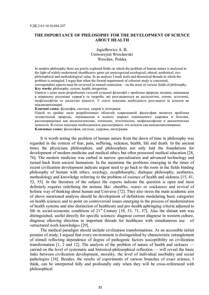 УДК [141+614]-044.247 THE IMPORTANCE OF PHILOSOPHY FOR THE DEVELOPMENT OF SCIENCE ABOUT HEALTH Jagiełłowicz A. B. Uniwersytet Wrocławski Wrocław, Polska In modern philosophy there are poorly explored fields on which the problem of human nature is analyzed in the light of widely understood «healthcare» gains yet unrecognized axiological, ethical, aesthetical, ecophilosophical and methodological value. In an analysis I mark trails and theoretical threads in which the problem is entangled. I argue that when the formal requirement of coherent study is concerned, correspondent aspects must be reviewed in mutual connection – on the areas of various fields of philosophy. Key words: philosophy, system, health, integration. Однією з дуже мало розроблених галузей сучасної філософії є проблема природи людини, оцінювана в широкому розумінні здоров’я та хвороби, які розглядаються як аксіологічні, етичні, естетичні, екофілософічні та діалогічні цінності. У статті показана необхідність розглядати ці аспекти як міждисциплінарні. Ключові слова: філософія, система, здоров’я, інтеграція. Одной из крайне мало разработанных областей современной философии является проблема человеческой природы, оцениваемая в аспекте широко понимаемого здоровья и болезни, рассматриваемых как аксиологические, этические, эстетические, экофилософские и диалогические ценности. В статье показана необходимость рассматривать эти аспекты как междисциплинарные. Ключевые слова: философия, система, здоровье, интеграция. It is worth noting the problem of human nature from the dawn of time in philosophy was regarded in the context of fear, pain, suffering, sickness, health, life and death. In the ancient times the physicians philosophize, and philosophers not only laid the foundations for development of modern medicine and medical ethics but often possessed medical education [28, 76]. The modern medicine was curbed in narrow specialization and advanced technology and turned back from ancient humanism. In the meantime the problems emerging in the times of recent civilization development indicate urgent need to go back to the roots in the fields binding philosophy of human with ethics, axiology, ecophilosophy, dialogue philosophy, aesthetics, methodology and knowledge referring to the problem of essence of health and sickness [15, 41, 52, 55]. In the literature of the subject the experts indicate the question is open and most definitely requires redefining the notions like: «health», «care» or «sickness» and revival of holistic way of thinking about human and Universe [72]. They also stress the main academic aim of above mentioned analysis should be development of definitions modulating basic categories on health sciences and to point on controversial issues emerging in the process of modernization of health systems and also distinction of healthcare and pro-health upbringing criteria adjusted to life in social-economic conditions of 21 st Century [10, 53, 71, 37]. Also the distant aim was distinguished, useful directly for specific sciences: diagnose correct diagnose in western culture, diagnose allowing direction to important threads for healthcare with simultaneous use of «structured work knowledge» [29]. The medical paradigm should include civilization transformations. As an accessible initial premise of study, I argued that every environment is distinguished by characteristic entanglement of stimuli reflecting dependence of degree of pathogenic factors susceptibility on civilization transformation [1, 2 and 12]. The analysis of the problem of nature of health and sickness — carried on the level of systematic and historical-philosophical reflection — will reveal the basic links between civilization development, morality, the level of individual morbidity and social pathologies [34]. Besides, the results of experiments of various branches of exact science, I think, can be interpreted fully and profoundly only when they will be cross-referenced with philosophical 31 Jagiełłowicz A. B., 2013 concepts with consolidated canons of philosophical thinking. Thus in academic- research work regarding the problem of health we account, therefore, information diversity: I bind an issue together with a bracket of philosophical knowledge and I submit the way of thinking to the achievements of analyzed historical period. The health science understood this way (philosophy of health) I do not restrict to the knowledge from professional physician’s ethic and bioethics since it includes these branches and surpasses them. The philosophy of health characterizes itself with interdisciplinarity — systematic philosophical knowledge is integrated with elements of particular disciplines – developed on various study platforms in a compliance with historicalphilosophical thread of the matter [24, 63]. Thanks to the Descartes formula — on differentiation of substances on thinking and extensive – starting from the modern time, the human body was treated as an object of philosophy of nature and studied as an organism. The tradition allows us to keep the distance towards our body and study its character by means on anatomy and physiology. Body perceived as an organism was originally described in classically mechanistic categories. Further on scientific and technological development allowed