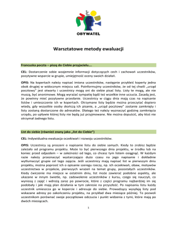 Warsztatowe metody ewaluacji Francuska poczta – piszę do Ciebie przyjacielu…. CEL: Dostarczenie sobie wzajemnie informacji dotyczących cech i zachowań uczestników, pozytywne wsparcie w grupie, umiejętność oceny swoich działań. OPIS: Na kopertach należy napisać imiona uczestników, następnie przykleić koperty jedna obok drugiej w widocznym miejscu sali. Poinformujmy uczestników, że od tej chwili „urząd pocztowy” jest otwarty i uczestnicy mogą oni do siebie pisać listy. Listy te mogą, ale nie muszą, być anonimowe. Mogą wyrażać sympatię bądź też wszelkie inne uczucia. Zasadą jest, że powinny mieć pozytywne przesłanie. Uczestnicy w ciągu dnia mają czas na napisanie listów i umieszczenie ich w kopertach. Otrzymane listy będzie można przeczytać dopiero wtedy, gdy wszystkie osoby skończą ich pisanie, a „urząd pocztowy” zostanie zamknięty i listy zostaną dostarczone do adresatów. Dlatego też należy wyznaczyć godzinę zamknięcia urzędu, po upływie której listy nie będą już przyjmowane. Nie można dopuścić, aby ktoś nie otrzymał żadnego listu. List do siebie (również znany jako „list do Ciebie”) CEL: Indywidualna ewaluacja oczekiwań i rozwoju uczestników. OPIS: Uczestnicy są proszeni o napisanie listu do siebie samych. Kiedy to zrobisz będzie zależało od programu projektu. Może to być pierwszego dnia projektu, w środku lub na koniec przed odjazdem – w zależności od tego, co chcesz tym listem osiągnąć. W każdym razie należy przeznaczyć wystarczająco dużo czasu na jego napisanie i dokładnie wytłumaczyć grupie cel tego zajęcia. Jeśli uczestnicy mają napisać list w pierwszym dniu projektu, można poprosić ich o opisanie szeregu rzeczy, np. ich oczekiwań, obaw, motywów uczestnictwa w projekcie, pierwszych wrażeń na temat grupy, pozostałych uczestników. Kiedy ćwiczenie ma miejsce w ostatnim dniu, list może zawierać podobne aspekty, ale ukazane w innym świetle, np. zadowolenie uczestników z kursu, czego się nauczyli, co wyniosą z zajęć i wdrożą zaraz po powrocie, które z części programu najbardziej im się podobały i jaki mają plan działania w tym zakresie na przyszłość. Po napisaniu listu każdy uczestnik umieszcza go w kopercie i adresuje do siebie. Prowadzący wysyłają listy pod wskazane adresy po zakończeniu projektu, na przykład dwa miesiące później. To pozwoli uczestnikom porównać swoje początkowe odczucia i punkt widzenia z tymi, które mają po dwóch miesiącach. 1 KOMENTARZ: Planując wykorzystanie „listu do siebie”, musisz pamiętać, że to jest bardzo osobisty sposób ewaluacji. Prowadzący nie ma żadnego wpływu na uczestnika ani też żadnych możliwości ingerencji czy interakcji podczas całego procesu, ponieważ nie czyta tego listu. Dziennik CEL: Umożliwienie uczestnikom przyjrzenia się programowi z ich własnej perspektywy. OPIS: Prowadzący rozdają notatniki, w których uczestnicy będą spisywali wydarzenia kolejnych dni udziału w projekcie. Uczestników można poprosić, żeby robili notatki we własnym tempie. Chociaż innym sposobem, bardzo docenianym przez uczestników, jest ukierunkowanie ich poprzez zadanie kilku pytań pomocniczych. Na przykład: Opisz własnymi słowami, co się dziś wydarzyło? Czy miały miejsce jakieś szczególne wydarzenia? Czy są jeszcze jakieś rzeczy lub pytania, które nie dają ci spokoju? Czy udało ci się nauczyć czegoś nowego? Czy jest coś, na co w przyszłości zamierzasz zwrócić szczególną uwagę? Należy pamiętać, że uczestnicy powinni być motywowani do codziennego prowadzenia dziennika. Atrakcyjnie wyglądający i prowadzony w kreatywny sposób dziennik będzie stanowił dobrą zachętę. KOMENTARZ: Oczywiście dziennik jest bardzo osobistym zapisem i nie powinien być czytany przez innych bez zgody jego autora. Ale systematycznie prowadzony dziennik zdecydowanie ułatwi końcową ewaluację całego projektu. Sznurek do bielizny CEL: Odkrycie oczekiwań uczestników wobec projektu. OPIS: Wszyscy uczestnicy otrzymują rysunki, na których widnieją części garderoby. Każda część oznacza inne oczekiwania (na przykład: nadzieje, obawy i propozycje), które uczestnicy mają wobec programu. Uczestnikom wyznacza się czas, by zastanowili się nad własnymi oczekiwaniami, używając poszczególnych części garderoby jako wskazówek. Każdy zapisuje swoje pomysły na odpowiednich „ubraniach” i przyczepia je do sznurka zawieszonego w sali lub narysowanego na ścianie. Dzięki temu każdy uczestnik ma szansę obejrzeć „pranie” innych. Ważne jest, by grupa miała wystarczająco dużo czasu na wykonanie tego zadania. 2 Telegram CEL: Podsumowanie dnia i dowiedzenie się, jakie są nastroje w grupie po spotkaniu. OPIS: Uczestnicy mają kilka minut na przemyślenie dnia czy zajęć i podzielenie się z grupą swoimi refleksjami za pomocą trzech słów: pozytywnego, negatywnego i podsumowującego. Na przykład: intensywny – bol głowy – wycieńczony Warto notować na planszy, co mówią uczestnicy i na koniec podsumować ogólne odczucia grupy. Jeśli zostało mało czasu, można zakończyć ćwiczenie prosząc każdego uczestnika o głośne przeczytanie telegramu drugiej osoby. Jeszcze innym sposobem na podzielenie się wynikami jest poproszenie uczestników o napisanie telegramów na karteczkach samoprzylepnych i przyklejenie ich na ścianach tak, by wszyscy mogli przeczytać. Rzeka CEL: Dowiedzenie się, jak uczestnicy postrzegają własne postępy w projekcie. OPIS: Uczestnicy tworzą małe grupy (5–7 osób), którym rozdaje się rysunek rzeki narysowanej na kartce papieru. Grupy otrzymują papier w rożnych kolorach, nożyczki, klej, ołówki i pisaki. Wykorzystując te materiały, każdy uczestnik pracuje sam nad artystycznym wyrażeniem własnych postępów podczas programu. Następnie umieszcza to, co stworzył na wybranym przez siebie odcinku rzeki. Kiedy już ws
