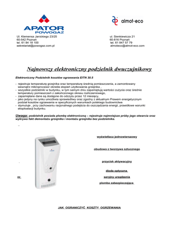 Ul. Klemensa Janickiego 23/25 60-542 Poznań tel. 61 84 18 100 [email protected] ul. Sienkiewicza 21 60-816 Poznań tel. 61 847 57 79 [email protected] Najnowszy elektroniczny podzielnik dwuczujnikowy Elektroniczny Podzielnik kosztów ogrzewania EITN 30.5 - rejestruje temperaturę grzejnika oraz temperaturę średnią pomieszczenia, a zamontowany wewnątrz mikroprocesor określa stopień użytkowania grzejnika , - wszystkie podzielniki w budynku, w tym samym dniu zapamiętują wartości zużycia oraz średnie temperatury pomieszczeń z zakończonego okresu rozliczeniowego, - zapamiętane dane są dostępne do odczytu przez 12 miesięcy, - jako jedyny na rynku umożliwia sprawiedliwy oraz zgodny z aktualnym Prawem energetycznym podział kosztów ogrzewania w specyficznych warunkach polskiego budownictwa - stymuluje , przy zachowaniu racjonalnego podejścia do oszczędzania energii, prawidłowe warunki eksploatacji budynku. Uwaga: podzielnik posiada plombę elektroniczną – rejestruje najmniejsze próby jego otwarcia oraz wykrywa fakt demontażu grzejnika i montażu grzejnika bez podzielnika. wyświetlacz jednowierszowy obudowa z tworzywa sztucznego przycisk aktywacyjny dioda optyczna nr seryjny urządzenia plomba zabezpieczająca JAK OGRANICZYĆ KOSZTY OGRZEWANIA  Mieszkanie należy wietrzyć, po zakręceniu zaworu, krótko i intensywnie - najlepiej do 10 minut. Dzięki temu powietrze będzie świeże, a temperatura pomieszczeń pozostanie utrzymana. Zbytnio wychłodzone pomieszczenia potrzebują długiego czasu i dużej ilości ciepła do ogrzania, ponieważ nie tylko powietrze, ale również mury i meble muszą zostać ponownie ogrzane.  Grzejniki nie powinny być przysłonięte gęstymi długimi zasłonami, gdyż większość ogrzanego powietrza pozostanie niewykorzystana. Ogrzane powietrze powędruje w kierunku okna gdzie zostanie utracone, a tylko niewielka jego część będzie ogrzewać pomieszczenie. Sytuacja taka powoduje znacznie większe zużycie ciepła.  Zbyt długie zasłony, meble stojące przy grzejnikach, obudowywanie grzejników lub długotrwałe suszenie na nich prania utrudnia oddawanie ciepła. Grzejnik bowiem będzie gorący a w mieszkaniu zimno.  Instalacje grzewcze w mieszkaniach projektuje się tak, aby można było uzyskać temperaturę 20 0C. Pokręcając głowicą zaworu termostatycznego możemy dostosować temperaturę do swoich potrzeb. W nocy można ustawić np. na 16 0C. Nocne obniżenie temperatury jest zalecane ze względów zdrowotnych jak również finansowych. Nastawy i odpowiadające im temperatury można znaleźć w instrukcji obsługi zaworu termostatycznego - najczęściej stosowane nastawy przedstawiamy na rysunku.  Opuszczając mieszkanie na dłuższy okres czasu można ustawić zawory na 16 0C oraz pozostawić drzwi do wszystkich pomieszczeń otwarte. Dzięki temu uzyskamy równomierną temperaturę w mieszkaniu.  Wychłodzenie poniżej 16 0C jak również sporadyczne wietrzenie prowadzi do zawilgocenia mieszkania. Szanowni Państwo ! W momencie gdy czytacie Państwo tą instrukcję montowane są w Waszym mieszkaniu elektroniczne podzielniki kosztów ogrzewania – dwuczujnikowe.. Oprócz standardowego wyposażenia, posiadają one unikalną funkcję rejestracji średniej temperatury pomieszczenia. Dzięki tej rewolucyjnej i nowatorskiej funkcji, której pozbawione są pozostałe podzielniki oferowane na rynku budownictwa, możliwe jest monitorowanie sposobu użytkowania mieszkania. Wprowadzenie naszego podzielnika umożliwia w sezonie grzewczym, wychwytywanie prób wychładzania mieszkań poniżej 160C, co prowadzi do negatywnych skutków dotyczących wiarygodności rozliczania kosztów ogrzewania – przepływ ciepła z mieszkań o wyższej temperaturze i obciążanie ich wyższymi kosztami, jak i degradacji mieszkań – zawilgocenia prowadzącego do zagrzybienia. Dzięki systemowi rozliczeniowemu, w pełni zgodnemu ze znowelizowaną ustawą Prawo Energetyczne w zakresie zachowania prawidłowych warunków eksploatacji budynku i zapewnienia ustalenia opłat w sposób odpowiadający zużyciu ciepła na ogrzewanie, zacznie się opłacać energooszczędne i jednocześnie racjonalne użytkowanie mieszkań. Pod tym pojęciem rozumiane jest takie racjonowanie zużycia ciepła, które polega na zapewnieniu mieszkaniom temperatury, zgodnej z indywidualnym odczuciem komfortu cieplnego, ale także prawidłową wentylację – wietrzenie i nie wychładzanie pomieszczeń poniżej rozsądnej granicy, jaką jest 160C. Konstrukcja i oprogramowanie prezentowanego podzielnika E-ITN 30.5 są wynikiem pracy polskich specjalistów z różnych dziedzin: elektroników, informatyków, ciepłowników oraz osób związanych z branżą rozliczania kosztów ogrzewania. Podczas prac projektowych i badań nad prototypem, wzięto pod uwagę efekty ostatnich osiągnięć naukowych, doświadczenia firm rozliczeniowych, postulaty gestorów zasobów mieszkaniowych oraz użytkowników, czyli Lokatorów. Elektroniczny podzielnik kosztów ogrzewania E-ITN 30.5 działa w oparciu o zasadę charakterystycznych temperatur miarodajnych dla oddawania ciepła przez powierzchnię grzejnika. rejestracji Wartość wskazywana przez podzielnik działający zgodnie z dwuczujnikową metodą pomiarową, jest proporcjonalna do ilości ciepła wyemitowanego przez grzejnik na którym jest zamontowany. Do ekspozycji danych na podzielniku służy pięciomiejscowy wyświetlacz LCD. Cykl ekspozycji danych rozpoczyna się po aktywacji przyciskiem z lewej strony na przedniej części obudowy podzielnika. Aktywacja ta powoduje cykliczne wyświetlanie danych standardowych w następującej kolejności: 8. informacja o uaktywnieniu plomby elektronicznej - UWAGA! Należy niezwłocznie powiadomić Administrację Spółdzielni