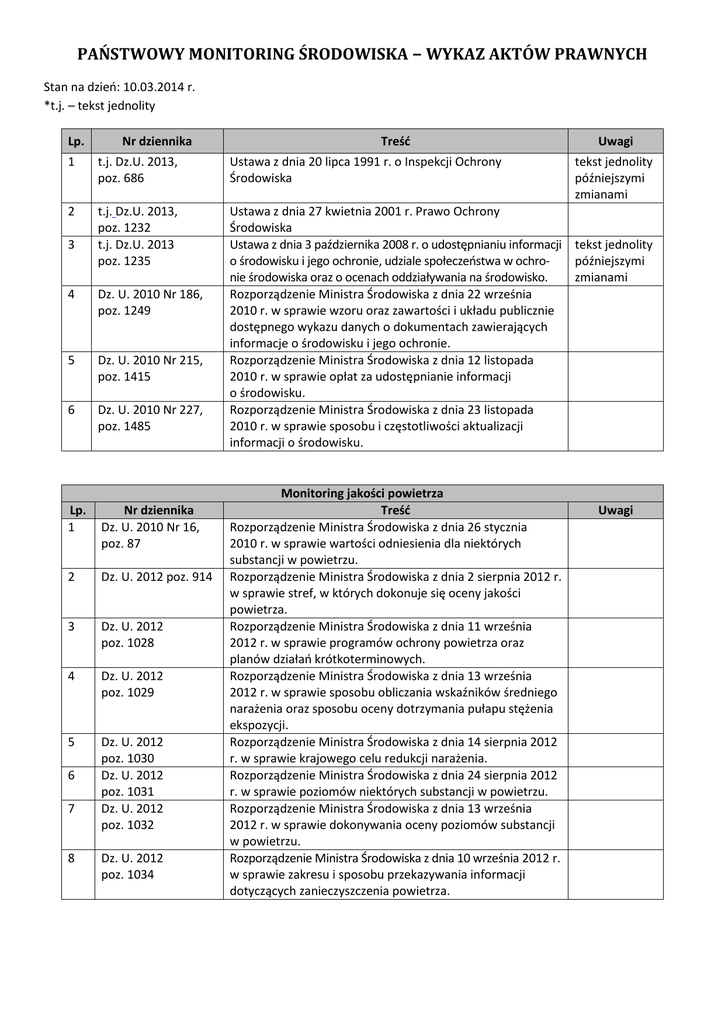 PAŃSTWOWY MONITORING ŚRODOWISKA − WYKAZ AKTÓW PRAWNYCH Stan na dzień: 10.03.2014 r. *t.j. – tekst jednolity Lp. Nr dziennika Treść Uwagi 1 t.j. Dz.U. 2013, poz. 686 Ustawa z dnia 20 lipca 1991 r. o Inspekcji Ochrony Środowiska 2 t.j. Dz.U. 2013, poz. 1232 t.j. Dz.U. 2013 poz. 1235 Ustawa z dnia 27 kwietnia 2001 r. Prawo Ochrony Środowiska Ustawa z dnia 3 października 2008 r. o udostępnianiu informacji tekst jednolity o środowisku i jego ochronie, udziale społeczeństwa w ochropóźniejszymi nie środowiska oraz o ocenach oddziaływania na środowisko. zmianami Rozporządzenie Ministra Środowiska z dnia 22 września 2010 r. w sprawie wzoru oraz zawartości i układu publicznie dostępnego wykazu danych o dokumentach zawierających informacje o środowisku i jego ochronie. Rozporządzenie Ministra Środowiska z dnia 12 listopada 2010 r. w sprawie opłat za udostępnianie informacji o środowisku. Rozporządzenie Ministra Środowiska z dnia 23 listopada 2010 r. w sprawie sposobu i częstotliwości aktualizacji informacji o środowisku. 3 4 Dz. U. 2010 Nr 186, poz. 1249 5 Dz. U. 2010 Nr 215, poz. 1415 6 Dz. U. 2010 Nr 227, poz. 1485 Lp. 1 Nr dziennika Dz. U. 2010 Nr 16, poz. 87 2 Dz. U. 2012 poz. 914 3 Dz. U. 2012 poz. 1028 4 Dz. U. 2012 poz. 1029 5 Dz. U. 2012 poz. 1030 Dz. U. 2012 poz. 1031 Dz. U. 2012 poz. 1032 6 7 8 Dz. U. 2012 poz. 1034 Monitoring jakości powietrza Treść Rozporządzenie Ministra Środowiska z dnia 26 stycznia 2010 r. w sprawie wartości odniesienia dla niektórych substancji w powietrzu. Rozporządzenie Ministra Środowiska z dnia 2 sierpnia 2012 r. w sprawie stref, w których dokonuje się oceny jakości powietrza. Rozporządzenie Ministra Środowiska z dnia 11 września 2012 r. w sprawie programów ochrony powietrza oraz planów działań krótkoterminowych. Rozporządzenie Ministra Środowiska z dnia 13 września 2012 r. w sprawie sposobu obliczania wskaźników średniego narażenia oraz sposobu oceny dotrzymania pułapu stężenia ekspozycji. Rozporządzenie Ministra Środowiska z dnia 14 sierpnia 2012 r. w sprawie krajowego celu redukcji narażenia. Rozporządzenie Ministra Środowiska z dnia 24 sierpnia 2012 r. w sprawie poziomów niektórych substancji w powietrzu. Rozporządzenie Ministra Środowiska z dnia 13 września 2012 r. w sprawie dokonywania oceny poziomów substancji w powietrzu. Rozporządzenie Ministra Środowiska z dnia 10 września 2012 r. w sprawie zakresu i sposobu przekazywania informacji dotyczących zanieczyszczenia powietrza. tekst jednolity późniejszymi zmianami Uwagi Monitoring jakości śródlądowych wód powierzchniowych oraz wód podziemnych Lp. 1 Nr dziennika t.j. Dz. U. 2012, poz. 145 Treść Ustawa z dnia z dnia 18 lipca 2001 r. - Prawo wodne 2 Dz. U. 2002 Nr 176, poz. 1455 3 Dz. U. 2002 Nr 204, poz. 1728 4 Dz. U. 2002 Nr 241, poz. 2093 5 Dz. U. 2008 Nr 143, poz. 896 6 Dz. U. 2011 Nr 36, poz. 191 Dz. U. 2011 Nr 86, poz. 478 Rozporządzenie Ministra Środowiska z dnia 4 października 2002 r. w sprawie wymagań, jakim powinny odpowiadać wody śródlądowe będące środowiskiem życia ryb w warunkach naturalnych. Rozporządzenie Ministra Środowiska z dnia 27 listopada 2002 r. w sprawie wymagań, jakim powinny odpowiadać wody powierzchniowe wykorzystywane do zaopatrzenia ludności w wodę przeznaczoną do spożycia. Rozporządzenie Ministra Środowiska z dnia 23 grudnia 2002r. w sprawie kryteriów wyznaczania wód wrażliwych na zanieczyszczenie związkami azotu ze źródeł rolniczych. Rozporządzenie Ministra Środowiska z dnia 23 lipca 2008 r. w sprawie kryteriów i sposobu oceny stanu wód podziemnych. Rozporządzenie Ministra Środowiska z dnia 2 lutego 2011 r. w sprawie profilu wody w kąpielisku. Rozporządzenie Ministra Zdrowia z dnia 8 kwietnia 2011 r. w sprawie nadzoru nad jakością wody w kąpielisku i miejscu wykorzystywanym do kąpieli. Rozporządzenie Ministra Środowiska z dnia 10 listopada 2011 r. w sprawie wykazu substancji priorytetowych w dziedzinie polityki wodnej. Rozporządzenie Ministra Środowiska z dnia 9 listopada 2011r. w sprawie sposobu klasyfikacji stanu jednolitych części wód powierzchniowych oraz środowiskowych norm jakości dla substancji priorytetowych. Rozporządzenie Ministra Środowiska z dnia 9 listopada 2011 r. w sprawie klasyfikacji stanu ekologicznego, potencjału ekologicznego i stanu chemicznego jednolitych części wód powierzchniowych. Rozporządzenie Ministra Środowiska z dnia 15 listopada 2011 r. w sprawie form i sposobu prowadzenia monitoringu jednolitych części wód powierzchniowych i podziemnych. Rozporządzenie Ministra Środowiska z dnia 21 listopada 2013 r. zmieniające rozporządzenie w sprawie form i sposobu prowadzenia monitoringu jednolitych części wód powierzchniowych i podziemnych 7 8 Dz. U. 2011 Nr 254, poz. 1528 9 Dz. U. 2011 Nr 257, poz. 1545 10 Dz. U. 2011 Nr 258, poz. 1549 11 Dz. U. 2011 Nr 258, poz. 1550 12 Dz.U. 2013 poz. 1558 Lp. 1 Uwagi tekst jednolity z późniejszymi zmianami Monitoring jakości śródlądowych wód powierzchniowych oraz wód podziemnych Wykaz Rozporządzeń Dyrektorów Regionalnych Zarządów Gospodarki Wodnej Nr dziennika Treść Uwagi RZGW Poznań Dz. Urz. Woj. Wlkp. Rozporządzenie Dyrektora RZGW w Poznaniu z dnia 12 Na podstawie art. 2012, poz. 3143 lipca 2012 r. w sprawie określenia w regionie wodnym 47 ust. 3 ustawy Warty w granicach województwa wielkopolskiego wód z dnia 18 lipca 2001 wrażliwych na zanieczyszczenia związkami azotu ze roku Prawo Wodne źródeł rolniczych oraz obszarów szczególnie narażonych, z których odpływ azotu ze źródeł rolniczych do tych wód należy ograniczyć. Lp. 2 3 4 5 6 7 8 9 Monitoring jakości śródlądowych wód powierzchniowych oraz wód podziemnych Wykaz Rozporządzeń Dyrektorów Regionalnych Zarządów Gospodarki Wodnej Nr dziennika Treść Uwagi RZGW Poznań Dz. Urz. Woj. Wlkp. Rozporządzenie nr 4/2012 Dyrektora RZGW we Na podstawie art. 2012, poz. 3193 Wro