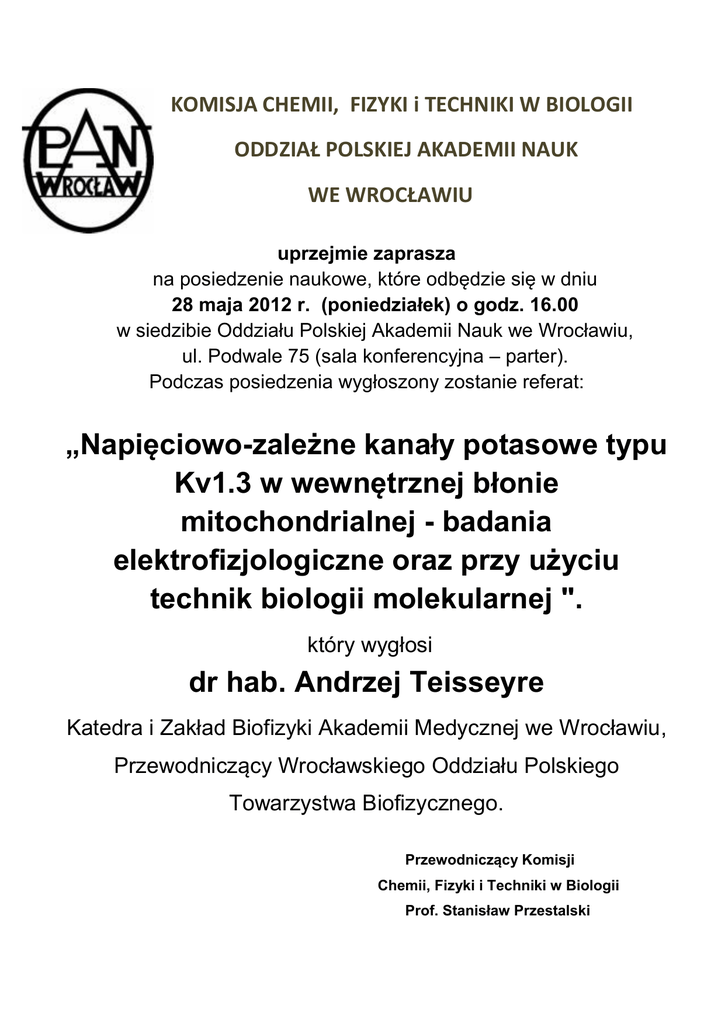 KOMISJA CHEMII, FIZYKI i TECHNIKI W BIOLOGII ODDZIAŁ POLSKIEJ AKADEMII NAUK WE WROCŁAWIU uprzejmie zaprasza na posiedzenie naukowe, które odbędzie się w dniu 28 maja 2012 r. (poniedziałek) o godz. 16.00 w siedzibie Oddziału Polskiej Akademii Nauk we Wrocławiu, ul. Podwale 75 (sala konferencyjna – parter). Podczas posiedzenia wygłoszony zostanie referat: „Napięciowo-zależne kanały potasowe typu Kv1.3 w wewnętrznej błonie mitochondrialnej - badania elektrofizjologiczne oraz przy użyciu technik biologii molekularnej ". który wygłosi dr hab. Andrzej Teisseyre Katedra i Zakład Biofizyki Akademii Medycznej we Wrocławiu, Przewodniczący Wrocławskiego Oddziału Polskiego Towarzystwa Biofizycznego. Przewodniczący Komisji Chemii, Fizyki i Techniki w Biologii Prof. Stanisław Przestalski KOMISJA CHEMII, FIZYKI i TECHNIKI W BIOLOGII ODDZIAŁ POLSKIEJ AKADEMII NAUK WE WROCŁAWIU Streszczenie: Napięciowo-zależne kanały potasowe typu Kv1.3 występują w wielu typach komórek, zarówno elektrycznie niepobudliwych (np. limfocyty T), jak i pobudliwych (np. neurony mózgowe). Stwierdzono także, że liczba kanałów Kv1.3 w błonie komórki może ulegać istotnym zmianom w przypadku niektórych chorób nowotworowych. Badania przeprowadzone w czasie ostatniej dekady wykazały, że kanały Kv1.3 występują nie tylko w błonie cytoplazmatycznej, lecz również w wewnętrznej błonie mitochondrialnej. Kanały Kv1.3 są pierwszymi kanałami z grupy napięciowo-zależnych kanałów potasowych, które odkryto w wewnętrznej błonie mitochondrialnej. Wykazano, że istnieje pozytywna korelacja pomiędzy występowaniem kanałów Kv1.3 w błonie cytoplazmatycznej oraz w wewnętrznej błonie mitochondrialnej. Właściwości kanałów Kv1.3 w wewnętrznej błonie mitochondrialnej zostały zbadane przy zastosowaniu techniki elektrofizjologicznej „patch-clamp” z użyciem tzw. mitoplastów. Występowanie kanałów Kv1.3 w wewnętrznej błonie mitochondrialnej zostało potwierdzone w badaniach z zastosowaniem elektronowej mikroskopii transmisyjnej, cytometrii przepływowej oraz techniki Western Blotting. Badania elektrofizjologiczne wykazały, że właściwości kanałów Kv1.3 w wewnętrznej błonie mitochondrialnej są zbliżone do kanałów w błonie cytoplazmatycznej. Jednakże, w odróżnieniu od kanałów w błonie cytoplazmatycznej, kanały Kv1.3 w wewnętrznej błonie mitochondrialnej wykazują niewielką zależność aktywności od potencjału błonowego. Ponadto, w przeciwieństwie do kanałów w błonie cytoplazmatycznej, aktywacja kanałów Kv1.3 w wewnętrznej błonie mitochondrialnej powoduje napływ jonów potasu do matriks mitochondrialnego i depolaryzację tej błony. Natomiast inhibicja kanałów Kv1.3 w wewnętrznej błonie mitochondrialnej powoduje hiperpolaryzację błony, co potwierdziły badania z zastosowaniem cytometrii przepływowej z użyciem znaczników fluorescencyjnych. Aktywność kanałów Kv1.3 w wewnętrznej błonie mitochondrialnej jest potrzebna do prawidłowego funkcjonowania mitochondriów, natomiast inhibicja tych kanałów, zarówno przez białko pro-apoptotyczne Bax jak i przez inhibitory kanałów Kv1.3 (np. przez margotoksynę – MgTX), jest sygnałem inicjującym aktywację wewnątrzkomórkowego (mitochondrialnego) szlaku apoptozy komórek.