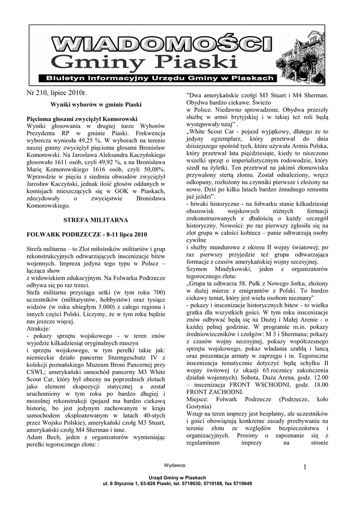 Nr 210, lipiec 2010r. Wyniki wyborów w gminie Piaski Pięcioma głosami zwyciężył Komorowski Wyniki głosowania w drugiej turze Wyborów Prezydenta RP w gminie Piaski. Frekwencja wyborcza wyniosła 49,25 %. W wyborach na terenie naszej gminy zwyciężył pięcioma głosami Bronisław Komorowski. Na Jarosława Aleksandra Kaczyńskiego głosowało 1611 osób, czyli 49,92 %, a na Bronisława Marię Komorowskiego 1616 osób, czyli 50,08%. Wprawdzie w pięciu z siedmiu obwodów zwyciężył Jarosław Kaczyński, jednak ilość głosów oddanych w komisjach mieszczących się w GOK w Piaskach, zdecydowały o zwycięstwie Bronisława Komorowskiego. STREFA MILITARNA FOLWARK PODRZECZE - 8-11 lipca 2010 Strefa militarna – to Zlot miłośników militariów i grup rekonstrukcyjnych odtwarzających inscenizacje bitew wojennych. Impreza jedyna tego typu w Polsce – łącząca show z widowiskiem edukacyjnym. Na Folwarku Podrzecze odbywa się po raz trzeci. Stefa militarna przyciąga setki (w tym roku 700) uczestników (militarystów, hobbystów) oraz tysiące widzów (w roku ubiegłym 5.000) z całego regionu i innych części Polski. Liczymy, że w tym roku będzie nas jeszcze więcej. Atrakcje: - pokazy sprzętu wojskowego - w teren znów wyjedzie kilkadziesiąt oryginalnych maszyn i sprzętu wojskowego, w tym perełki takie jak: niemieckie działo pancerne Sturmgeschutz IV z kolekcji poznańskiego Muzeum Broni Pancernej przy CSWL; amerykański samochód pancerny M3 White Scout Car, który był obecny na poprzednich zlotach jako element ekspozycji statycznej a został uruchomiony w tym roku po bardzo długiej i mozolnej rekonstrukcji (pojazd ma bardzo ciekawą historię, bo jest jedynym zachowanym w kraju samochodem eksploatowanym w latach 40-stych przez Wojsko Polskie), amerykański czołg M3 Stuart, amerykański czołg M4 Sherman i inne. Adam Bech, jeden z organizatorów wymieniając perełki tegorocznego zlotu: : ”Dwa amerykańskie czołgi M3 Stuart i M4 Sherman. Obydwa bardzo ciekawe. Świeżo w Polsce. Niedawno sprowadzone. Obydwa przeszły służbę w armii brytyjskiej i w takiej też roli będą występowały tutaj” . „White Scout Car - pojazd wyjątkowy, dlatego że to jedyny egzemplarz, który przetrwał do dnia dzisiejszego spośród tych, które używała Armia Polska, który przetrwał lata pięćdziesiąte, kiedy to niszczono wszelki sprzęt o imperialistycznym rodowodzie, który szedł na żyletki. Ten przetrwał na jakimś złomowisku przywalony stertą złomu. Został odnaleziony, wręcz odkopany, rozłożony na czynniki pierwsze i złożony na nowo. Dziś po kilku latach bardzo żmudnego remontu już jeździ”. - biwaki historyczne - na folwarku stanie kilkadziesiąt obozowisk wojskowych różnych formacji zrekonstruowanych z dbałością o każdy szczegół historyczny. Nowości: po raz pierwszy zgłosiła się na zlot grupa w całości kobieca – panie odtwarzają osoby cywilne i służby mundurowe z okresu II wojny światowej; po raz pierwszy przyjedzie też grupa odtwarzająca formacje z czasów amerykańskiej wojny secesyjnej. Szymon Mindykowski, jeden z organizatorów tegorocznego zlotu: „Grupa ta odtwarza 58. Pułk z Nowego Jorku, złożony w dużej mierze z emigrantów z Polski. To bardzo ciekawy temat, który jest wielu osobom nieznany” - pokazy i inscenizacje historycznych bitew - to wielka gratka dla wszystkich gości. W tym roku inscenizacje znów odbywać będą się na Dużej i Małej Arenie - o każdej pełnej godzinie. W programie m.in. pokazy średniowieczników i czołgów: M 3 i Shermana; pokazy z czasów wojny secesyjnej, pokazy współczesnego sprzętu wojskowego, pokaz władania szablą i lancą oraz prezentacja armaty w zaprzęgu i in. Tegoroczne inscenizacja tematycznie dotyczyć będą schyłku II wojny świtowej (z okazji 65.rocznicy zakończenia działań wojennych). Sobota, Duża Arena, godz. 12.00 – inscenizacja FRONT WSCHODNI, godz. 18.00 FRONT ZACHODNI. Miejsce: Folwark Podrzecze (Podrzecze, koło Gostynia) Wstęp na teren imprezy jest bezpłatny, ale uczestników i gości obowiązują konkretne zasady przebywania na terenie zlotu ze względów bezpieczeństwa i organizacyjnych. Prosimy o zapoznanie się z regulaminem imprezy na stronie Wydawca: Urząd Gminy w Piaskach ul. 6 Stycznia 1, 63-820 Piaski, tel. 5719030, 5719188, fax 5719049 1 www.strefamilitarna.info. Przede wszystkim apelujemy o: dostosowywanie się do próśb i komend organizatorów, parkowanie samochodów, zajmowanie miejsc, zwiedzanie – w miejscach wyłącznie do tego celu wskazanych. Prosimy o uważne wsłuchiwanie się w komunikaty rozpowszechniane przez głośniki podczas imprezy o dostosowywanie się do próśb z nich wynikających, dotyczących np. umożliwienia przejazdu sprzętom przemieszczającym się na teren pokazów. W razie potrzeby – przez cały czas czynna jest recepcja zlotowa, w której udzielane będą wszystkie informacje. Organizatorzy to: grupa pasjonatów militariów zrzeszona trzech środowiskach: Polskim Klubie Kawaleryjskim, Towarzystwie b. Żołnierzy i Przyjaciół 15. Pułku Ułanów Poznańskich oraz Stowarzyszeniu Rekonstrukcji Historycznych Wojsk II Rzeczpospolitej Odwach". Patronat honorowy sprawuje: Marszałek Województwa Wielkopolskiego Marek Woźniak. Wspierają nas: Samorząd Gminy Gostyń, Samorząd Gminy Piaski oraz Samorząd Powiatu Gostyńskiego. Naszymi partnerami medialnymi są: TVP 3 Poznań, Polskie Radio Merkury Poznań, "Polska The Times/Głos Wielkopolski"; Radio Elka, "Życie Gostynia", Nowa Telewizja Gostyń, gostyn24.pl oraz "Odkrywca", "Do broni", "Automobilista", Wydawnictwo ZP. Adres strony internetowej zlotu: www.strefamilitarna.info PROGRAM ZLOTU 12.00 – 20.00 – inscenizacje i pokazy 12.00 - inscenizacja FRONT WSCHODNI – 1945 (Duża Arena) 13.00 - zbiórka wszystkich grup i pojazdów na Dużej Arenie – prezentacja uczestników Zlotu 13.30 - pokaz współczesnego sprzętu wojskowego (Duża Arena) 14.0