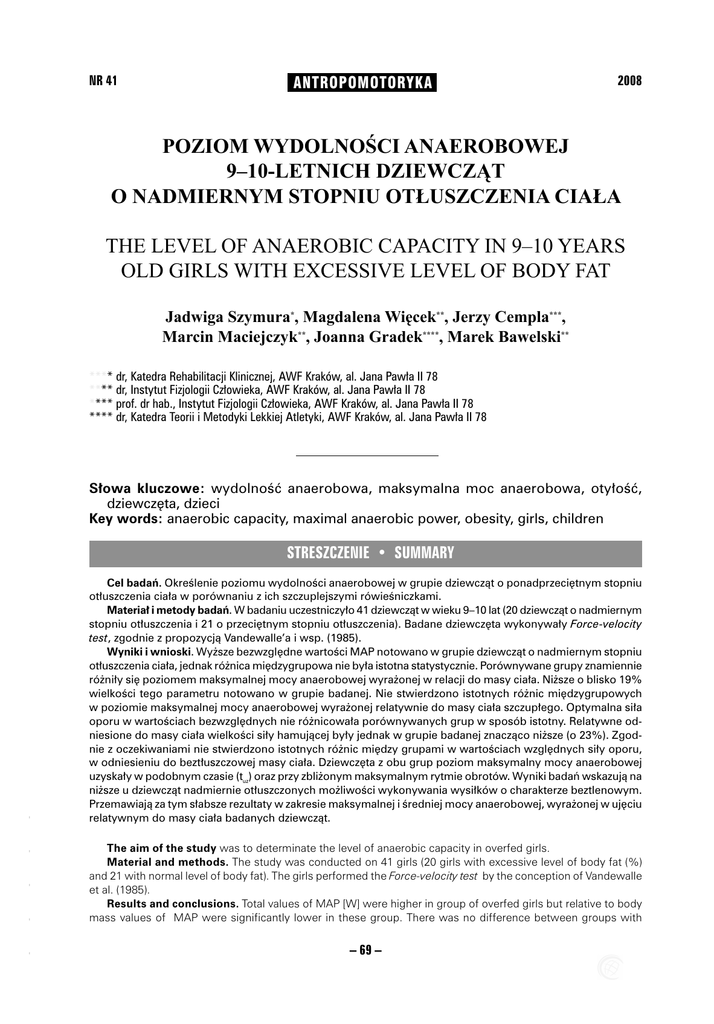 NR 41 AN TRO PO MO TO RY KA 2008 POZIOM WYDOLNOŚCI ANAEROBOWEJ 9–10-LETNICH DZIEWCZĄT O NADMIERNYM STOPNIU OTŁUSZCZENIA CIAŁA THE LEVEL OF ANAEROBIC CAPACITY IN 9–10 YEARS OLD GIRLS WITH EXCESSIVE LEVEL OF BODY FAT Jadwiga Szymura*, Magdalena Więcek**, Jerzy Cempla***, Marcin Maciejczyk**, Joanna Gradek****, Marek Bawelski** **** dr, Katedra Rehabilitacji Klinicznej, AWF Kraków, al. Jana Pawła II 78 **** dr, Instytut Fizjologii Człowieka, AWF Kraków, al. Jana Pawła II 78 **** prof. dr hab., Instytut Fizjologii Człowieka, AWF Kraków, al. Jana Pawła II 78 **** dr, Katedra Teorii i Metodyki Lekkiej Atletyki, AWF Kraków, al. Jana Pawła II 78 Słowa kluczowe: wydolność anaerobowa, maksymalna moc anaerobowa, otyłość, dziewczęta, dzieci Key words: anaerobic capacity, maximal anaerobic power, obesity, girls, children The aim of the study was to determinate the level of anaerobic capacity in overfed girls. Material and methods. The study was conducted on 41 girls (20 girls with excessive level of body fat (%) and 21 with normal level of body fat). The girls performed the Force-velocity test by the conception of Vandewalle et al. (1985). Results and conclusions. Total values of MAP [W] were higher in group of overfed girls but relative to body mass values of MAP were significantly lower in these group. There was no difference between groups with – 69 – - - Cel badań. Określenie poziomu wydolności anaerobowej w grupie dziewcząt o ponadprzeciętnym stopniu otłuszczenia ciała w porównaniu z ich szczuplejszymi rówieśniczkami. Materiał i metody badań. W badaniu uczestniczyło 41 dziewcząt w wieku 9–10 lat (20 dziewcząt o nadmiernym stopniu otłuszczenia i 21 o przeciętnym stopniu otłuszczenia). Badane dziewczęta wykonywały Force-velocity test, zgodnie z propozycją Vandewalle’a i wsp. (1985). Wyniki i wnioski. Wyższe bezwzględne wartości MAP notowano w grupie dziewcząt o nadmiernym stopniu otłuszczenia ciała, jednak różnica międzygrupowa nie była istotna statystycznie. Porównywane grupy znamiennie różniły się poziomem maksymalnej mocy anaerobowej wyrażonej w relacji do masy ciała. Niższe o blisko 19% wielkości tego parametru notowano w grupie badanej. Nie stwierdzono istotnych różnic międzygrupowych w poziomie maksymalnej mocy anaerobowej wyrażonej relatywnie do masy ciała szczupłego. Optymalna siła oporu w wartościach bezwzględnych nie różnicowała porównywanych grup w sposób istotny. Relatywne odniesione do masy ciała wielkości siły hamującej były jednak w grupie badanej znacząco niższe (o 23%). Zgodnie z oczekiwaniami nie stwierdzono istotnych różnic między grupami w wartościach względnych siły oporu, w odniesieniu do beztłuszczowej masy ciała. Dziewczęta z obu grup poziom maksymalny mocy anaerobowej uzyskały w podobnym czasie (tuz) oraz przy zbliżonym maksymalnym rytmie obrotów. Wyniki badań wskazują na niższe u dziewcząt nadmiernie otłuszczonych możliwości wykonywania wysiłków o charakterze beztlenowym. Przemawiają za tym słabsze rezultaty w zakresie maksymalnej i średniej mocy anaerobowej, wyrażonej w ujęciu relatywnym do masy ciała badanych dziewcząt. - - STRESZCZENIE • SUMMARY Jadwiga Szymura, Magdalena Więcek, Jerzy Cempla, Marcin Maciejczyk, Joanna Gradek, Marek Bawelski relation to free fat mass values of MAP. Total and relative to free fat mass values of optimal braking force (Fopt) was similar in both groups, but the girls with excessive level of body fat was significantly lower Fopt in relative to body mass (23%). In both groups, maximal anaerobic power girls have achieved in similar time (tuz) and at approximated rhythm of pedalling. The results indicate that the anaerobic capacity estimated by the relative to body mass values of MAP was significantly lower in girls with excessive level of body fat. It shows that overfed girls have lower abilities to perform short, anaerobic supra maximal efforts. - - - - - Wstęp Rozpowszechnienie występowania nadwagi i otyłości skoncentrowało uwagę specjalistów z wielu dziedzin na poszukiwaniu najskuteczniejszych metod ich leczenia oraz prewencji zarówno w wymiarze indywidualnym, jak i populacyjnym. Olbrzymi wpływ na coraz częstsze występowanie otyłości – obok niewłaściwej diety – przypisuje się stale zmniejszającemu się udziałowi aktywności fizycznej w życiu współczesnych społeczeństw [1, 2]. Leczenie i zapobieganie otyłości, jak się wydaje, ma szczególnie istotne znaczenie – indywidualne i społeczne – w wypadku dzieci otyłych, które nierzadko jeszcze przed wkroczeniem w dorosłe życie zmagają się z wieloma chorobami towarzyszącymi otyłości, takimi jak na przykład cukrzyca czy nadciśnienie tętnicze. Nie ulega wątpliwości, że dzieci z nadwagą i otyłe są zwykle mniej aktywne ruchowo i mniej chętnie podejmują aktywność fizyczną niż ich rówieśnicy o przeciętnym poziomie otłuszczenia, co może przyczyniać się do dalszego rozwoju otyłości [3–5]. Jednocześnie w licznych doniesieniach wskazuje się na istnienie dodatniej korelacji pomiędzy wysoką odsetkową zawartością tkanki tłuszczowej a małą dobową aktywnością ruchową dzieci [6, 5, 7]. Nasuwa się zatem pytanie: Czy dzieci nadmiernie otłuszczone są również mniej wydolne od swoich szczupłych rówieśników? Zdecydowana większość doniesień, w których podejmuje się temat wydolności dzieci, dotyczy wyłącznie energetyki tlenowej. Bierze się to zapewne stąd, że termin ten jest powszechnie utożsamiany z pojęciem ogólnej wydolności organizmu. Na tak rozumianym pojęciu opiera się fizjoterapia czy diagnostyka kliniczna w pełnym tego słowa znaczeniu. Nie sposób pominąć faktu, że pojęcie to – obok wydolności tlenowej – obejmuje również wydolność beztlenową, która jest związana z krótkotrwałym bardzo intensywnym wysiłkiem. Wydolność beztlenowa leży jednak głównie w obszar
