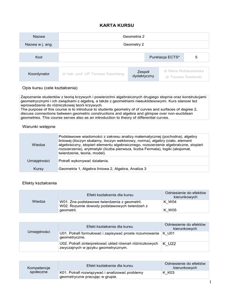 KARTA KURSU Nazwa Geometria 2 Nazwa w j. ang. Geometry 2 Kod Koordynator Punktacja ECTS* dr hab. prof. UP Tomasz Szemberg Zespół dydaktyczny 5 dr Maria Robaszewska dr Tomasz Świderski Opis kursu (cele kształcenia) Zapoznanie studentów z teorią krzywych i powierzchni algebraicznych drugiego stopnia oraz konstrukcjami geometrycznymi i ich związkami z algebrą, a także z geometriami nieeuklidesowymi. Kurs stanowi też wprowadzenie do różniczkowej teorii krzywych. The purpose of this course is to introduce to students geometry of of curves and surfaces of degree 2, discuss connections between geometric constructions and algebra and glimpse over non-euclidean geometries. This course serves also as an introduction to theory of differential curves. Warunki wstępne Wiedza Umiejętności Kursy Podstawowe wiadomości z zakresu analizy matematycznej (pochodna), algebry liniowej (iloczyn skalarny, iloczyn wektorowy, norma), algebry (ciało, element algebraiczny, stopień elementu algebraicznego, rozszerzenie algebraiczne, stopień rozszerzenia), arytmetyki (liczba pierwsza, liczba Fermata), logiki (aksjomat, twierdzenie, teoria, model). Potrafi wykonywać działania. Geometria 1, Algebra liniowa 2, Algebra, Analiza 3 Efekty kształcenia Efekt kształcenia dla kursu Wiedza W01. Zna podstawowe twierdzenia z geometrii. W02. Rozumie dowody podstawowych twierdzeń z geometrii. Odniesienie do efektów kierunkowych K_W04 K_W05 Odniesienie do efektów kierunkowych U01. Potrafi formułować i zapisywać proste rozumowania K_U01 geometryczne. Efekt kształcenia dla kursu Umiejętności U02. Potrafi zinterpretować układ równań różniczkowych zwyczajnych w języku geometrycznym. Kompetencje społeczne Efekt kształcenia dla kursu K01. Potrafi rozwiązywać i analizować problemy geometryczne pracując w grupie. K_U22 Odniesienie do efektów kierunkowych K_K03 1 Organizacja Forma zajęć Ćwiczenia w grupach Wykład (W) Liczba godzin A 30 K L S P E 35 Opis metod prowadzenia zajęć Wykład, zadania tablicowe, praca w grupie, dyskusje. Możliwa realizacja projektów w postaci prac pisemnych do oddania pod koniec kursu. Formy sprawdzania efektów kształcenia E – le ar ni ng Gr y dy da kt yc zn e Ć wi cz en ia w sz ko le Z aj ęc ia te re no w e W01 W02 U01 K01 Kryteria oceny Uwagi Pr ac a la bo ra to ryj na Pr oj ek t in dy wi du al ny X X X Pr oj ek t gr up o w y X X X U dz iał w dy sk us ji x x x x R e f e r a t Pra ca pis em na (es ej) x x x x E gz a mi n us tn y E gz a mi n pi se m ny In ne x x x x Zaliczenie – na podstawie kolokwiów, kartkówek oraz aktywnego uczestnictwa w zajęciach a także na podstawie projektów indywidualnych i grupowych, o ile takie będą realizowane w danym roku akademickim. Wybór konkretnych form sprawdzania wiedzy i umiejętności zależy od prowadzącego przedmiot w danym roku. Prowadzący może w szczególności zrezygnować z pewnych form sprawdzania. Treści merytoryczne (wykaz tematów) 1. Geometria różniczkowa krzywych; parametryzacja dowolna i naturalna krzywej. Krzywizna krzywej i jej interpretacja geometryczna, okrąg ściśle styczny, promień krzywizny. Prosta styczna i normalna do krzywej, płaszczyzna ściśle styczna do krzywej. Reper i trójścian Freneta, wzory Freneta. Skręcenie krzywej i jego interpretacja geometryczna. Równania naturalne krzywej. 2 Badanie kształtu krzywej gładkiej określonej równaniem parametrycznym. 2. Krzywe algebraiczne i powierzchnie algebraiczne stopnia 2. Krzywe stożkowe; podstawowe własności afiniczne i metryczne krzywych stożkowych: środek, średnice, bieguny, biegunowe, asymptoty, ogniska i kierownice. Czwórka harmoniczna punktów. Stożki, walce, hiperboloidy, paraboloidy, elipsoidy; podstawowe własności afiniczne i metryczne tych powierzchni. Płaskie przekroje powierzchni stożkowych. Powierzchnie prostokreślne, powierzchnie obrotowe i powierzchnie powstałe przez przesuwanie krzywej po krzywej. Klasyfikacja afiniczna i metryczna krzywych oraz powierzchni stopnia 2. 3. Klasyczne konstrukcje geometryczne, konstruowalność w ujęciu algebraicznym – twierdzenie Wantzela. Przykłady konstrukcji niewykonalnych środkami klasycznymi (np. podwojenie sześcianu, kwadratura koła, rektyfikacja okręgu, trysekcja pewnych kątów)., rozwiązanie tych problemów nieklasycznymi środkami. Twierdzenie Gaussa o konstruowalność wielokątów foremnych klasycznymi środkami. Konstrukcje wybranych wielokątów foremnych, rozwiązanie problemu z użyciem kwadratrysy Hippiasza. Przegląd zestawów środków równoważnych klasycznym środkom konstrukcyjnym. Konstrukcje Mohra-Mascheroniego, konstrukcje steinerowskie. 4. Aksjomatyczna budowa geometrii. Rola i dzieje aksjomatu Euklidesa, informacje o różnych geometriach. Wykaz literatury podstawowej 1. H. S. M. Coxeter, Wstęp do geometrii dawnej i nowej, PWN, Warszawa 1967. 2. R. Hartshorne, Geometry: Euclid and beyond, Springer, New York, 2000. 3. M. do Carmo, Differential Geometry of Curves and Surfaces, Prentice-Hall Inc. Englewood Cliffs, New Jersey, 1976. Wykaz literatury uzupełniającej 4. K. Borsuk, Geometria analityczna wielowymiarowa, PWN, Warszawa 1976. 5. M. Bryński, M. Włodarski, Konstrukcje geometryczne, WSiP, Warszawa 1979. 6. J. Gancarzewicz, B. Opozda, Wstęp do geometrii różniczkowej, Wydawnictwo UJ, Kraków 2003. 7. B. Gdowski, Elementy geometrii różniczkowej z zadaniami, Oficyna Wydawnicza Politechniki Warszawskiej, Warszawa 1999. 8. A. Goetz, Geometria różniczkowa, PWN, Warszawa 1982. 9. Z. Krygowska, Konstrukcje geometryczne na płaszczyźnie, PWN, Warszawa 1958. 10. F. Leja, Geometria analityczna, PWN, Warszawa 1970. 11. M. Małek, Geometria, Zbiór zadań, GWO, Gdańsk 1994. 12. S. Przybyło, A. Szlachtowski, Algebra i wielowymiarowa geometria analityczna w zadaniach, WNT, Warszawa 1993. 13. S. W. Bachwałow, P. S. Modenow, A. S. Parchomienko, Zbór zadań z geometrii analitycznej, PWN, Warszawa 1961. 14. M. Stark, Geometria a