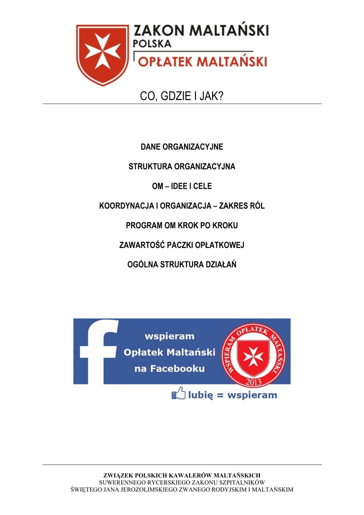 CO, GDZIE I JAK? DANE ORGANIZACYJNE STRUKTURA ORGANIZACYJNA OM – IDEE I CELE KOORDYNACJA I ORGANIZACJA – ZAKRES RÓL PROGRAM OM KROK PO KROKU ZAWARTOŚĆ PACZKI OPŁATKOWEJ OGÓLNA STRUKTURA DZIAŁAŃ ZWIĄZEK POLSKICH KAWALERÓW MALTAŃSKICH SUWERENNEGO RYCERSKIEGO ZAKONU SZPITALNIKÓW ŚWIĘTEGO JANA JEROZOLIMSKIEGO ZWANEGO RODYJSKIM I MALTAŃSKIM CO, GDZIE I JAK? DANE ORGANIZACYJNE ORGANIZATOR: ZWIĄZEK POLSKICH KAWALERÓW MALTAŃSKICH NIP 676-21-19-263 REGON 357053209 Adres: al. Kasztanowa 4a PL - 30-227 Kraków www.zakonmaltanski.pl Adres dla korespondencji: ul. Jazgarzewska 17 PL - 00-730 Warszawa przy współpracy z MIEJSKIMI OŚRODKAMI POMOCY SPOŁECZNEJ KOORDYNACJA: Hanna Wesołowska-Starzec gsm +48 696 402 764 tel. +48 12 261 38 38 fax +48 12 378 35 69 e-mail: [email protected], [email protected] DAROWIZNA PRZEKAZYWANA JEST DO: Fundacji Polskich Kawalerów Maltańskich w Krakowie adres: Al. Kasztanowa 4a, 30-227 Kraków NIP : 677-236-81-11; REGON: 122532627 Konto w PKO Bank Polski SA, Oddział 1 w Krakowie nr: 25 1020 2892 0000 5102 0481 1156 z dopiskiem „Opłatek Maltański”! ZWIĄZEK POLSKICH KAWALERÓW MALTAŃSKICH SUWERENNEGO RYCERSKIEGO ZAKONU SZPITALNIKÓW ŚWIĘTEGO JANA JEROZOLIMSKIEGO ZWANEGO RODYJSKIM I MALTAŃSKIM CO, GDZIE I JAK? Ważne informacje: 1. Darowizny wpłacane są na jedno konto OM, założone dla wszystkich miast. 2. Należy przypominać sponsorom o dopisku „Opłatek Maltański”, do którego można dodać nazwę miasta np. „Opłatek Maltański Kraków”. 3. Dopisek „Opłatek Maltański” oznacza, że darowizna będzie podzielona wedle potrzeb akcji w każdym z miast. 4. Darowiznę przekazuje do poszczególnych miast koordynator główny. STRUKTURA ORGANIZACYJNA OM Organizator – ZPKM przy współpracy MOPS ^ Koordynator główny z ramienia ZPKM ^ Koordynator lokalny z ramienia ZPKM lub MOPS w każdym mieście, w którym odbywa się OM ^ Wolontariusze ZWIĄZEK POLSKICH KAWALERÓW MALTAŃSKICH SUWERENNEGO RYCERSKIEGO ZAKONU SZPITALNIKÓW ŚWIĘTEGO JANA JEROZOLIMSKIEGO ZWANEGO RODYJSKIM I MALTAŃSKIM CO, GDZIE I JAK? OPŁATEK MALTAŃSKI – IDEE I CELE Opłatek Maltański to ogólnopolska akcja charytatywna, której organizator Związek Polskich Kawalerów Maltańskich przy współpracy z Miejskimi Ośrodkami Pomocy Społecznej, co roku zaprasza do świątecznego stołu setki osób: ubogie rodziny wielodzietne, osoby samotne i niepełnosprawne. Kierunek charytatywnych działań Opłatka Maltańskiego skupia się wokół pomocy potrzebującym w sposób dwutorowy: 1. poprzez wsparcie materialne - każda zaproszona osoba otrzymuje żywność, słodycze i kosmetyki, dzieci otrzymują także zabawkę – koszt jednej paczki to min. 50 złotych, poprzez wsparcie duchowe - zaproszenie do wspólnoty stołu wigilijnego, do dzielenia się opłatkiem, wspólnej modlitwy oraz posiłku. 2. SPONSORZY I DARCZYŃCY Realizacja Opłatka Maltańskiego w każdym mieście możliwa jest jedynie dzięki wsparciu darczyńców, sponsorów i wolontariuszy. Przekazana darowizna w całości przeznaczona jest na zakup zawartości świątecznych paczek oraz na organizację miejsca i posiłku dla potrzebujących – zaproszonych gości Opłatka Maltańskiego. Przekazane od firm dary w całości zostają ofiarowane osobom potrzebującym biorącym udział w Opłatku Maltańskim. PATRONAT Honorowymi patronami tego świątecznego spotkania są: JEm. Ks. Franciszek Kardynał Macharski JEm. Ks. Stanisław Kardynał Dziwisz JE Arcybiskup Wiktor Skworc (Katowice) JEm. Ks. Kazimierz Kardynał Nycz (Warszawa) JE Biskup Andrzej Jeż (Tarnów) Prezydent ZPKM Aleksander hr. Tarnowski MEDIA Przygotowania co roku wspierają także patroni medialni: telewizja, radio i prasa. ZWIĄZEK POLSKICH KAWALERÓW MALTAŃSKICH SUWERENNEGO RYCERSKIEGO ZAKONU SZPITALNIKÓW ŚWIĘTEGO JANA JEROZOLIMSKIEGO ZWANEGO RODYJSKIM I MALTAŃSKIM CO, GDZIE I JAK? KRÓTKA HISTORIA OM Pomysł stworzenia Opłatka Maltańskiego zrodził się w 2002 roku kiedy to po raz po raz pierwszy Jerzy Donimirski, Kawaler Maltański zaprosił ubogie rodziny oraz osoby samotne (objęte opieką pomocy społecznej) do wigilijnego stołu w krakowskim Pałacu Pugetów. Do współpracy przy organizacji przyłączyło się kilkanaście firm i osób prywatnych tworząc tym samym wzór dla innych przez kolejne lata organizacji Opłatka Maltańskiego. Pierwsze Opłatki Maltańskie odbywały się w Krakowie, szybko jednak z roku na rok pojawiało się więcej osób chętnych do zorganizowania przedsięwzięcia w kolejnych miastach. Aktualnie w akcji bierze udział 6 miast: Kraków, Katowice, Myślenice, Chrzanów, Wieliczka i Wadowice. KOMU POMAGAMY Zaproszenie na Opłatek Maltański skierowane jest do: 1. ubogich rodzin wielodzietnych, żyjących w ubóstwie, bez możliwości przygotowania własnej wieczerzy wigilijnej, bez możliwości sprawienia dzieciom świątecznego prezentu, 2. osób samotnych, opuszczonych, wykluczonych, dla których spotkanie z innymi ludźmi stanowi rzadkość, a które może stanowić radość i siłę, 3. osób niepełnosprawnych, być może samotnych, ubogich, które nie miałyby jak i z kim spędzić wieczerzy wigilijnej. Dla wielu z tych osób możliwość wzięcia udziału w Opłatku Maltańskim jest jedyną szansą na poczucie świątecznej atmosfery Bożego Narodzenia. IMIENNE ZAPROSZENIE: Każda z zaproszonych osób otrzymuje indywidualne, imienne zaproszenie przekazane przez odpowiedni MOPS. ILOŚĆ OSÓB ZAPROSZONYCH: zależnie od możliwości przyjmującego lokalu oraz środków finansowych. Do tej pory liczba gości w jednym mieście wynosiła od 100 – 160. GDZIE ZORGANIZOWAĆ OM? Opłatki Maltańskie odbywają się w restauracjach proponując gościom wyjątkowy nastrój i jakość przygotowanego posiłku wigilijnego. Celem jest zaproszenie gości w niecodzienne progi oraz umożliwienie im doświadczenia wyjątkowości tego spotkania. ZWIĄZEK POLSKICH KAWALERÓW MALTAŃSKICH SUWERENNEGO RYC