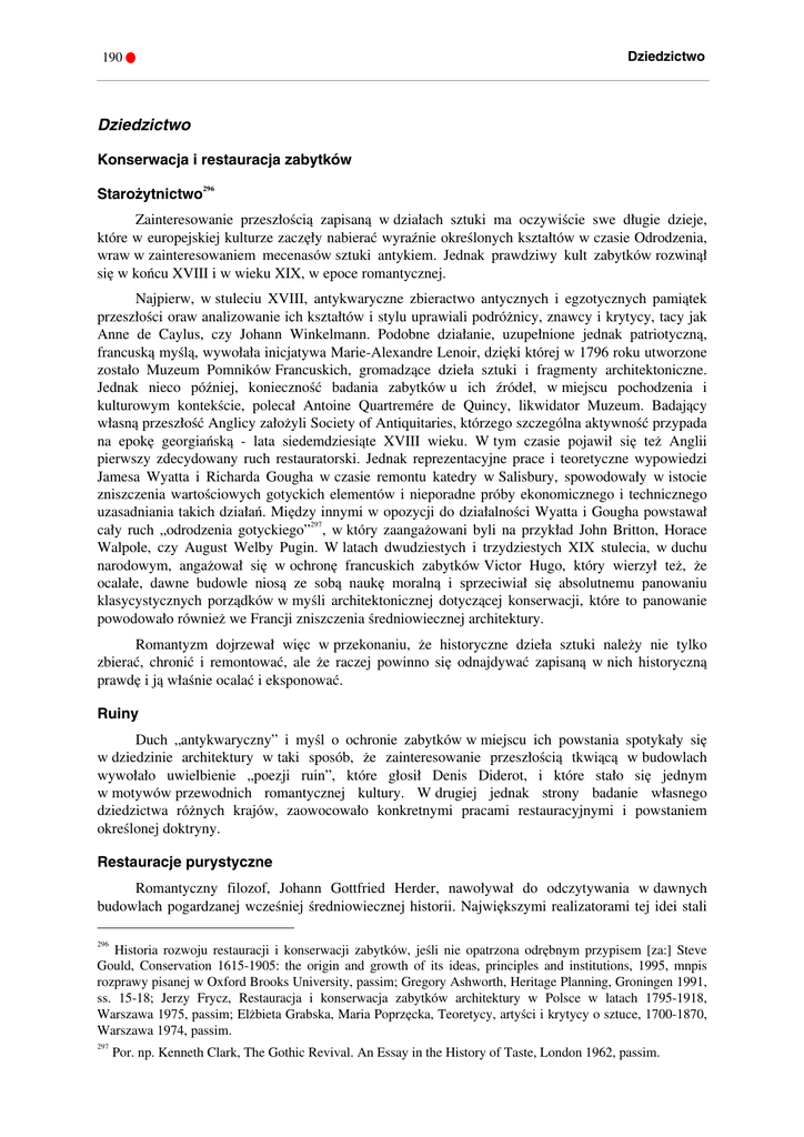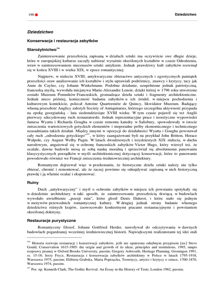 190 Dziedzictwo Dziedzictwo Konserwacja i restauracja zabytków Starożytnictwo296 Zainteresowanie przeszłością zapisaną w działach sztuki ma oczywiście swe długie dzieje, które w europejskiej kulturze zaczęły nabierać wyraźnie określonych kształtów w czasie Odrodzenia, wraw w zainteresowaniem mecenasów sztuki antykiem. Jednak prawdziwy kult zabytków rozwinął się w końcu XVIII i w wieku XIX, w epoce romantycznej. Najpierw, w stuleciu XVIII, antykwaryczne zbieractwo antycznych i egzotycznych pamiątek przeszłości oraw analizowanie ich kształtów i stylu uprawiali podróżnicy, znawcy i krytycy, tacy jak Anne de Caylus, czy Johann Winkelmann. Podobne działanie, uzupełnione jednak patriotyczną, francuską myślą, wywołała inicjatywa Marie-Alexandre Lenoir, dzięki której w 1796 roku utworzone zostało Muzeum Pomników Francuskich, gromadzące dzieła sztuki i fragmenty architektoniczne. Jednak nieco później, konieczność badania zabytków u ich źródeł, w miejscu pochodzenia i kulturowym kontekście, polecał Antoine Quartremére de Quincy, likwidator Muzeum. Badający własną przeszłość Anglicy założyli Society of Antiquitaries, którzego szczególna aktywność przypada na epokę georgiańską - lata siedemdziesiąte XVIII wieku. W tym czasie pojawił się też Anglii pierwszy zdecydowany ruch restauratorski. Jednak reprezentacyjne prace i teoretyczne wypowiedzi Jamesa Wyatta i Richarda Gougha w czasie remontu katedry w Salisbury, spowodowały w istocie zniszczenia wartościowych gotyckich elementów i nieporadne próby ekonomicznego i technicznego uzasadniania takich działań. Między innymi w opozycji do działalności Wyatta i Gougha powstawał cały ruch „odrodzenia gotyckiego”297, w który zaangażowani byli na przykład John Britton, Horace Walpole, czy August Welby Pugin. W latach dwudziestych i trzydziestych XIX stulecia, w duchu narodowym, angażował się w ochronę francuskich zabytków Victor Hugo, który wierzył też, że ocalałe, dawne budowle niosą ze sobą naukę moralną i sprzeciwiał się absolutnemu panowaniu klasycystycznych porządków w myśli architektonicznej dotyczącej konserwacji, które to panowanie powodowało również we Francji zniszczenia średniowiecznej architektury. Romantyzm dojrzewał więc w przekonaniu, że historyczne dzieła sztuki należy nie tylko zbierać, chronić i remontować, ale że raczej powinno się odnajdywać zapisaną w nich historyczną prawdę i ją właśnie ocalać i eksponować. Ruiny Duch „antykwaryczny” i myśl o ochronie zabytków w miejscu ich powstania spotykały się w dziedzinie architektury w taki sposób, że zainteresowanie przeszłością tkwiącą w budowlach wywołało uwielbienie „poezji ruin”, które głosił Denis Diderot, i które stało się jednym w motywów przewodnich romantycznej kultury. W drugiej jednak strony badanie własnego dziedzictwa różnych krajów, zaowocowało konkretnymi pracami restauracyjnymi i powstaniem określonej doktryny. Restauracje purystyczne Romantyczny filozof, Johann Gottfried Herder, nawoływał do odczytywania w dawnych budowlach pogardzanej wcześniej średniowiecznej historii. Największymi realizatorami tej idei stali 296 Historia rozwoju restauracji i konserwacji zabytków, jeśli nie opatrzona odrębnym przypisem [za:] Steve Gould, Conservation 1615-1905: the origin and growth of its ideas, principles and institutions, 1995, mnpis rozprawy pisanej w Oxford Brooks University, passim; Gregory Ashworth, Heritage Planning, Groningen 1991, ss. 15-18; Jerzy Frycz, Restauracja i konserwacja zabytków architektury w Polsce w latach 1795-1918, Warszawa 1975, passim; Elżbieta Grabska, Maria Poprzęcka, Teoretycy, artyści i krytycy o sztuce, 1700-1870, Warszawa 1974, passim. 297 Por. np. Kenneth Clark, The Gothic Revival. An Essay in the History of Taste, London 1962, passim. 191 Dziedzictwo się jednak Francuzi. Jednym w pierwszych francuskich propagatorów purystycznego restaurowania był Marc Antoine Laugier, który w takim duchu konsultował redekorację katedry w Amiens. Rozpoczynający swe działania w 1840 roku Eug ne Emanuel Viollet-le-Duc, okazał się natomiast wielbicielem gotyku i twórcą nowej doktryny, zwanej purystyczną, która nakazywała najpierw bardzo dokładnie badać historię i stan zachowania obiektu, a potem odtwarzać wczesny (najczęściej więc średniowieczny) kształt restaurowanego obiektu. Nawet za cenę zniszczenia późniejszych dodatków i nawet przew współczesne uzupełnianie dzieła stylizowanymi elementami. Postulat utrzymywania historycznych nawarstwień, dla Viollet-le-Duca odnosił się jedynie do średniowiecznych faw budowy. Spośród wielu dzieł mistrza restauracji, najsłynniejsze okazały się zregotycyzowanie i neogotyckie uzupełnienie paryskiej katedry Notre Dame, prace w pobliskiej Sainte Chapelle, czy restauracja miasta Carcassonne. Ogromną rolę odegrały też jego publikacje w lat sześćdziesiątych i siedemdziesiątych XIX wieku: „Dictionaire raisonné de l’architecture française du XIe au XVe si cle” i „Entretiens sur l’Architecture”. Regotycyzacje udowadniać też miały „francuskość” średniowiecznej architektury sakralnej, bowiem gotyk uznano ostatecznie za styl właściwy dla ziem francuskich. W doktrynie purystycznej restauracji obecna była zatem patriotyczna myśl, która towarzyszyła francuskiemu, romantycznemu kultowi przeszłości i sztuki już wcześniej. Wśród Niemców, autor artykułów o zabytkach Nadrenii, czy eseju „O niemieckiej architekturze”, Johann Wolfgang Goethe, powodowany myślą o konieczności analizowania i chronienia niemieckiego, narodowego ducha ujawniającego się w historii ilustrowanej architekturą, był też wielkim zwolennikiem restauracyjnego dokończenia budowy katedry w Kolonii, które ostatecznie zaprojektowali, podobnie ożywieni na równi kultem historii i narodu, bracia Melchior i Sulpiw Boissere