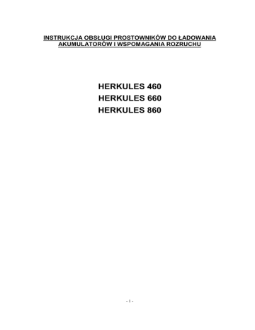 INSTRUKCJA OBSŁUGI PROSTOWNIKÓW DO ŁADOWANIA AKUMULATORÓW I WSPOMAGANIA ROZRUCHU HERKULES 460 HERKULES 660 HERKULES 860 -1- SPIS TREŚCI 1.Uwagi ogólne…………………………................…....……………………… 3 2. Ogólna charakterystyka.………….……………………….….………..….…. 3 3. Dane techniczne………………………………………...………..….........…. 4 4. Opis panelu HERKULES 460……………………………………….. 4 6. Opis panelu HERKULES 660/860…………………………………….. 5 7. Przygotowanie prostownika do pracy………………….............………….... 5 8. Przygotowanie akumulatora do ładowania…………………......………...... 6 9. Ładowanie akumulatora…………………………………………………….. 6 10. Rozruch silnika spalinowego……………………………………………….. 7 11. Zakłócenia w pracy prostownika…………………………………………… 7 12. Konserwacja………............……………...………..…………..…………… 8 13. Bezpieczeństwo użytkowania………...…………….……………...……..... 8 -2- 1. UWAGI OGÓLNE Uruchomienie, instalacji i eksploatacji prostowników do ładowania akumulatorów i wspomagania rozruchu, można dokonać tylko po dokładnym zapoznaniu się z niniejszą instrukcją obsługi. Nieprzestrzeganie zaleceń zawartych w tej instrukcji może narazić użytkownika na poważne obrażenia ciała, śmierć lub uszkodzenia samego urządzenia. Nie można dopuszczać dzieci w pobliże miejsca pracy i do urządzenia. Obsługa serwisowa i naprawy tych urządzeń mogą być prowadzone przez wykwalifikowany personel, z zachowaniem warunków bezpieczeństwa pracy obowiązujących dla urządzeń elektrycznych. Przeróbki we własnym zakresie mogą spowodować zmianę cech użytkowych urządzeń lub pogorszenia parametrów. Wszelkie przeróbki urządzeń, we własnym zakresie, powodują nie tylko utratę gwarancji, ale mogą być przyczyną pogorszenia się warunków bezpieczeństwa użytkowania i narażenia użytkownika na niebezpieczeństwo porażenia prądem. Niewłaściwe warunki pracy mogą spowodować uszkodzenia urządzenia oraz jego niewłaściwa obsługa, powoduje utratę gwarancji. Zgodnie z Dyrektywą Europejską 2002/96/EC dotyczącą Pozbywania się zużytego Sprzętu Elektrycznego i Elektronicznego i jej wprowadzeniem w życie zgodnie z międzynarodowym prawem, zużyty sprzęt elektryczny musi być składowany oddzielnie i specjalnie utylizowany. Jako właściciel urządzeń powinieneś otrzymać informacje o zatwierdzonym systemie składowania od naszego lokalnego przedstawiciela. Nie wyrzucać osprzętu elektrycznego razem z normalnymi odpadami! Stosując te wytyczne będziesz chronił środowisko i zdrowie człowieka! 2. OGÓLNA CHARAKTERYSTYKA HERKULES 460, HERKULES 660, HERKULES 860 to urządzenie prostownikowe do ładowania akumulatorów i wspomagania rozruchu, spełniające wymagania norm europejskich w zakresie bezpieczeństwa i kompatybilności elektromagnetycznej /EMC/. Proces jego wytwarzania odpowiada standardowi Systemu Jakości ISO 9001. Prostownik przeznaczone są do ładowania eksploatacyjnego akumulatorów ołowiowych otwartych i "bezobsługowych wg. norm IEC i DIN" stosowanych w dużych samochodach ciężarowych, maszynach drogowych i budowlanych, posiadających instalację elektryczną o napięciu 12V lub 24 V, oraz dodatkowo do wspomagania rozruchu silników spalinowych - benzynowych i wysokoprężnych - w przypadku akumulatora wyładowanego i niskich temperatur otoczenia, o ile instrukcja obsługi pojazdu nie zabrania stosować urządzeń rozruchowych. Posiada możliwość regulowania charakterystyki wyjściowej tzn. uniezależnienia jej od wahań napięcia sieciowego. Czas ładowania akumulatorów zależy od ich pojemności znamionowej i stopnia rozładowania . Prostowniki przystosowane są do zasilania z sieci jednofazowej 230 V, 60 Hz. Wyposażone są w przełącznik wyboru napięcia ładowania. Odporne są na zwarcie przewodów wyjściowych, na przeciążenia i odwrotne przyłączenie do biegunów akumulatora. Wyposażone są w zabezpieczenie termiczne przed nadmiernym nagrzewaniem się transformatora wskutek np. zwarcia ogniwa w akumulatorze. -3- 3. DANE TECHNICZNE TYP URZĄDZENIA Napięcie zasilania Maksymalny pobór mocy [kW] Napięcie ładowania [V] Prąd rozruchu [A] Max pojemność akumulatora [Ah] Ilość stopni ładowania Waga [kg] HERKULES 350 230V 50Hz HERKULES 460 230V 50Hz HERKULES 550 230V 50Hz HERKULES 660 230V 50Hz HERKULES 860 230V 50Hz 1.0 1.6 1,6 2.0 3.0 12/24 12/24 12/24 12/24 12/24 250 300 400 600 800 500 700 800 1000 1400 2 + rozruch 2 + rozruch 6 + rozruch 6 + rozruch 6 + rozruch 16 18 28 30 32 4. OPIS PANELU HERKULES 460 -4- 6. OPIS PANELU DINAMIK 660/860 7. PRZYGOTOWANIE PROSTOWNIKA DO PRACY Po wyciagnięciu prostownika z opakowania, rozwinąć wszystkie przewody przyłączeniowe. Podłączać przewody wyjściowe do odpowiednich gniazd (jeśli są) w zależności od napięcia ładowania 12/24V. Podobnie postawić z przełącznikiem zmiany napięcia ładowania/rozruchu. Sprawdzić czy bezpiecznik jest o nominalnym zabezpieczeniu, w razie wadliwego lub niewłaściwego usunąć lub wymienić na właściwy. Sprawdzić czy wyłącznik jest w pozycji wyłączonej. Podłączyć przewód zasilający do instalacji zasilającej. Aby przedłużyć żywotność i niezawodną pracę prostownika i akumulatora, należy przestrzegać kilku zasad Nie ładować akumulatorów uszkodzonych oraz nieprzystosowanych do ponownego ładowania. Przestrzegać wskazówek producenta akumulatorów oraz producenta pojazdu. Przed włożeniem lub wyciągnięciem akumulatorów wyłączyć urządzenie z sieci. Elementy konstrukcyjne urządzenia wytwarzają łuki świetlne oraz iskry Urządzenie używać tylko w pomieszczeniach dobrze wywietrzonych