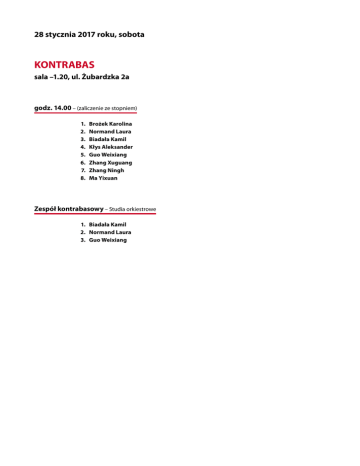 28 stycznia 2017 roku, sobota KONTRABAS sala –1.20, ul. Żubardzka 2a godz. 14.00 – (zaliczenie ze stopniem) 1. 2. 3. 4. 5. 6. 7. 8. Brożek Karolina Normand Laura Biadała Kamil Kłys Aleksander Guo Weixiang Zhang Xuguang Zhang Ningh Ma Yixuan Zespół kontrabasowy – Studia orkiestrowe 1. Biadała Kamil 2. Normand Laura 3. Guo Weixiang