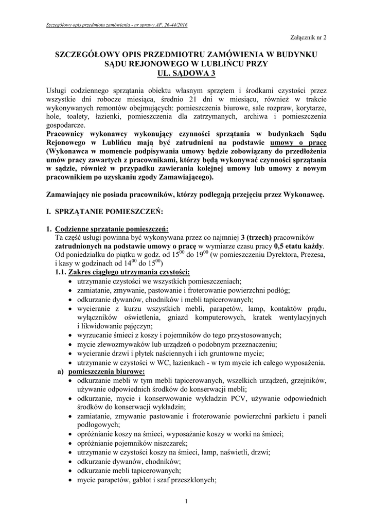 Szczegółowy opis przedmiotu zamówienia - nr sprawy AF. 26-44/2016 Załącznik nr 2 SZCZEGÓŁOWY OPIS PRZEDMIOTRU ZAMÓWIENIA W BUDYNKU SĄDU REJONOWEGO W LUBLIŃCU PRZY UL. SĄDOWA 3 Usługi codziennego sprzątania obiektu własnym sprzętem i środkami czystości przez wszystkie dni robocze miesiąca, średnio 21 dni w miesiącu, również w trakcie wykonywanych remontów obejmujących: pomieszczenia biurowe, sale rozpraw, korytarze, hole, toalety, łazienki, pomieszczenia dla zatrzymanych, archiwa i pomieszczenia gospodarcze. Pracownicy wykonawcy wykonujący czynności sprzątania w budynkach Sądu Rejonowego w Lublińcu mają być zatrudnieni na podstawie umowy o pracę (Wykonawca w momencie podpisywania umowy będzie zobowiązany do przedłożenia umów pracy zawartych z pracownikami, którzy będą wykonywać czynności sprzątania w sądzie, również w przypadku zawierania kolejnej umowy lub umowy z nowym pracownikiem po uzyskaniu zgody Zamawiającego). Zamawiający nie posiada pracowników, którzy podlegają przejęciu przez Wykonawcę. I. SPRZĄTANIE POMIESZCZEŃ: 1. Codzienne sprzątanie pomieszczeń: Ta część usługi powinna być wykonywana przez co najmniej 3 (trzech) pracowników zatrudnionych na podstawie umowy o pracę w wymiarze czasu pracy 0,5 etatu każdy. Od poniedziałku do piątku w godz. od 1500 do 1900 (w pomieszczeniu Dyrektora, Prezesa, i kasy w godzinach od 1400 do 1500) 1.1. Zakres ciągłego utrzymania czystości: utrzymanie czystości we wszystkich pomieszczeniach; zamiatanie, zmywanie, pastowanie i froterowanie powierzchni podłóg; odkurzanie dywanów, chodników i mebli tapicerowanych; wycieranie z kurzu wszystkich mebli, parapetów, lamp, kontaktów prądu, wyłączników oświetlenia, gniazd komputerowych, kratek wentylacyjnych i likwidowanie pajęczyn; wyrzucanie śmieci z koszy i pojemników do tego przystosowanych; mycie zlewozmywaków lub urządzeń o podobnym przeznaczeniu; wycieranie drzwi i płytek naściennych i ich gruntowne mycie; utrzymanie w czystości w WC, łazienkach - w tym mycie ich całego wyposażenia. a) pomieszczenia biurowe: odkurzanie mebli w tym mebli tapicerowanych, wszelkich urządzeń, grzejników, używanie odpowiednich środków do konserwacji mebli; odkurzanie, mycie i konserwowanie wykładzin PCV, używanie odpowiednich środków do konserwacji wykładzin; zamiatanie, zmywanie pastowanie i froterowanie powierzchni parkietu i paneli podłogowych; opróżnianie koszy na śmieci, wyposażanie koszy w worki na śmieci; opróżnianie pojemników niszczarek; utrzymanie w czystości koszy na śmieci, lamp, naświetli, drzwi; odkurzanie dywanów, chodników; odkurzanie mebli tapicerowanych; mycie parapetów, gablot i szaf przeszklonych; 1 Szczegółowy opis przedmiotu zamówienia - nr sprawy AF. 26-44/2016 odkurzanie na sucho drobnych sprzętów biurowych (telefony, faksy, komputery itp.) posprzątanie po ewentualnych awariach lub pracach remontowo – budowlanych; b) sale rozpraw: odkurzanie mebli w tym mebli tapicerowanych, wszelkich urządzeń, grzejników, używanie odpowiednich środków do konserwacji mebli; odkurzanie, mycie i konserwowanie płytek ceramicznych, używanie odpowiednich środków do konserwacji płytek; konserwacja parkietów, używanie odpowiednich środków do konserwacji parkietów; opróżnianie koszy na śmieci, wyposażanie koszy w worki na śmieci; utrzymanie w czystości koszy na śmieci, lamp, drzwi; odkurzanie mebli tapicerowanych; mycie parapetów; odkurzanie i konserwacja boazerii drewnianej; odkurzanie na sucho drobnych sprzętów biurowych posprzątanie po ewentualnych awariach lub pracach remontowo – budowlanych. c) korytarze, hole: zamiatanie korytarzy i usuwanie zanieczyszczeń pozostawionych przez interesantów tj. papierów gum do żucia, niedopałków papierosów, oraz opakowań po materiałach biurowych. itp. mycie kompleksowe schodów i poręczy schodowych i powierzchni przychodowych; utrzymanie w czystości wycieraczek; odkurzanie poręczy schodowych i gablot; utrzymanie w czystości naświetli oraz drzwi; opróżnianie koszy na śmieci w tym również na zewnątrz sądu (2 sztuki), wyposażanie koszy w worki na śmieci; odkurzanie parapetów oraz wszelkich sprzętów znajdujących się na korytarzach, jak gabloty, terminale SWOR, tablice, gaśnice, itp.; usuwanie bieżących zabrudzeń ścian i sufitów, możliwych do wyczyszczenia i konserwacja powierzchni ścian; czyszczenie drzwi wewnętrznych do pomieszczeń oraz zewnętrznych budynku odpowiednimi środkami; zamiatanie i zmywanie schodów wejściowych do budynku (główne wejście i dwa boczne wejścia); konserwacja posadzki; wycieranie i czyszczenie poręczy, balustrad; wycieranie i czyszczenie windy, zewnątrz i wewnątrz; posprzątanie po ewentualnych awariach lub pracach remontowo - budowlanych. d) toalety i łazienki: zamiatanie i mycie podłóg; kompleksowe mycie płytek ceramicznych (ściany i podłoga) na mokro; utrzymanie w czystości umywalek, sedesów, pisuaru i luster; bieżące uzupełnianie mydła w płynie, ręczników papierowych, papieru toaletowego, środków zapachowych; opróżnianie koszy na śmieci, wyposażanie koszy w worki na śmieci; opróżnianie koszy z ręcznikami i pozostałymi materiałami sanitarnymi; 2 Szczegółowy opis przedmiotu zamówienia - nr sprawy AF. 26-44/2016 neutralizacja nieprzyjemnych zapachów w toaletach; usuwanie bieżących zabrudzeń ścian i sufitów, możliwych do wyczyszczenia; posprzątanie po ewentualnych awariach lub pracach remontowo - budowlanych. e) pomieszczenia dla zatrzymanych: zamiatanie i mycie posadzek; utrzymanie w czystości umywalek, sedesów; bieżące uzupełnianie mydła w płynie, ręczników papierowych, papieru toaletowego, środków zapachowych; opróżnianie koszy na śmieci, wyposażanie koszy w worki na śmieci; mycie płytek ceramicznych; czyszczenie krat; usuwanie bieżących zabrudzeń ścian i sufitów, możliwych do wyczyszczenia; posprzą