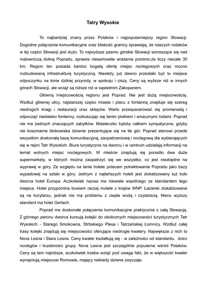 Tatry Wysokie To najbardziej znany przez Polaków i najpopularniejszy region Słowacji. Dogodne połączenia komunikacyjne oraz bliskość granicy sprawiają, że naszych rodaków w tej części Słowacji jest dużo. To najwyższe pasmo górskie Słowacji wznoszące się nad malowniczą doliną Popradu, sprawia niesamowite wrażenie pomimo,że liczy niecałe 30 km. Region ten posiada bardzo bogatą ofertę miejsc noclegowych oraz mocno rozbudowaną infrastrukturę turystyczną. Niestety, już dawno przestało być tu miejsce odpoczynku na łonie dzikiej przyrody, w spokoju i ciszy. Ceny są wyższe niż w innych górach Słowacji, ale wciąż są niższe niż w sąsiednim Zakopanem. Główną miejscowością regionu jest Poprad. Nie jest dużą miejscowością. Wzdłuż głównej ulicy, najstarszej części miasta i placu z fontanną znajduje się szereg niedrogich knajp i restauracji oraz sklepów. Warto przespacerować się promenadą i odpocząć niedaleko fontanny, rozkoszując się tanim piwkiem i smacznymi lodami. Poprad nie ma żadnych znaczących zabytków. Miasteczko byłoby całkiem sympatyczne, gdyby nie koszmarne blokowiska dziwnie prezentujące się na tle gór. Poprad stanowi przede wszystkim doskonałą bazę komunikacyjną, zaopatrzeniową i noclegową dla wybierających się w rejon Tatr Wysokich. Biura turystyczne na dworcu i w centrum udzielają informacji na temat wolnych miejsc noclegowych. W mieście znajdują się ponadto dwa duże supermarkety, w których można zaopatrzyć się we wszystko, co jest niezbędne na wyprawę w góry. Ze względu na tanie hotele polecam potraktowanie Popradu jako bazy wypadowej na szlaki w góry. Jednym z najtańszych hoteli jest zlokalizowany tuż koło dworca hotel Europa. Aczkolwiek nazwa ma niewiele wspólnego ze standardem tego miejsca. Hotel przypomina bowiem raczej motele z krajów WNP. Łazienki zlokalizowane są na korytarzu, jednak nie ma problemu z ciepła wodą i czystością. Nieco wyższy standard ma hotel Gerlach. Poprad ma doskonałe połączenia komunikacyjne praktycznie z całą Słowacją. Z górnego peronu dworca kursują kolejki do okolicznych miejscowości turystycznych Tatr Wysokich - Starego Smokowca, Strbskiego Plesa i Tatrzańskiej Łomnicy. Wzdłuż całej trasy kolejki znajdują się miejscowości oferujące niedrogie kwatery. Największe z nich to Nova Lesna i Stara Lesna. Ceny kwater kształtują się - w zależności od standardu, ilości noclegów i liczebności grupy. Nova Lesna jest szczególnie popularna wśród Polaków. Ceny są tam najniższe, aczkolwiek trzeba wziąć pod uwagę fakt, że w większość kwater wynajmują miejscowi Romowie, mający niekiedy dziwne zwyczaje. Stary Smokowiec to niewielka miejscowość położona u podnóży Hrebienoka. Mając chwilkę czasu do odjazdu kolejki warto pospacerować sobie wokół starego hotelu oraz dworca. Ze Starego Smokowca rozpoczynają się najciekawsze szlaki w wysokie partie gór. Stąd odjeżdża też kolejka szynowa na górę Hrebienok. Jej cena nieco szokuje, zważywszy na czas jazdy. Zatem wybierając się codziennie w trasy, należy uwzględnić wjazd na Hrebienok, skąd zaczynają się najbardziej widokowe szlaki. W Starym Smokowcu znajduje się też informacja turystyczna, w której można zakupić mapy, spytać o wolne miejsca noclegowe w okolicy oraz zasięgnąć informacji na temat ciekawych szlaków. Najłatwiejsza trasa prowadzi do Wodospadów Studentskich - około 30 min. piechotą z Hrebienoka. Bardzo interesujący, choć nieco męczący jest szlak niebieski wzdłuż Studentskiego potoku. Jeżeli jednak spadnie deszcz, szlak ten zamienia się w rwący strumień. Pozostałe szlaki wymagają więcej trudu, lepszej kondycji i niemałego doświadczenia. Wbrew temu, co twierdzą zachodnie przewodniki dotyczące Słowacji, niebieski szlak na Slavkovsky Stit nie jest łatwy. Nie ma co prawda bardzo trudnych podejść, ale skalista trasa złożona z wysokich stopni skalnych oraz czas trwania i konieczność posiadania bardzo dobrej kondycji wyklucza przypadkowych turystów i amatorów. Planując trasę, należy uwzględnić szybko zmieniającą się pogodę oraz pewną specyfikę tej części gór. Bardzo często latem zdarzają się gwałtowne, bardzo intensywne burze i opady deszczu, po których temperatura momentalnie spada. Spoglądając na mapę Tatr Wysokich, należy także wziąć pod uwagę, że czerwone szlaki z zaznaczonymi łańcuchami są dość niebezpieczne i wymagają dużego doświadczenia w chodzeniu, odporności na lęk wysokości, żelaznej kondycji, doświadczenia i odwagi. Znaczna część turystów po wyjściu ze schroniska na czerwony szlak, gdy widzi prawie pionową ścianę z łańcuchami, zawraca, zdając sobie sprawę z trudności szlaku. Trzeba pamiętać, że nie są to szlaki dla osób uczących się chodzić po górach, albo tych, którzy nie mają odpowiedniego doświadczenia. Konieczne jest także zabranie odpowiedniego wyposażenia, zapasu żywności i ciepłej odzieży. W trosce o własne bezpieczeństwo należy się odpowiednio zaopatrzyć i nie podejmować wędrówki, nie czując się na siłach na taką eskapadę. Należy pamiętać, że są to góry niebezpieczne. Stanowią idealne miejsce na odpoczynek, ale dla ludzi z wyobraźnią oraz odpowiedzialnych. Szlaki są dość dobrze oznakowane, co jakiś czas pokazują się informację na temat czasów przejść. Biorąc pod uwagę średnią kondycję i normalne tempo czasy te są nieco zawyżone. Trzeba jednak uwzględnić przerwy na odpoczynek i ewentualnie posiłek. Nieco mniejszą miejscowością, położoną 5 km od Starego Smokowca, jest Tatrzańska Łomnica. Prowadzi stąd kolejka na Łomnicki Szczyt. Cena tego wjazdu powoduje, że znaczna część turystów wspina się samodzielnie na położone nieco poniżej Łomnickie Siedlo, a dopiero stamtąd wjeżdża na szczyt Łomnicy. Miejscowość ta jest znacznie mniej popularna wśród turystów z racj