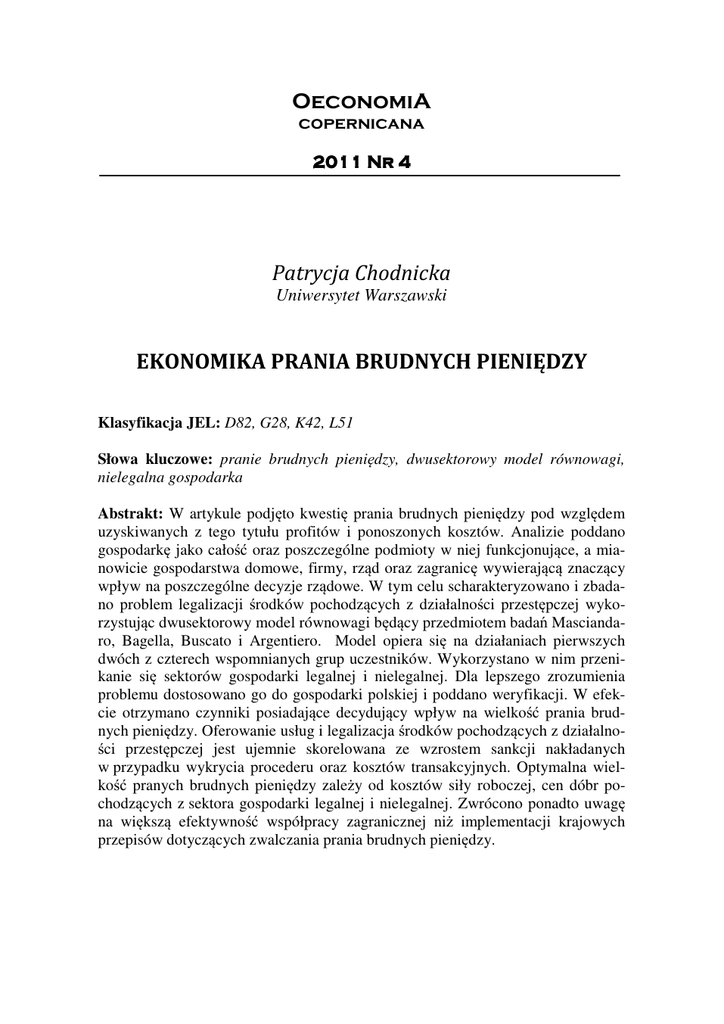 OeconomiA copernicana 2011 Nr 4 Patrycja Chodnicka Uniwersytet Warszawski EKONOMIKA PRANIA BRUDNYCH PIENIĘDZY Klasyfikacja JEL: D82, G28, K42, L51 Słowa kluczowe: pranie brudnych pieniędzy, dwusektorowy model równowagi, nielegalna gospodarka Abstrakt: W artykule podjęto kwestię prania brudnych pieniędzy pod względem uzyskiwanych z tego tytułu profitów i ponoszonych kosztów. Analizie poddano gospodarkę jako całość oraz poszczególne podmioty w niej funkcjonujące, a mianowicie gospodarstwa domowe, firmy, rząd oraz zagranicę wywierającą znaczący wpływ na poszczególne decyzje rządowe. W tym celu scharakteryzowano i zbadano problem legalizacji środków pochodzących z działalności przestępczej wykorzystując dwusektorowy model równowagi będący przedmiotem badań Masciandaro, Bagella, Buscato i Argentiero. Model opiera się na działaniach pierwszych dwóch z czterech wspomnianych grup uczestników. Wykorzystano w nim przenikanie się sektorów gospodarki legalnej i nielegalnej. Dla lepszego zrozumienia problemu dostosowano go do gospodarki polskiej i poddano weryfikacji. W efekcie otrzymano czynniki posiadające decydujący wpływ na wielkość prania brudnych pieniędzy. Oferowanie usług i legalizacja środków pochodzących z działalności przestępczej jest ujemnie skorelowana ze wzrostem sankcji nakładanych w przypadku wykrycia procederu oraz kosztów transakcyjnych. Optymalna wielkość pranych brudnych pieniędzy zależy od kosztów siły roboczej, cen dóbr pochodzących z sektora gospodarki legalnej i nielegalnej. Zwrócono ponadto uwagę na większą efektywność współpracy zagranicznej niż implementacji krajowych przepisów dotyczących zwalczania prania brudnych pieniędzy. 74 Patrycja Chodnicka THE ECONOMICS OF MONEY LAUNDERING JEL Classification Codes: D82, G28, K42, L51 Keywords: money laundering, two-sector equilibrium model, illegal economy Abstract: In the paper was taken problem of money laundering in respect of receiving income and incurring expenses. It was looked at economy as whole and individual entities that are households, companies, government and foreign countries which exercising significant influence on particular government decisions. In this purpose was characterized and researched problem of legalizing funds generated by illegal activities by using two - sector equilibrium model which is object of Masciandaro, Bagella, Buscato and Argentiero researches. Model is based on activities first two of four mentioned participants. In this model it was used two sectors of economy: legal and illegal. For better understanding problem, model was adapted to polish economy and verified. As a result were received factors which had deciding influence on quantity of money laundering. Offering services and legalization funds generated by illegal activities has got negative correlation with increasing sanctions which are applying in case of detection and transactional costs. Optimal quantity of money laundering depends on workforce costs and prices both goods becoming form legal and illegal economy. Moreover it was drawn attention to bigger effectiveness of foreign cooperation than implementation of national anti-money laundering policy. WPROWADZENIE Pranie brudnych pieniędzy jest zjawiskiem transgranicznym, obecnym w każdym kraju na świecie. Pochodzi od angielskiego zwrotu money laundering i oznacza w sensie largo każdą działalność generowaną przez kryminalną i nielegalną aktywność (Masciandaro 2004). Jej celem jest redukowanie specyficznych kosztów transakcyjnych wywołanych nielegalnym źródłem pochodzenia tych środków. Ekonomiczna funkcja tego procederu polega na transformowaniu dochodów z nielegalnego źródła pochodzenia lub potencjalnej siły nabywczej w realną siłę nabywczą użyteczną dla konsumpcji, oszczędności, czy inwestycji (Masciandaro 2007). Szacuje się, iż proceder ten może sięgać około 5% – 7% PKB (Quirk 1997, Schneider 2008, 2010). Legalizacja środków pochodzących z działalności niezgodnej z prawem przynosi wiele strat dla gospodarki. W sensie makroekonomicznym powoduje: − brak stabilności instytucji finansowych, Ekonomika prania brudnych pieniędzy 75 naruszanie zasad gospodarki rynkowej, niszczenie uczciwej konkurencji, destabilizację systemu finansowego państwa, kumulowanie kapitału w rękach przestępców, obniżanie dochodów państwa z tytułu podatków, co wpływa niekorzystanie na podatników, − spadek atrakcyjności inwestycyjnej państwa, − wpływ skorumpowanych polityków na procesy legislacyjne, podporządkowane interesom grup przestępczych, − nakładanie kar i odseparowywanie państw z areny międzynarodowej. W sensie mikroekonomicznym pranie brudnych pieniędzy skutkuje: − upadkiem reputacji, a także wizerunku instytucji, w której ulokowano środki pochodzące z nielegalnych źródeł, − podejmowaniem niesłusznych decyzji przez skorumpowanych pracowników, wbrew interesom instytucji finansowej, − nakładaniem sankcji karnych, finansowych, administracyjnych na instytucję oraz uczestników procederu (Grzywacz, 2010). Efektem wszystkich wspomnianych działań są wysokie koszty ponoszone przez system w celu neutralizacji tego zjawiska. Jednymi podmiotami, które czerpią zyski z tego procederu są organizacje, bądź poszczególne osoby bezpośrednio w niego zaangażowane. Z punktu widzenia państwa, czy też instytucji finansowych działania w tym zakresie stanowią tylko i wyłącznie nakłady ponoszone na jego zwalczanie. Należy ponadto podkreślić, iż wpływ na wielkość czarnego rynku ma rozwój eurorynku i globalizacja usług finansowych. Pojawiające się usługi e – bankingu utrudniają lokalizację środków i ułatwiają poprzez obniżanie kosztów transakcyjnych proces legalizacji dochodów z działalności niezgodnej z prawem. Globalizacja gospodarki światowej powoduje ponadto otwieranie supermarketów finansowych oferujących szerok