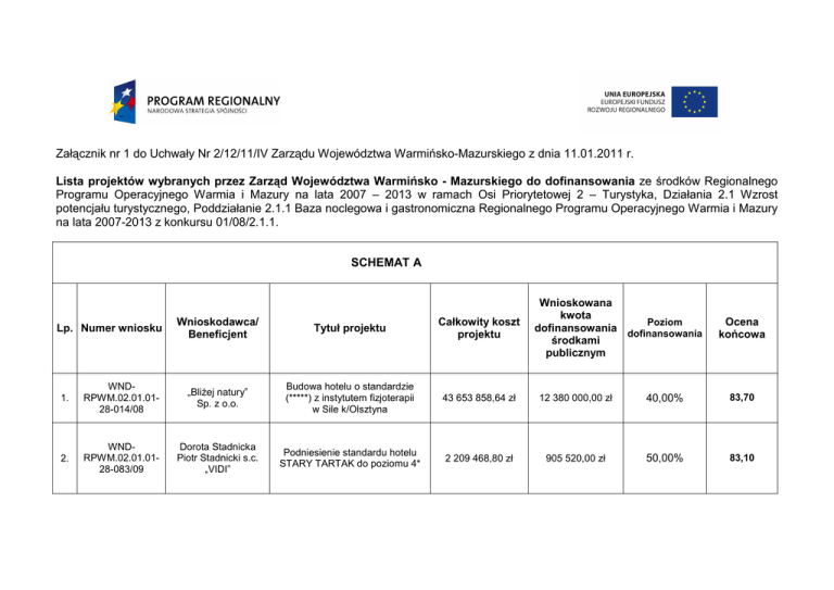 Załącznik nr 1 do Uchwały Nr 2/12/11/IV Zarządu Województwa Warmińsko-Mazurskiego z dnia 11.01.2011 r. Lista projektów wybranych przez Zarząd Województwa Warmińsko - Mazurskiego do dofinansowania ze środków Regionalnego Programu Operacyjnego Warmia i Mazury na lata 2007 – 2013 w ramach Osi Priorytetowej 2 – Turystyka, Działania 2.1 Wzrost potencjału turystycznego, Poddziałanie 2.1.1 Baza noclegowa i gastronomiczna Regionalnego Programu Operacyjnego Warmia i Mazury na lata 2007-2013 z konkursu 01/08/2.1.1. SCHEMAT A Lp. Numer wniosku Wnioskodawca/ Beneficjent Tytuł projektu Całkowity koszt projektu Wnioskowana kwota Poziom dofinansowania dofinansowania środkami publicznym Ocena końcowa 1. WNDRPWM.02.01.0128-014/08 „BliŜej natury” Sp. z o.o. Budowa hotelu o standardzie (*****) z instytutem fizjoterapii w Sile k/Olsztyna 43 653 858,64 zł 12 380 000,00 zł 40,00% 83,70 2. WNDRPWM.02.01.0128-083/09 Dorota Stadnicka Piotr Stadnicki s.c. „VIDI” Podniesienie standardu hotelu STARY TARTAK do poziomu 4* 2 209 468,80 zł 905 520,00 zł 50,00% 83,10 3. WNDRPWM.02.01.0128-001/08 Centrum KonferencyjnoWypoczynkowe „Zamek” Sp. z o.o. Adaptacja Przedzamcza Zamku Biskupów Warmińskich w Lidzbarku Warmińskim na wielofunkcyjny hotel w standardzie (****) 50 906 484,55 zł 14 999 017,39 zł 46,52% 79,70 4. WNDRPWM.02.01.0128-048/09 „Wiwaldi” Junior Sp. z o. o. Wzrost potencjału turystycznego regionu poprzez budowę czterogwiazdkowego hotelu WIWALDI JUNIOR w Elblągu 36 237 384,52 zł 14 851 387,10 zł 50,00% 78,20 5. WNDRPWM.02.01.0128-030/08 PROREST Sp. z o.o. Budowa luksusowej bazy noclegowej firmy Prorest Sp. z o.o. 7 582 511,06 zł 2 499 742,58 zł 40,22% 76,50 6. WNDRPWM.02.01.0128-026/08 Zamek GiŜycki Sp. z o.o. Utworzenie LOTZ HOTEL **** na bazie zamku krzyŜackiego w GiŜycku 28 057 018,47 zł 10 268 575,70 zł 49,54% 74,25 7. WNDRPWM.02.01.0128-027/08 MIK Małgorzata Grabowska Grand Hotel TIFFI 5* 50 037 263,00 zł 14 949 411,65 zł 36,59% 72,80 31 944 480,00 zł 10 642 000,00 zł 50,00% 72,40 8. WNDRPWM.02.01.0128-007/08 Dalbrinik Sp. z o.o. Wzrost atrakcyjności Rezydencji Warmińskiej w Worytach poprzez budowę czterogwiazdkowego hotelu oraz domków całorocznych o podwyŜszonym standardzie 9. WNDRPWM.02.01.0128-082/09 Ireneusz Słowik OPB HOLDING Budowa wysokiej klasy centrum pobytowego dla druŜyn Mistrzostw EURO 2012 w Ostródzie szansą na rozwój całorocznej turystyki w regionie 67 100 000,00 zł 7 840 709,97 zł 14,52% 71,10 SCHEMAT B Wnioskowana kwota Poziom dofinansowania dofinansowania środkami publicznym Lp. Numer wniosku Wnioskodawca/ Beneficjent Tytuł projektu Całkowity koszt projektu 1. WNDRPWM.02.01.0128-033/08 Agata Dunajska Pizzeria „Toscana” Restauracja „Mazuriana” – mazurska tradycja i nowoczesność 2 875 206,02 zł 834 645,61 zł 35,37% 95,5 2. WNDRPWM.02.01.0128-077/09 Jarosław Jędrzejowski Budowa pensjonatu „Rybaczówka” Mazur Wind w Bogaczewie 893 174,96 zł 417 328,32 zł 50,00% 94,8 3. WNDRPWM.02.01.0128-084/09 YU-POL Spółka z o.o. 10 684 590,42 zł 2 499 493,53 zł 31,68% 93,4 Rozbudowa restauracji w Olsztynie Ocena końcowa Poprawa bazy noclegowej i gastronomicznej w Działdowie poprzez wykorzystanie zabytkowych pozostałości zamku gotyckiego i plebani na potrzeby kompleksu hoteloworestauracyjnego PRZEDZAMCZE 6 434 466,66 zł 2 499 990,29 zł 49,87% 93,1 4. WNDRPWM.02.01.0128-020/08 5. WNDPPHU Handel hurtowy RPWM.02.01.01i detaliczny Jan Pęcak 28-069/09 Budowa ośrodka wczasowo rehabilitacyjno-rekreacyjnego – etap I – Karczma „MARGRABOWA” i kompleks domków campingowych 1 817 218,22 zł 744 761,56 zł 50,00% 92,2 6. WNDRPWM.02.01.0128-016/08 Przedsiębiorstwo Handlowo -Usługowe Kolbi s.c. GraŜyna i Ireneusz Szumowscy Rozbudowa i modernizacja bazy noclegowo-gastronomicznej Hotelu Roś w Piszu 3 123 112,93 zł 716 780,02 zł 28,00% 90,2 7. WNDRPWM.02.01.0128-042/09 Pensjonacik „Cyklada” s.c. Nina Tomczak, Izabela Jaworska, Jacek Jaworski „Mazurska Chata” jako element realizacji Strategii Rozwoju Turystyki w zakresie rozbudowy bazy noclegowo-gastronomicznej w Mikołajkach 3 324 583,32 zł 1 355 165,11 zł 50,00% 88,4 Leszek Browarek Firma Handlowa „eL-Be" 8. WNDRPWM.02.01.0128-031/08 Przedsiębiorstwo GastronomicznoUsługowe Katarzyna Kuśtowska Budowa nowoczesnego budynku restauracyjnego „Matrioszka” w Gołdapi przy ulicy Partyzantów nr geodezyjny działki 970/7 i 970/38 Budowa nad jeziorem Ukiel w Olsztynie restauracji śródziemnomorskiej, nawiązującej architektonicznie do przedwojennej plaŜy miejskiej, z funkcjami noclegowymi, konferencyjnymi i sportoworekreacyjnymi Rozwój bazy noclegowej i gastronomicznej powiatu działdowskiego - I etap budowy centrum hotelowokonferencyjnego w Ciborzu działającego w ramach sieci SRW Chaber 3 749 100,15 zł 1 515 615,18 zł 50,00% 86,9 6 929 600,00 zł 2 499 931,00 zł 49,00% 81,7 6 390 787,01 zł 795 953,76 zł 23,65% 80,5 9. WNDRPWM.02.01.0128-035/08 PHP Jolexim Jerzy Lewandowski 10. WNDRPWM.02.01.0128-044/09 “Aloha” Sp. z o.o. 11. WNDRPWM.02.01.0128-079/09 Ośrodek Wczasowy JaŜdŜówki Gerczak Danuta Mazurskie Centrum Aktywnego Wypoczynku – etap I: Budowa Pensjonatu w JaŜdŜówkach 6 099 951,20 zł 2 499 980,00 zł 50,00% 76,1 12. WNDRPWM.02.01.0128-085/09 Zajazd „REMI” s.c. Regina, Mirosław Wójcik Rozbudowa istniejącego Zajazdu REMI o dodatkowe obiekty noclegowe wraz z basenem i infrastrukturą towarzyszącą 3 193 330,26 zł 1 308 741,91 zł 50,00% 75,8 13. WNDRPWM.02.01.0128-003/08 Jerzy Marcin Banat Reaktywacja stanicy kajakowej w Mikołajkach 6 501 163,49 zł 2 337 797,16 zł 49,82% 74,4 14. WNDRPWM.02.01.0128-080/09 PPH „JAKIN” Napolski Jacek Poprawa atrakcyjności turystycznej miasta Lubawa poprzez uruchomienie Spichlerz Hotel-Restauracja w standardzie trzech gwiazdek 1 464 000,00 zł 579 980,00 zł 50,00% 74 15. WNDRPWM.02.01.0128-025/08 Przedsiębiorstwo Produkcyjno Handlowo - Usługowe „KOCH” Sp. z o.o