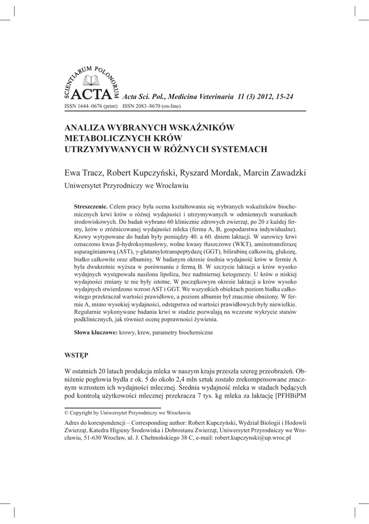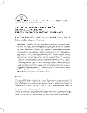 Acta Sci. Pol., Medicina Veterinaria 11 (3) 2012, 15-24 ISSN 1644–0676 (print) ISSN 2083–8670 (on-line) ANALIZA WYBRANYCH WSKAŹNIKÓW METABOLICZNYCH KRÓW UTRZYMYWANYCH W RÓŻNYCH SYSTEMACH1 Ewa Tracz, Robert Kupczyński, Ryszard Mordak, Marcin Zawadzki Uniwersytet Przyrodniczy we Wrocławiu Streszczenie. Celem pracy była ocena kształtowania się wybranych wskaźników biochemicznych krwi krów o różnej wydajności i utrzymywanych w odmiennych warunkach środowiskowych. Do badań wybrano 60 klinicznie zdrowych zwierząt, po 20 z każdej fermy, krów o zróżnicowanej wydajności mleka (ferma A, B, gospodarstwa indywidualne). Krowy wytypowane do badań były pomiędzy 40. a 60. dniem laktacji. W surowicy krwi oznaczono kwas β-hydroksymasłowy, wolne kwasy tłuszczowe (WKT), aminotransferazę asparaginianową (AST), γ-glutamylotranspeptydazę (GGT), bilirubinę całkowitą, glukozę, białko całkowite oraz albuminy. W badanym okresie średnia wydajność krów w fermie A była dwukrotnie wyższa w porównaniu z fermą B. W szczycie laktacji u krów wysoko wydajnych występowała nasilona lipoliza, bez nadmiernej ketogenezy. U krów o niskiej wydajności zmiany te nie były istotne. W początkowym okresie laktacji u krów wysoko wydajnych stwierdzono wzrost AST i GGT. We wszystkich obiektach poziom białka całkowitego przekraczał wartości prawidłowe, a poziom albumin był znacznie obniżony. W fermie A, mimo wysokiej wydajności, odstępstwa od wartości prawidłowych były niewielkie. Regularnie wykonywane badania krwi w stadzie pozwalają na wczesne wykrycie stanów podklinicznych, jak również ocenę poprawności żywienia. Słowa kluczowe: krowy, krew, parametry biochemiczne WSTĘP W ostatnich 20 latach produkcja mleka w naszym kraju przeszła szereg przeobrażeń. Obniżenie pogłowia bydła z ok. 5 do około 2,4 mln sztuk zostało zrekompensowane znacznym wzrostem ich wydajności mlecznej. Średnia wydajność mleka w stadach będących pod kontrolą użytkowości mlecznej przekracza 7 tys. kg mleka za laktację [PFHBiPM © Copyright by Uniwersytet Przyrodniczy we Wrocławiu Adres do korespondencji – Corresponding author: Robert Kupczyński, Wydział Biologii i Hodowli Zwierząt, Katedra Higieny Środowiska i Dobrostanu Zwierząt, Uniwersytet Przyrodniczy we Wrocławiu, 51-630 Wrocław, ul. J. Chełmońskiego 38 C, e-mail: [email protected] 16 E. Tracz i in. 2012]. Bydło mleczne ze względu na sposób i specyfikę użytkowania oraz dużą zmienność podstawowych rodzajów pasz stosowanych w żywieniu tego gatunku narażone jest na występowanie schorzeń metaboliczno-produkcyjnych. W większości stad krów wysoko wydajnych dawki pokarmowe podlegają precyzyjnemu bilansowaniu, lecz nadal istnieje pewna grupa drobnych producentów mleka, którzy żywią zwierzęta w sposób tradycyjny. Zróżnicowanie to pociąga za sobą odmienne problemy natury zdrowotnej zwierząt. W prawidłowym zarządzaniu stadem krów mlecznych duże znaczenie mają systematyczna kontrola i diagnozowanie zaburzeń metabolicznych. U krowy produkującej 40 kg mleka dziennie zapotrzebowanie na energię wzrasta 4,2-krotnie ponad potrzeby bytowe, a krowy o wydajności 60 kg mleka aż 5,8 razy [Martens 2007]. Dochodzi również do dużego obciążenia metabolicznego wątroby [Mulligan i in. 2006]. Nasilona akumulacja triglicerydów w wątrobie może występować nawet u 50% krów w początkowym okresie laktacji. Błędy żywieniowe są przyczyną zaburzeń związanych z niedoborem lub nadmiarem danego pierwiastka, obniżając wydajność mleka i nasilając problemy w rozrodzie [Barszcz i in. 2009]. Każde popełniane błędy w żywieniu krów wpływają na zaburzenia ze strony układów, przede wszystkim pokarmowego, rozrodczego, hormonalnego czy odpornościowego [Mordak 2008]. Dlatego też dawki pokarmowe powinny być układane według rzeczywistej wartości pokarmowej. Rozpoznawanie zaburzeń metabolicznych w stadach krów opiera się na zespole badań diagnostycznych, których ważnym elementem jest oznaczanie wskaźników biochemicznych krwi [Oetzel 2004, Mordak i Nicpoń 2006]. Programy profilaktyczno-diagnostyczne obejmują także analizy laboratoryjne mleka, moczu, treści żwacza, analizę dawek pokarmowych [Studer 1998]. Mają one na celu wyeliminowanie zagrożenia zdrowia zwierząt jeszcze przed pojawieniem się klinicznych objawów chorobowych, zaburzeń rozrodczości i spadku wydajności mlecznej. Przydatnym narzędziem oceny żywienia są szczegółowe badania krwi w celu określenia profilu metabolicznego, w którym wykorzystuje się cały szereg wskaźników, a na ich podstawie można precyzyjnie określić stan zdrowia zwierząt [Quiroz-Rocha i in. 2009]. Celem pracy była ocena kształtowania się wybranych wskaźników biochemicznych krwi krów o różnej wydajności i utrzymywanych w odmiennych warunkach środowiskowych. MATERIAŁ I METODY Badania przeprowadzono jesienią na krowach rasy polskiej holsztyńsko-fryzyjskiej, będących we wczesnym okresie laktacji. Zwierzęta z poszczególnych gospodarstw wytypowano metodą analogów, biorąc pod uwagę wiek (wieloródki) i wydajność mleka w bieżącej laktacji. Uwzględniono następujące gospodarstwa: 1. Ferma krów wysoko wydajnych (ferma A); 2. Ferma należąca do RZD UP we Wrocławiu, krowy o średniej wydajności (ferma B); 3. Gospodarstwa indywidualne w rejonie gminy Rudna (gospodarstwa R). Krowy w fermie A utrzymane były w systemie wolnostanowiskowym, na głębokiej ściółce. Średnia roczna wydajność stada wynosiła 10 500 kg. Krowy wytypowane do Acta Sci. Pol. Analiza wybranych wskaźników... 17 badań były od 40. do 60. dnia laktacji. Zwierzęta żywiono systemem TMR. Dawkę pokarmową otrzymywały dwa razy dziennie. W gospodarstwie należącym do RZD Swojec zwierzęta utrzymywano również systemem wolnostanowiskowym. Krowy wytypowane do badań znajdowały się miedzy 40. a 60. dniem laktacji. Wydajność mlec