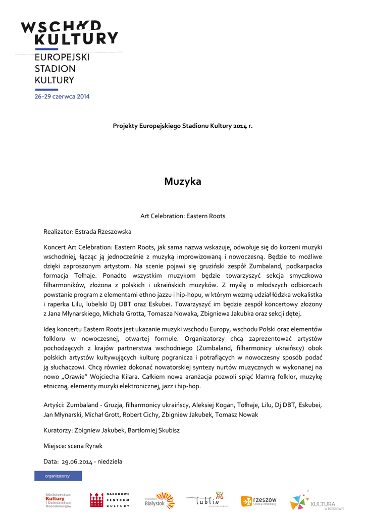 Projekty Europejskiego Stadionu Kultury 2014 r. Muzyka Art Celebration: Eastern Roots Realizator: Estrada Rzeszowska Koncert Art Celebration: Eastern Roots, jak sama nazwa wskazuje, odwołuje się do korzeni muzyki wschodniej, łącząc ją jednocześnie z muzyką improwizowaną i nowoczesną. Będzie to możliwe dzięki zaproszonym artystom. Na scenie pojawi się gruziński zespół Zumbaland, podkarpacka formacja Tołhaje. Ponadto wszystkim muzykom będzie towarzyszyć sekcja smyczkowa filharmoników, złożona z polskich i ukraińskich muzyków. Z myślą o młodszych odbiorcach powstanie program z elementami ethno jazzu i hip-hopu, w którym wezmą udział łódzka wokalistka i raperka Lilu, lubelski Dj DBT oraz Eskubei. Towarzyszyć im będzie zespół koncertowy złożony z Jana Młynarskiego, Michała Grotta, Tomasza Nowaka, Zbigniewa Jakubka oraz sekcji dętej. Ideą koncertu Eastern Roots jest ukazanie muzyki wschodu Europy, wschodu Polski oraz elementów folkloru w nowoczesnej, otwartej formule. Organizatorzy chcą zaprezentować artystów pochodzących z krajów partnerstwa wschodniego (Zumbaland, filharmonicy ukraińscy) obok polskich artystów kultywujących kulturę pogranicza i potrafiących w nowoczesny sposób podać ją słuchaczowi. Chcą również dokonać nowatorskiej syntezy nurtów muzycznych w wykonanej na nowo „Orawie” Wojciecha Kilara. Całkiem nowa aranżacja pozwoli spiąć klamrą folklor, muzykę etniczną, elementy muzyki elektronicznej, jazz i hip-hop. Artyści: Zumbaland - Gruzja, filharmonicy ukraińscy, Aleksiej Kogan, Tołhaje, Lilu, Dj DBT, Eskubei, Jan Młynarski, Michał Grott, Robert Cichy, Zbigniew Jakubek, Tomasz Nowak Kuratorzy: Zbigniew Jakubek, Bartłomiej Skubisz Miejsce: scena Rynek Data: 29.06.2014 - niedziela Klezmer&World Realizator: Estrada Rzeszowska Koncert Klezmer&World w 2013 roku zgromadził pod sceną ogromną publikę i pokazał jak duży temperament posiadają mieszkańcy Rzeszowa. Samą ideą Klezmer&World jest przedstawienie publiczności muzyki klezmerskiej, bałkańskiej oraz tradycyjnej muzyki Bałkanów, krajów południowo-wschodniej Europy i Bliskiego Wschodu. Będzie to swego rodzaju podróż przez muzykę Europy południowo-wschodniej. Muzyka ta jest bardzo mocno związana również z Rzeszowem, w którym do dzisiaj wiele nacji przeplata się i żyje ze sobą. Jest to swego rodzaju powrót do korzeni, a jednocześnie podążanie za tym, co muzycznie dzieje się w Europie. W tym roku oprócz koncertów planowana jest organizacja warsztatów z tańców chasydzkich oraz spotkanie z historykami, którzy przybliżyliby rzeszowianom przedwojenny Rzeszów. Artyści: KlezmaFour, Kozak System, Fanfare Transylvania Kurator: Kamil Siciak Miejsce: scena Rynek Data: 28.06.2014 - sobota Vitold Rek&East West Wind Realizator: Estrada Rzeszowska Innowator kontrabasu, wielostronny artysta z Frankfurtu – Vitold Rek, wydając takie płyty jak „The Polish Folk Explosion”, zawsze łączył muzykę jazzową z folkiem. Już sama nazwa projektu „East West Wind” sugeruje kierunek w jakim idzie artysta tym razem: przegląd różnych kultur i stylów muzycznych, będący przełamaniem granic i połączeniem ze sobą różnych tradycji. Rek, Jaroslaw Bester i Ramesh Shotham przedstawiają utwory o różnych korzeniach, wykorzystując przy tym tematy z różnych krajów europejskich: polski folklor, muzykę klezmerską, pieśni szkockie, hiszpańskie i greckie – wszystko to w świeżych kompozycjach i aranżacjach. Rek, laureat prestiżowej niemieckiej nagrody Hessischer Jazzpreis 2013, jest dziś jedną z najważniejszych postaci w świecie jazzu, z charakterystycznym własnym brzmieniem, które jest doskonałą mieszanką muzycznej wrażliwości i genialnej techniki. Tak samo genialny jest wybór obu partnerów, a są to: Jaroslaw Bester, założyciel znanej na całym świecie grupy Cracow Klezmer Band, i Ramesh Shotham, który opanował wszystkie rejestry perkusji – włącznie z techniką beatboksu – i nadaje utworom porywające rytmiczne tło, bardzo uduchowione, ale zawsze z powiewem egzotyki. W programie wystąpi izraelska śpiewaczka Michal Cohen, która dzięki swoim jemeńskim korzeniom i przejmującej grze sefardyjskiego timbru nadaje muzyce „East West Wind” głęboką treść i niepowtarzalną atmosferę. East West Wind to międzynarodowy projekt, który nawiązuje do bogatej, multikulturowej tradycji regionu południowo-wschodniej Polski. To tu na przestrzeni wieków przenikały się tradycje różnych kultur. East West Wind to koncert, podczas którego widoczne będą wpływy żydowskiej, bałkańskiej, ukraińskiej oraz polskiej muzyki ludowej. Będą to współczesne aranżacje niesamowicie utalentowanych muzyków z Ukrainy, Izraela, Polski i Indii. Artyści: Vitold Rek, Michal Cohen, Taras Bakovskyy, Jarosław Bester, Ramesh Shotham Kurator: Vitold Rek Miejsce: scena Rynek Data: 26.06.2014 - czwartek Pieśni ze Wschodu Realizator: Fundacja Beksiński Pieśni ze Wschodu to projekt, który odczarowuje muzykę poważną. Organizatorzy zaprosili artystów z Ukrainy, którzy zaśpiewają pieśni narodowe wyrastające z kultury tego państwa. Do projektu zostaną włączeni również polscy artyści, którzy wykonają utwory instrumentalne z krajów Partnerstwa Wschodniego. Koncert urozmaicony zostanie multimediami które w tle ukazywać będą krajobrazy charakterystyczne dla państw Partnerstwa Wschodniego. Całość zorganizowana zostanie poza ramami wszelkich instytucji, dzięki czemu muzyka poważna poszerzy grono swoich odbiorców. Artyści: muzycy z Polski i Ukrainy Kuratorzy: Ewa Barycka, Janusz Barycki Miejsce: scena Rynek Data: 29.06.2014 - niedziela Interdyscyplinarne projekty o tematyce Pogranicza Różnorodność religijna i kulturowa krajów Partnerstwa Wschodniego Realizator: Stowarzyszenie Tabor Projekt ma na celu promocje różnorodności kulturowej krajów Partnerstwa Wschodniego, Gruzji, Ukrainy o