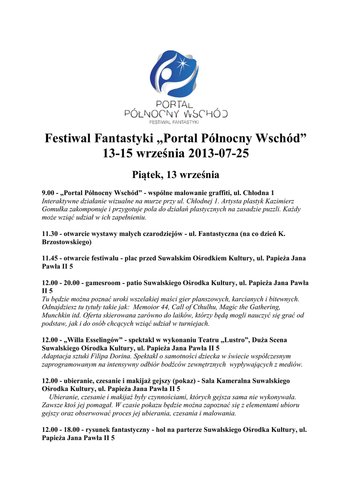 Festiwal Fantastyki „Portal Północny Wschód” 13-15 września 2013-07-25 Piątek, 13 września 9.00 - „Portal Północny Wschód” - wspólne malowanie graffiti, ul. Chłodna 1 Interaktywne działanie wizualne na murze przy ul. Chłodnej 1. Artysta plastyk Kazimierz Gomułka zakomponuje i przygotuje pola do działań plastycznych na zasadzie puzzli. Każdy może wziąć udział w ich zapełnieniu. 11.30 - otwarcie wystawy małych czarodziejów - ul. Fantastyczna (na co dzień K. Brzostowskiego) 11.45 - otwarcie festiwalu - plac przed Suwalskim Ośrodkiem Kultury, ul. Papieża Jana Pawła II 5 12.00 - 20.00 - gamesroom - patio Suwalskiego Ośrodka Kultury, ul. Papieża Jana Pawła II 5 Tu będzie można poznać uroki wszelakiej maści gier planszowych, karcianych i bitewnych. Odnajdziesz tu tytuły takie jak: Memoior 44, Call of Cthulhu, Magic the Gathering, Munchkin itd. Oferta skierowana zarówno do laików, którzy będą mogli nauczyć się grać od podstaw, jak i do osób chcących wziąć udział w turniejach. 12.00 - „Willa Esselingów” - spektakl w wykonaniu Teatru „Lustro”, Duża Scena Suwalskiego Ośrodka Kultury, ul. Papieża Jana Pawła II 5 Adaptacja sztuki Filipa Dorina. Spektakl o samotności dziecka w świecie współczesnym zaprogramowanym na intensywny odbiór bodźców zewnętrznych wypływających z mediów. 12.00 - ubieranie, czesanie i makijaż gejszy (pokaz) - Sala Kameralna Suwalskiego Ośrodka Kultury, ul. Papieża Jana Pawła II 5 Ubieranie, czesanie i makijaż były czynnościami, których gejsza sama nie wykonywała. Zawsze ktoś jej pomagał. W czasie pokazu będzie można zapoznać się z elementami ubioru gejszy oraz obserwować proces jej ubierania, czesania i malowania. 12.00 - 18.00 - rysunek fantastyczny - hol na parterze Suwalskiego Ośrodka Kultury, ul. Papieża Jana Pawła II 5 13.00 - turniej gry Ewolucja - patio Suwalskiego Ośrodka Kultury, ul. Papieża Jana Pawła II 5 13.00 - 17.00 - Antykwariat „Pod Szmaragdowym Smokiem” - Filia nr 3 Biblioteki Publicznej im. M. Konopnickiej, ul. Północna 26 Zapraszamy wszystkich chętnych do zakupu, sprzedaży i wymiany książek gatunku fantasy i science fiction. 14.00 - „Magia umysłu” - działania plastyczne - hol na II piętrze Suwalskiego Ośrodka Kultury, ul. Papieża Jana Pawła II 5 Warsztaty malarskie inspirowane techniką Jacksona Pollocka. Każdy może stworzyć swój osobisty kosmos (wszechświat) na dużych formatach papieru. Malowanie intuicyjne, które nie wynika ze znajomości techniki malarskiej, ale z indywidualnej ekspresji twórczej. Dla wszystkich, którzy uważają, że nie umieją malować, oraz tych, którzy malują i chcą się skonfrontować ze swoim wnętrzem, intuicją, nieświadomością. Tego rodzaju malowanie również niezwykle relaksuje. 14.00 - Wierszem do mnie mów, czyli czym są haiku - Sala Kameralna Suwalskiego Ośrodka Kultury, ul. Papieża Jana Pawła II 5 Haiku to popularne w Kraju Kwitnącej Wiśni wiersze. Powstały one w okresie Edo. W czasie tego wykładu będzie można poznać budowę wierszy, ich treść i historię. 15.00 - Manga i anime - co to jest? - Sala Kameralna Suwalskiego Ośrodka Kultury, ul. Papieża Jana Pawła II 5 Manga... anime... tym interesują się otaku, tak? W czasie tego wykładu zostaną omówione dwa popularne w Japonii i na całym świecie zagadnienia, jak również podane obowiązkowe tytuły, które każdy fan powinien znać. 16.00 - 19.00 - gra miejska „Po wybuchu” na podstawie opowiadania Andrzeja Sapkowskiego „W leju po bombie” - start przy Bibliotece Publicznej im. M. Konopnickiej, ul. E. Plater 33A Zapisy grup (liczących do czterech osób) do udziału w grze przyjmuje Jolanta Gąglewska lub Maria Kołodziejska (tel.87 565 62 46, pon. - pt. w godz. 8.00-15.00, e-mail: [email protected]) do poniedziałku, 9 września, do godz. 12.00. 16.00 - Małe i pluszowe - warsztaty szycia zabawek - Sala Kameralna Suwalskiego Ośrodka Kultury, ul. Papieża Jana Pawła II 5 Jeżeli pragniesz mieć w domu pluszową ulubioną postać z książki, filmu, serialu czy komiksu, a kupienie jej jest niemożliwe - warsztaty zostały stworzone dla Ciebie. Zajęcia przeznaczone są dla osób powyżej 10. roku życia. UWAGA! Ilość miejsc ograniczona. 16.00 - Katakana - wprowadzenie (warsztaty) - hol na I piętrze Suwalskiego Ośrodka Kultury, ul. Papieża Jana Pawła II 5 Katakana to jeden z dwóch japońskich systemów pisma sylabicznego kana. Drugim jest hiragana. W czasie tego warsztatu będzie można poznać podstawy zapisu i potrenować pisanie. 16.30 - turniej gry Qwirkle - patio Suwalskiego Ośrodka Kultury, ul. Papieża Jana Pawła II 5 17.00 - Pojedynek na haiku dla każdego (konkurs) - hol na I piętrze Suwalskiego Ośrodka Kultury, ul. Papieża Jana Pawła II 5 Haiku to japońska krótka forma poetycka, która bywała używana jako zabawa towarzyska. Właśnie taką zabawę proponujemy. Chcemy, aby każdy chętny mógł spróbować swoich sił. 17.00 - projekcja filmu „Astropia” - Duża Scena Suwalskiego Ośrodka Kultury, ul. Papieża Jana Pawła II 5 Hildur jest śliczną, rozpieszczoną blondynką, która spędza czas na kąpielach, zakupach i ploteczkach z koleżankami. Jej chłopak Jolli to magnat branży samochodowej. Razem stanowią rozkoszną parę pięknych i pustych bogaczy. Jednak gdy pewnego dnia Jolli trafi do więzienia za podejrzane sprawki, Hildur będzie musiała stanąć na własnych nogach. W ucieczce przed tłumem paparazzich zatrzyma się u koleżanki Bjort, a kiedy skończy jej się kieszonkowe, zacznie szukać pracy. Nieoczekiwanie trafi do... Astropii, miejsca, w którym nawiedzeni okularnicy kupują książki, komiksy i gry RPG. Czy zagubiona w rzeczywistości Barbie odnajdzie się w świecie fantasy? 17.00 - „Surowe oblicze wczesnego średniowiecza” - pokaz rekonstrukcyjny - plac przed Suwalskim Ośrodkiem Kultury, ul. Papieża Jana Pawła II 5 17.30 - lekcja żywej historii kultu