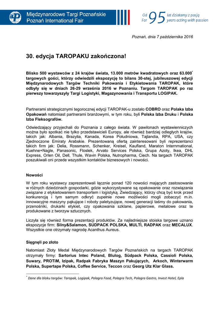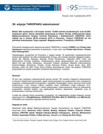 Poznań, dnia 7 października 2016 30. edycja TAROPAKU zakończona! Blisko 500 wystawców z 24 krajów świata, 13.000 metrów kwadratowych oraz 63.000* targowych gości, którzy odwiedzili ekspozycję to bilans 30-stej, jubileuszowej edycji Międzynarodowych Targów Techniki Pakowania i Etykietowania TAROPAK, które odbyły się w dniach 26-29 września 2016 w Poznaniu. Targom TAROPAK po raz pierwszy towarzyszyły Targi Logistyki, Magazynowania i Transportu LOGIPAK. Partnerami strategicznymi tegorocznej edycji TAROPAK-u zostało COBRO oraz Polaka Izba Opakowań natomiast partnerami branżowymi, w tym roku, byli Polska Izba Druku i Polska Izba Fleksografów. Odwiedzający przyjechali do Poznania z całego świata. W pawilonach wystawienniczych można było spotkać nie tylko przedstawicieli Europy, ale również bardziej odległych krajów, takich jak: Albania, Brazylia, Kanada, Korea Południowa, Tajlandia, RPA, USA, czy Zjednoczone Emiraty Arabskie. Prezentowaną ofertą zainteresowani byli reprezentanci takich firm jak: Delia, Rossmann, Schenker, Kreisel, Kaufland, Maraton Internmational, Kuehne+Nagle, Panasonic, Floslek, Arvato Services Polska, Grupa Azoty, Ikea, DHL Express, Orlen Oil, Dell, Thule, Wavin Polska, Nutropharma, Ciech. Na targach TAROPAK poszukiwali oni przede wszystkim kontaktów biznesowych i nowości. Nowości W tym roku wystawcy zaprezentowali łącznie ponad 120 nowości mających zastosowanie w różnych dziedzinach gospodarki, gdzie wykorzystywane są opakowanie oraz rozwiązania związane z etykietowaniem transportem i logistyką. Zwiedzający, którzy chcą być krok przed konkurencją i tym samym odkryć zupełnie nowe możliwości mogli zobaczyć m.in. innowacyjne maszyny pąkujące i roboty paletyzujące, nowej generacji taśmy do pakowania, przenośniki, drukarki etykiet, czy opakowania szklane, papierowe, metalowe oraz te produkowane z tworzyw sztucznych. Liczyła się również forma prezentacji produktów. Za najładniejsze stoiska targowe uznano ekspozycje firm: Silny&Salamon, SUDPACK POLSKA, MULTI, RADPAK oraz MECALUX. Wszystkie one otrzymały nagrodę Acanthus Aureus. Sięgnęli po złoto Natomiast Złoty Medal Międzynarodowych Targów Poznańskich na targach TAROPAK otrzymały firmy: Sartorius Intec Poland, Blulog, Südpack Polska, Cassioli Polska, Suwary, PROTiM, Izipak, Radpak Fabryka Maszyn Pakujących, Arkoch, Winterwarm Polska, Supertape Polska, Coffee Service, Teccon oraz Georg Utz Klar Glass. * Dane dla bloku targów: Taropak, Logipak, Polagra Food, Polagra Tech, Polagra Gastro, Invest Hotel, Epla 2 30. jubileuszowa edycja Tegoroczna edycja targów TAROPAK miała wyjątkowy charakter także ze względu na swoją 30.edycję. Z okazji jubileuszu można było obejrzeć niezwykłą wystawę. Historyczne fotografie obrazujące kilkadziesiąt edycji TAROPAKu korespondowały z artystycznym projektem „Dekonstruktura” autorstwa dr Elżbiety Cios, który został motywem przewodnim jubileuszowej edycji targów. Pokazuje on, że nawet z przetworzonej kartki papieru można stworzyć produkt – kostium będący w stanie pięknie otulić kobiece ciało. Unikatowa tkanina, z której została uszyta kolekcja kostiumów powstała z tysięcy stron modowych żurnali poddanych autorskiej dekonstrukcji druku, a następnie odpowiednio utrwalonych. Proces ten miał nawiązywać do 30. edycji targów Taropak, w czasie których również dekonstruowały się trendy w produkcji opakowań. W trakcie wernisażu wystawy, firmy które od wielu lat uczestniczą w targach TAROPAK otrzymały specjalne podziękowania. Ich przedstawiciele pytani o to, co im daje udział w tych targach byli jednogłośni w swoich opiniach. Waldemar Salamon, Wiceprezes Zarządu Silny&Salamon powiedział, że 20-letni staż i doświadczenie z targami TAROPAK mówią same za siebie, że po prostu warto. Ryszard Racki, Dyrektor Handlu i Marketingu w firmie POLPACK, która od 25 lat prezentuje swoją ofertę na targach TAROPAK, podsumował że korzyści z udziału w TAROPAKu są nie do przecenienia zarówno w wymiarze promocyjno-marketingowym, jak i w zakresie powiększenia skuteczności handlowej. Natomiast Paweł Wygnańczuk, Prezes Zarządu Izipak podkreślał, że udział w Targach TAROPAK to spory prestiż i wzrost rozpoznawalności jego firmy nie tylko w Polsce, ale także na rynkach zagranicznych. III Kongres Przemysłu Opakowań Targom odbywającym się w Poznaniu tradycyjnie towarzyszą wyjątkowe konferencje i seminaria oraz inspirujące strefy pokazowe i wydarzenia, które są dla zwiedzających źródłem energii do rozwijania swojego biznesu. Nie bez znaczenia są również dyskusje dotyczące tematów i zagadnień najbardziej interesujących branżę. Między innymi dlatego w targowym programie znalazł się, współorganizowany z Polska Izbą Opakowań, III Kongres Przemysłu Opakowań. Jego tematem przewodnim były „Opakowania w łańcuchu dostaw”. W kongresie wzięli udział projektanci i producenci opakowań, kadra kierownicza centrów logistycznych i magazynów, przedstawicieli sieci handlowych oraz ci wszyscy, którzy w swojej pracy spotykają się z opakowanymi produktami. Podczas kongresu dyskutowali oni o różnych aspektach funkcjonowania łańcucha dostaw, nowych technologiach oraz bezpieczeństwie opakowań i produktów. Wacław Wasiak, Dyrektor Biura Polskiej Izby Opakowań otwierając Kongres podziękował targom poznańskim za zaangażowanie na rzecz branży. Powiedział też, że „trudno przecenić rolę i znaczenie targów TAROPAK w obszarze promocji polskiego przemysłu opakowań i całego rynku opakowań w Polsce”. Fabryka Pakowania na Żywo Ciekawym punktem targowego programu była także Fabryka Pakowania na Żywo, w ramach której pokazano automatyczne linie do pakowania w folie świeżych produktów spożywczych oraz wyrobów piekarskich i cukierniczych. Wyjątkowość fabryki polegała na pokazaniu efektów pakowania, jakie daje stosowanie wielowarst