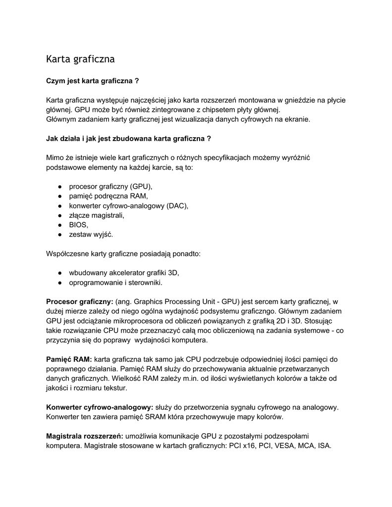 Karta graficzna Czym jest karta graficzna ? Karta graficzna występuje najczęściej jako karta rozszerzeń montowana w gnieździe na płycie głównej. GPU może być również zintegrowane z chipsetem płyty głównej. Głównym zadaniem karty graficznej jest wizualizacja danych cyfrowych na ekranie. Jak działa i jak jest zbudowana karta graficzna ? Mimo że istnieje wiele kart graficznych o różnych specyfikacjach możemy wyróżnić podstawowe elementy na każdej karcie, są to: ● procesor graficzny (GPU), ● pamięć podręczna RAM, ● konwerter cyfrowoanalogowy (DAC), ● złącze magistrali, ● BIOS, ● zestaw wyjść. Współczesne karty graficzne posiadają ponadto: ● wbudowany akcelerator grafiki 3D, ● oprogramowanie i sterowniki. Procesor graficzny: (ang. Graphics Processing Unit GPU) jest sercem karty graficznej, w dużej mierze zależy od niego ogólna wydajność podsystemu graficzngo. Głównym zadaniem GPU jest odciążanie mikroprocesora od obliczeń powiązanych z grafiką 2D i 3D. Stosując takie rozwiązanie CPU może przeznaczyć całą moc obliczeniową na zadania systemowe co przyczynia się do poprawy wydajności komputera. Pamięć RAM: karta graficzna tak samo jak CPU podrzebuje odpowiedniej ilości pamięci do poprawnego działania. Pamięć RAM służy do przechowywania aktualnie przetwarzanych danych graficznych. Wielkość RAM zależy m.in. od ilości wyświetlanych kolorów a także od jakości i rozmiaru tekstur. Konwerter cyfrowoanalogowy: służy do przetworzenia sygnału cyfrowego na analogowy. Konwerter ten zawiera pamięć SRAM która przechowywuje mapy kolorów. Magistrala rozszerzeń: umożliwia komunikacje GPU z pozostałymi podzespołami komputera. Magistrale stosowane w kartach graficznych: PCI x16, PCI, VESA, MCA, ISA. BIOS karty graficznej: umożliwia działanie karty graficznej, zanim zostanie wczytany system operacyjny oraz pozwala na wykonywanie instrukcji kart przez oprogramowanie systemowe. Wyjścia Zestaw wyjść karty graficznej umożliwiający podłączenie jej pod monitor, telewizor, rzutnik multimedialny. Najczęściej spotykanymi wyjściami są: ● HDMI, ● DSUB, ● Display Port, ● TVOut (SVideo), ● DVI.