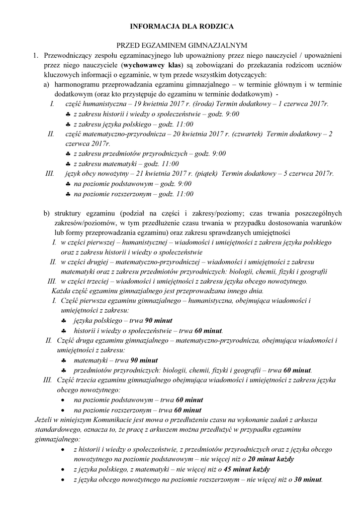 INFORMACJA DLA RODZICA PRZED EGZAMINEM GIMNAZJALNYM 1. Przewodniczący zespołu egzaminacyjnego lub upoważniony przez niego nauczyciel / upoważnieni przez niego nauczyciele (wychowawcy klas) są zobowiązani do przekazania rodzicom uczniów kluczowych informacji o egzaminie, w tym przede wszystkim dotyczących: a) harmonogramu przeprowadzania egzaminu gimnazjalnego – w terminie głównym i w terminie dodatkowym (oraz kto przystępuje do egzaminu w terminie dodatkowym) I. część humanistyczna – 19 kwietnia 2017 r. (środa) Termin dodatkowy – 1 czerwca 2017r. ♣ z zakresu historii i wiedzy o społeczeństwie – godz. 9:00 ♣ z zakresu języka polskiego – godz. 11:00 II. część matematyczno-przyrodnicza – 20 kwietnia 2017 r. (czwartek) Termin dodatkowy – 2 czerwca 2017r. ♣ z zakresu przedmiotów przyrodniczych – godz. 9:00 ♣ z zakresu matematyki – godz. 11:00 III. język obcy nowożytny – 21 kwietnia 2017 r. (piątek) Termin dodatkowy – 5 czerwca 2017r. ♣ na poziomie podstawowym – godz. 9:00 ♣ na poziomie rozszerzonym – godz. 11:00 b) struktury egzaminu (podział na części i zakresy/poziomy; czas trwania poszczególnych zakresów/poziomów, w tym przedłużenie czasu trwania w przypadku dostosowania warunków lub formy przeprowadzania egzaminu) oraz zakresu sprawdzanych umiejętności I. w części pierwszej – humanistycznej – wiadomości i umiejętności z zakresu języka polskiego oraz z zakresu historii i wiedzy o społeczeństwie II. w części drugiej – matematyczno-przyrodniczej – wiadomości i umiejętności z zakresu matematyki oraz z zakresu przedmiotów przyrodniczych: biologii, chemii, fizyki i geografii III. w części trzeciej – wiadomości i umiejętności z zakresu języka obcego nowożytnego. Każda część egzaminu gimnazjalnego jest przeprowadzana innego dnia. I. Część pierwsza egzaminu gimnazjalnego – humanistyczna, obejmująca wiadomości i umiejętności z zakresu: ♣ języka polskiego – trwa 90 minut ♣ historii i wiedzy o społeczeństwie – trwa 60 minut. II. Część druga egzaminu gimnazjalnego – matematyczno-przyrodnicza, obejmująca wiadomości i umiejętności z zakresu: ♣ matematyki – trwa 90 minut ♣ przedmiotów przyrodniczych: biologii, chemii, fizyki i geografii – trwa 60 minut. III. Część trzecia egzaminu gimnazjalnego obejmująca wiadomości i umiejętności z zakresu języka obcego nowożytnego: • na poziomie podstawowym – trwa 60 minut • na poziomie rozszerzonym – trwa 60 minut Jeżeli w niniejszym Komunikacie jest mowa o przedłużeniu czasu na wykonanie zadań z arkusza standardowego, oznacza to, że pracę z arkuszem można przedłużyć w przypadku egzaminu gimnazjalnego: • z historii i wiedzy o społeczeństwie, z przedmiotów przyrodniczych oraz z języka obcego nowożytnego na poziomie podstawowym – nie więcej niż o 20 minut każdy • z języka polskiego, z matematyki – nie więcej niż o 45 minut każdy • z języka obcego nowożytnego na poziomie rozszerzonym – nie więcej niż o 30 minut. Czas pracy z arkuszem dostosowanym do rodzaju niepełnosprawności wydrukowany na stronie tytułowej arkusza uwzględnia przedłużenie, o którym mowa powyżej (por. Tabela 2.) 2. 3. 4. 5. c) zasad przeprowadzania egzaminu gimnazjalnego (przebieg egzaminu każdego dnia) d) sposobu zaznaczania odpowiedzi na karcie odpowiedzi oraz dodatkowego czasu (5 minut) przeznaczonego na sprawdzenie poprawności przeniesienia odpowiedzi na kartę odpowiedzi e) zakazu wnoszenia do sali egzaminacyjnej urządzeń telekomunikacyjnych lub korzystania z takich urządzeń w tej sali f) przyborów i materiałów, które zdający mogą wnieść do sali egzaminacyjnej - szczegóły w informacji dla ucznia g) konieczności samodzielnego rozwiązywania zadań w czasie egzaminu h) możliwości wglądu do sprawdzonej i ocenionej pracy egzaminacyjnej. Do 30 września 2016 r. należy zapoznać rodziców uczniów z możliwymi dostosowaniami warunków i form przeprowadzania egzaminu gimnazjalnego (pkt 3.4.13.). Do 18 listopada 2016 r. należy przekazać rodzicom uczniów pisemną informację o wskazanym przez radę pedagogiczną sposobie lub sposobach dostosowania warunków lub formy przeprowadzania egzaminu gimnazjalnego do potrzeb edukacyjnych i możliwości psychofizycznych zdających. Należy poinformować rodziców o następujących terminach: a) do 30 września 2016 r. – złożenie deklaracji (a) wskazującej język obcy nowożytny, z którego uczeń przystąpi do części trzeciej egzaminu gimnazjalnego, (b) informującej o zamiarze przystąpienia do części trzeciej egzaminu na poziomie rozszerzonym przez ucznia, który nie ma takiego obowiązku, (c) informującej o zamiarze przystąpienia do części pierwszej lub części drugiej egzaminu w języku danej mniejszości narodowej, mniejszości etnicznej lub w języku regionalnym b) do 15 października 2016 r. – przedłożenie dyrektorowi szkoły zaświadczenia o stanie zdrowia ucznia lub opinii poradni psychologiczno-pedagogicznej o specyficznych trudnościach w uczeniu się c) do 24 listopada 2016 r. – złożenie oświadczenia o korzystaniu albo niekorzystaniu ze wskazanych sposobów dostosowania warunków lub formy przeprowadzania egzaminu do potrzeb edukacyjnych i możliwości psychofizycznych zdających, po otrzymaniu pisemnej informacji, o której mowa w pkt 11.1.3. d) do 19 stycznia 2017 r. – złożenie pisemnej informacji o zmianie w deklaracjach: • deklaracji (a) wskazującej język obcy nowożytny, z którego uczeń przystąpi do części trzeciej egzaminu gimnazjalnego, (b) informującej o zamiarze przystąpienia do części trzeciej egzaminu na poziomie rozszerzonym przez ucznia, który nie ma takiego obowiązku, (c) informującej o zamiarze przystąpienia do części pierwszej lub części drugiej egzaminu w języku danej mniejszości narodowej, mniejszości etnicznej lub w języku regionalnym • rezygnacji z przys