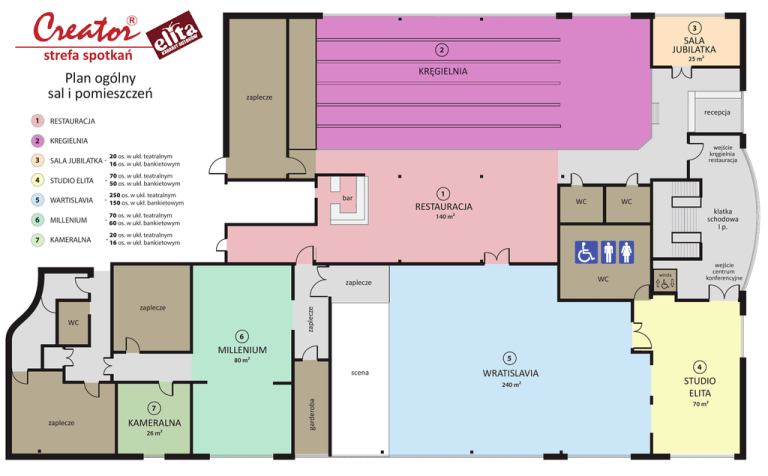 3 SALA JUBILATKA 2 25 m2 KRĘGIELNIA Plan ogólny sal i pomieszczeń zaplecze recepcja 1 RESTAURACJA 2 KREGIELNIA 3 SALA JUBILATKA - 16 os. w ukł. bankietowym 4 STUDIO ELITA - 50 os. w ukł. bankietowym 5 WARTISLAVIA - 150 os. w ukł. bankietowym 6 MILLENIUM 70 os. w ukł. teatralnym - 60 os. w ukł. bankietowym 7 KAMERALNA - 16 os. w ukł. bankietowym wejście kręgielnia restauracja 20 os. w ukł. teatralnym 70 os. w ukł. teatralnym 250 os. w ukł. teatralnym bar 1 WC RESTAURACJA klatka schodowa I p. 140 m2 20 os. w ukł. teatralnym WC zaplecze WC 6 MILLENIUM 5 80 m2 scena WRATISLAVIA KAMERALNA 26 m2 garderoba 240 m2 7 wejście centrum konferencyjne winda zaplecze zaplecze zaplecze WC 4 STUDIO ELITA 70 m2
