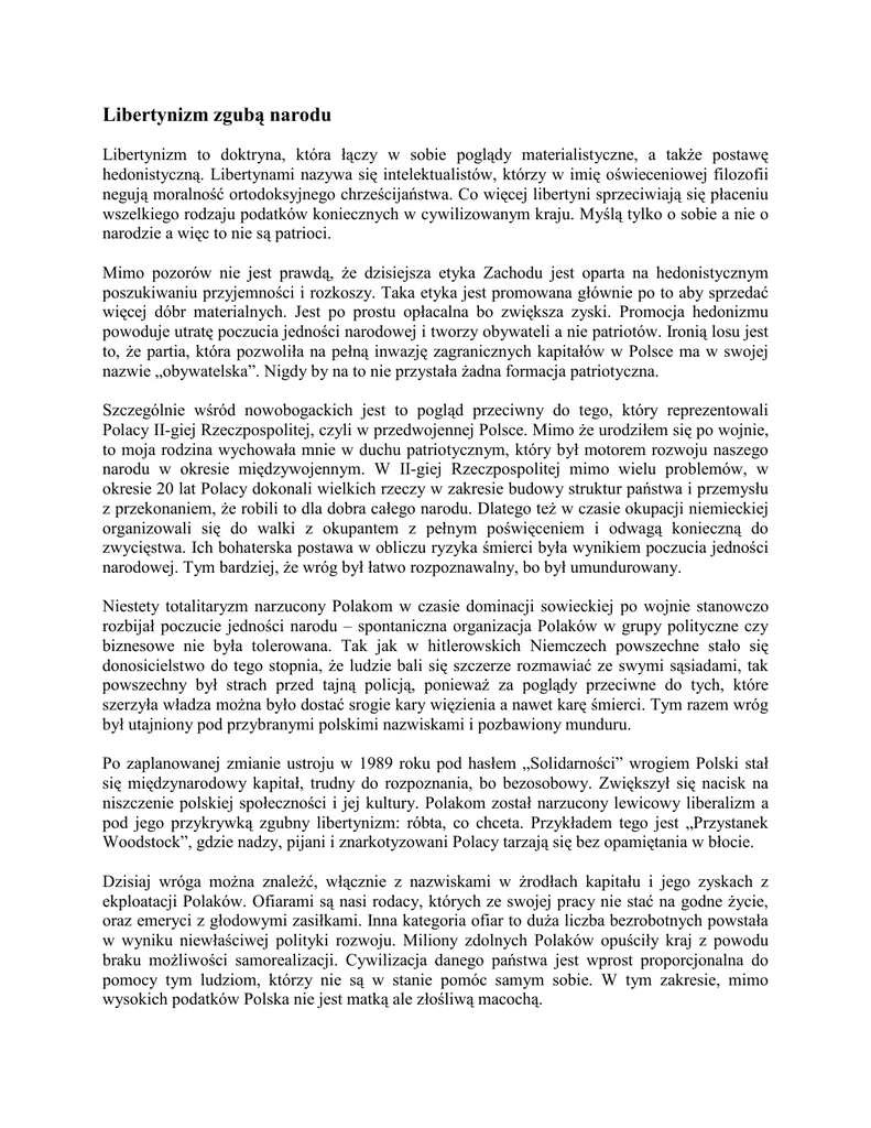 Libertynizm zgubą narodu Libertynizm to doktryna, która łączy w sobie poglądy materialistyczne, a także postawę hedonistyczną. Libertynami nazywa się intelektualistów, którzy w imię oświeceniowej filozofii negują moralność ortodoksyjnego chrześcijaństwa. Co więcej libertyni sprzeciwiają się płaceniu wszelkiego rodzaju podatków koniecznych w cywilizowanym kraju. Myślą tylko o sobie a nie o narodzie a więc to nie są patrioci. Mimo pozorów nie jest prawdą, że dzisiejsza etyka Zachodu jest oparta na hedonistycznym poszukiwaniu przyjemności i rozkoszy. Taka etyka jest promowana głównie po to aby sprzedać więcej dóbr materialnych. Jest po prostu opłacalna bo zwiększa zyski. Promocja hedonizmu powoduje utratę poczucia jedności narodowej i tworzy obywateli a nie patriotów. Ironią losu jest to, że partia, która pozwoliła na pełną inwazję zagranicznych kapitałów w Polsce ma w swojej nazwie „obywatelska”. Nigdy by na to nie przystała żadna formacja patriotyczna. Szczególnie wśród nowobogackich jest to pogląd przeciwny do tego, który reprezentowali Polacy II-giej Rzeczpospolitej, czyli w przedwojennej Polsce. Mimo że urodziłem się po wojnie, to moja rodzina wychowała mnie w duchu patriotycznym, który był motorem rozwoju naszego narodu w okresie międzywojennym. W II-giej Rzeczpospolitej mimo wielu problemów, w okresie 20 lat Polacy dokonali wielkich rzeczy w zakresie budowy struktur państwa i przemysłu z przekonaniem, że robili to dla dobra całego narodu. Dlatego też w czasie okupacji niemieckiej organizowali się do walki z okupantem z pełnym poświęceniem i odwagą konieczną do zwycięstwa. Ich bohaterska postawa w obliczu ryzyka śmierci była wynikiem poczucia jedności narodowej. Tym bardziej, że wróg był łatwo rozpoznawalny, bo był umundurowany. Niestety totalitaryzm narzucony Polakom w czasie dominacji sowieckiej po wojnie stanowczo rozbijał poczucie jedności narodu – spontaniczna organizacja Polaków w grupy polityczne czy biznesowe nie była tolerowana. Tak jak w hitlerowskich Niemczech powszechne stało się donosicielstwo do tego stopnia, że ludzie bali się szczerze rozmawiać ze swymi sąsiadami, tak powszechny był strach przed tajną policją, ponieważ za poglądy przeciwne do tych, które szerzyła władza można było dostać srogie kary więzienia a nawet karę śmierci. Tym razem wróg był utajniony pod przybranymi polskimi nazwiskami i pozbawiony munduru. Po zaplanowanej zmianie ustroju w 1989 roku pod hasłem „Solidarności” wrogiem Polski stał się międzynarodowy kapitał, trudny do rozpoznania, bo bezosobowy. Zwiększył się nacisk na niszczenie polskiej społeczności i jej kultury. Polakom został narzucony lewicowy liberalizm a pod jego przykrywką zgubny libertynizm: róbta, co chceta. Przykładem tego jest „Przystanek Woodstock”, gdzie nadzy, pijani i znarkotyzowani Polacy tarzają się bez opamiętania w błocie. Dzisiaj wróga można znależć, włącznie z nazwiskami w żrodłach kapitału i jego zyskach z ekploatacji Polaków. Ofiarami są nasi rodacy, których ze swojej pracy nie stać na godne życie, oraz emeryci z głodowymi zasiłkami. Inna kategoria ofiar to duża liczba bezrobotnych powstała w wyniku niewłaściwej polityki rozwoju. Miliony zdolnych Polaków opuściły kraj z powodu braku możliwości samorealizacji. Cywilizacja danego państwa jest wprost proporcjonalna do pomocy tym ludziom, którzy nie są w stanie pomóc samym sobie. W tym zakresie, mimo wysokich podatków Polska nie jest matką ale złośliwą macochą. Prędzej czy póżniej Polacy, którzy obecnie mają libertyńskie odchylenie, zrozumieją że jedyną drogą dla naszego kraju jest konserwatywny patriotyzm. Będzie to jednak długa i bolesna droga ze względu na wrogie nam media, w których prym wiedzie „Gazeta Wyborcza”. Zadaniem tych „międzynarodowych trockistów” jest całkowite wynarodowienie Polaków aby nie dopuścić do zjednoczenia w celu samoobrony. Ogłupieni propagandą liberalizmu (czytaj libertynizmu) obywatele są bezbronni w obliczu żądnych zysku bezosobowych kapitałow. Gołym okiem widać, że media na każdym kroku ośmieszają i degradują podstawowe wartości Polaków, takie jak religia katolicka, patriotyzm czy takie symbole jak „matka Polka”. Co więcej, każdemu, kto się sprzeciwi polityce liberalizmu grozi nie tylko ośmieszenie ale nawet śmierć cywilna. Poprawność polityczna wymuszana przez władze i służebne im media jest formą dyktatury zniewolenia i niszczenia patriotów. Panuje konformizm i strach w przeciwieństwie do brawury i odwagi. Wartością nadrzędną, która dobrze służy grupom kapitałowym eksploatującym Polskę, stała się pogoń za pieniądzem z całkowitym pominięciem wartości, budujących cywilizowany kraj. Wynikiem tego jest dziki kapitalizm niespotykany dzisiaj na Zachodzie. Dzisiejszy „obywatel” pod względem wartości dla ojczyzny jest moralnym karłem w porównaniu do bohaterów Powstania Warszawskiego czy też Żołnierzy Wyklętych, którzy byli gotowi oddać swoje życie w walce o dobro narodu. Tylko nieliczni Polacy zdają sobie sprawę z zagrożenia liczebności naszej społeczności, na co składa się ilość zgonów i dzieci nienarodzonych oraz exodus emigracji. W normalnych warunkach mielibyśmy dziś w kraju około 60 milionów Polaków. A jest tylko 38 milionów. Czyli mamy róznicę trzy i pół raza większą w stosunku do 6 milionów Polaków straconych w czasie II Wojny Swiatowej. To jest prawdziwy holokaust w akcji, który jest w mediach przemilczany. Nowoczesne metody eksterminacji Polaków są bardziej skuteczne niż te, ktorych używali nasi okupanci w czasie wojny. Około 30 lat temu, w czasie wizyty u moich dostawców w Los Angeles, CA poznałem Japonkę, która mi powiedziała coś, co zapamiętałem na całe życie: momenty szczęścia w naszym życiu są nieliczne i musimy być czujni 