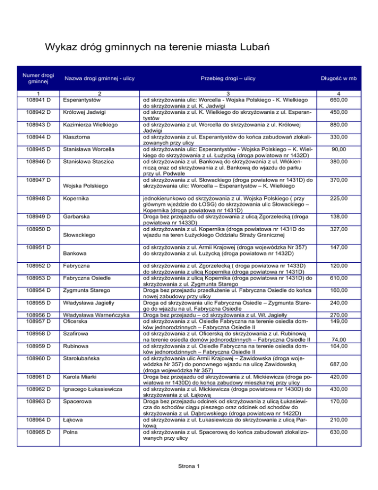 Wykaz dróg gminnych na terenie miasta Lubań Numer drogi gminnej Nazwa drogi gminnej - ulicy Przebieg drogi – ulicy Długość w mb 3 od skrzyżowania ulic: Worcella - Wojska Polskiego - K. Wielkiego do skrzyżowania z ul. K. Jadwigi od skrzyżowania z ul. K. Wielkiego do skrzyżowania z ul. Esperan tystów od skrzyżowania z ul. Worcella do skrzyżowania z ul. Królowej Jadwigi od skrzyżowania z ul. Esperantystów do końca zabudowań zlokali zowanych przy ulicy od skrzyżowania ulic: Esperantystów - Wojska Polskiego – K. Wiel kiego do skrzyżowania z ul. Łużycką (droga powiatowa nr 1432D) od skrzyżowania z ul. Bankową do skrzyżowania z ul. Włókien niczą oraz od skrzyżowania z ul. Bankową do wjazdu do parku przy ul. Podwale od skrzyżowania z ul. Słowackiego (droga powiatowa nr 1431D) do skrzyżowania ulic: Worcella – Esperantystów – K. Wielkiego 4 660,00 225,00 Słowackiego jednokierunkowo od skrzyżowania z ul. Wojska Polskiego ( przy głównym wjeździe do ŁOSG) do skrzyżowania ulic Słowackiego – Kopernika (droga powiatowa nr 1431D) Droga bez przejazdu od skrzyżowania z ulicą Zgorzelecką (droga powiatowa nr 1433D) od skrzyżowania z ul. Kopernika (droga powiatowa nr 1431D do wjazdu na teren Łużyckiego Oddziału Straży Granicznej od skrzyżowania z ul. Armii Krajowej (droga wojewódzka Nr 357) do skrzyżowania z ul. Łużycką (droga powiatowa nr 1432D) 147,00 Bankowa od skrzyżowania z ul. Zgorzelecką ( droga powiatowa nr 1433D) do skrzyżowania z ulicą Kopernika (droga powiatowa nr 1431D) od skrzyżowania z ulicą Kopernika (droga powiatowa nr 1431D) do skrzyżowania z ul. Zygmunta Starego Droga bez przejazdu przedłużenie ul. Fabryczna Osiedle do końca nowej zabudowy przy ulicy Droga od skrzyżowania ulic Fabryczna Osiedle – Zygmunta Stare go do wjazdu na ul. Fabryczna Osiedle Droga bez przejazdu – od skrzyżowania z ul. Wł. Jagiełły od skrzyżowania z ul. Osiedle Fabryczna na terenie osiedla dom ków jednorodzinnych – Fabryczna Osiedle II od skrzyżowania z ul. Oficerską do skrzyżowania z ul. Rubinową na terenie osiedla domów jednorodzinnych – Fabryczna Osiedle II od skrzyżowania z ul. Osiedle Fabryczna na terenie osiedla dom ków jednorodzinnych – Fabryczna Osiedle II od skrzyżowania ulic Armii Krajowej – Zawidowska (droga woje wódzka Nr 357) do ponownego wjazdu na ulicę Zawidowską (droga wojewódzka Nr 357) Droga bez przejazdu od skrzyżowania z ul. Mickiewicza (droga po wiatowa nr 1430D) do końca zabudowy mieszkalnej przy ulicy od skrzyżowania z ul. Mickiewicza (droga powiatowa nr 1430D) do skrzyżowania z ul. Łąkową Droga bez przejazdu odcinek od skrzyżowania z ulicą Łukasiewi cza do schodów ciągu pieszego oraz odcinek od schodów do skrzyżowania z ul. Dąbrowskiego (droga powiatowa nr 1422D) od skrzyżowania z ul. Łukasiewicza do skrzyżowania z ulicą Par kową od skrzyżowania z ul. Spacerową do końca zabudowań zlokalizo wanych przy ulicy 120,00 1 108941 D 2 Esperantystów 108942 D Królowej Jadwigi 108943 D Kazimierza Wielkiego 108944 D Klasztorna 108945 D Stanisława Worcella 108946 D Stanisława Staszica 108947 D Wojska Polskiego 108948 D Kopernika 108949 D Garbarska 108950 D 108951 D 108952 D Fabryczna 108953 D Fabryczna Osiedle 108954 D Zygmunta Starego 108955 D Władysława Jagiełły 108956 D 108957 D Władysława Warneńczyka Oficerska 108958 D Szafirowa 108959 D Rubinowa 108960 D Starolubańska 108961 D Karola Miarki 108962 D Ignacego Łukasiewicza 108963 D Spacerowa 108964 D Łąkowa 108965 D Polna Strona 1 450,00 880,00 330,00 90,00 380,00 370,00 138,00 327,00 610,00 160,00 240,00 270,00 149,00 74,00 164,00 687,00 420,00 430,00 170,00 210,00 630,00 108966 D Parkowa od skrzyżowania z ul. Dąbrowskiego (droga powiatowa nr 1422D) do skrzyżowania z ul. Gajową 710,00 108967 D Gajowa 520,00 108968 D 108969 D M.C. Skłodowskiej Włościańska 108970 D Aleja Kombatantów 108971 D Władysława Sikorskiego 108972 D Słoneczna 108973 D Gazowa 108974 D Strzelecka 108975 D 108976 D Górna Zamkowa 108977 D Chopina 108978 D 108979 D. Ogrodowa Energetyczna 108980 D Bolesława Prusa 108981 D Skalnicza 108982 D Stawowa 108983 D 108984 D Lipowa Aleja Niepodległości 108985 D Fortowa 108986 D Groblowa 108987 D Krótka 108988 D Żołnierska 108989 D Rzeczna 108990 D Izerska 108991 D Dworcowa 108992 D Torowa 108993 D Macieja Rataja 108994 D Plac Śląski 108995 D Bracka 108996 D Spółdzielcza od skrzyżowania z ul. M.C. Skłodowskiej do skrzyżowania z ul. Parkową od skrzyżowania z ul. Polną do skrzyżowania z ul. Parkową od skrzyżowania z ul. Łąkową do skrzyżowania z ul. Spacerową od skrzyżowania z ul. Mickiewicza (droga powiatowa nr 1430D) do skrzyżowania ulic Dąbrowskiego – Sybiraków (droga powiatowa nr 1422D) od skrzyżowania z ul. Dąbrowskiego (droga powiatowa nr 1422D) do skrzyżowania z ul. Mickiewicza (droga powiatowa nr 1430D) od skrzyżowania z ul. Dąbrowskiego (droga powiatowa nr 1422D) do wjazdu obok restauracji „Słoneczna” na ulicę 7 Dywizji (droga wojewódzka Nr 393) Droga bez przejazdu od skrzyżowania z drogą wojewódzką nr 393 – ul. T. Kościuszki od skrzyżowania z ul. T. Kościuszki (droga wojewódzka nr 393) do skrzyżowania z ul. Górną od skrzyżowania z ul. Strzelecką do skrzyżowania z ul. Chopina od skrzyżowania z ul. T. Kościuszki (droga wojewódzka nr 393) do skrzyżowania z ul. Górną od skrzyżowania z ul. T. Kościuszki (droga wojewódzka nr 393) do końca zabudowań przy ulicy od skrzyżowania z ul. Energetyczną do skrzyżowania z ul. Chopina od skrzyżowania z ul. T. Kościuszki (droga wojewódzka nr 393) do końca zabudowań przy ulicy od skrzyżowania z ul. Leśną do ponownego wjazdu na ul. Leśną (droga wojewódzka Nr 393) od skrzyżowania z ul. Leśną 9droga wojewódzka nr 393) do wjaz du na ul. Stawową od skrzyżowania z ul. Leśną do końca zabudowy w kierunku ogrodów działkowych i odcinek prowadzący do ponownego wjazdu na u