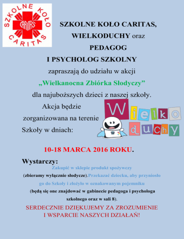 SZKOLNE KOŁO CARITAS, WIELKODUCHY oraz PEDAGOG I PSYCHOLOG SZKOLNY zapraszają do udziału w akcji „Wielkanocna Zbiórka Słodyczy” dla najuboższych dzieci z naszej szkoły. Akcja będzie zorganizowana na terenie Szkoły w dniach: 10-18 MARCA 2016 ROKU. Wystarczy: Zakupić w sklepie produkt spożywczy (zbieramy wyłącznie słodycze).Przekazać dziecku, aby przyniosło go do Szkoły i złożyło w oznakowanym pojemniku (będą się one znajdować w gabinecie pedagoga i psychologa szkolnego oraz w sali 8). SERDECZNIE DZIĘKUJEMY ZA ZROZUMIENIE I WSPARCIE NASZYCH DZIAŁAŃ!